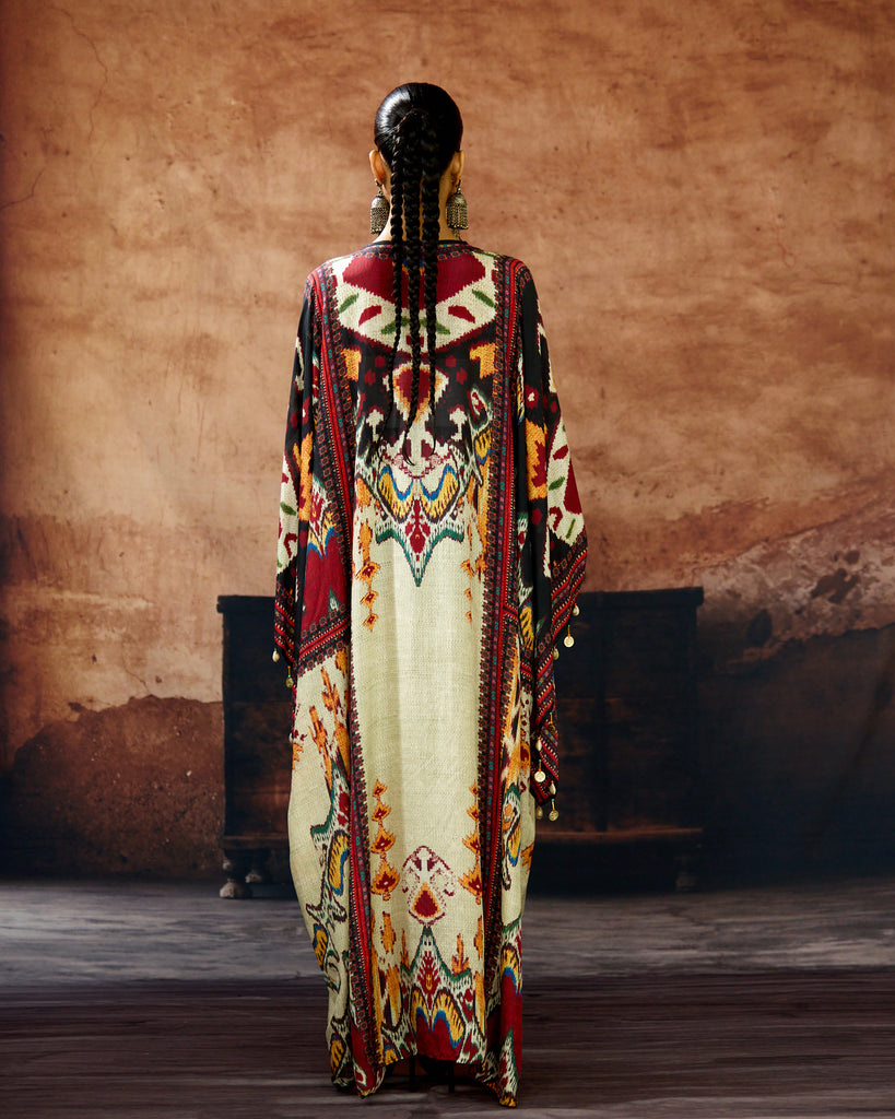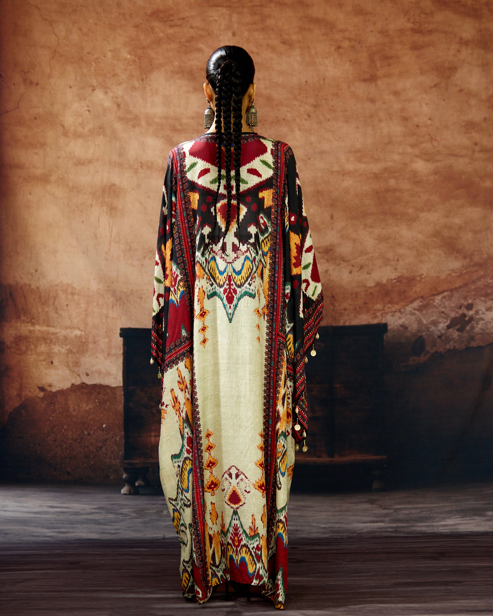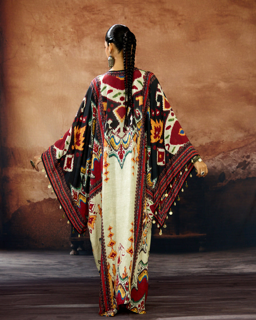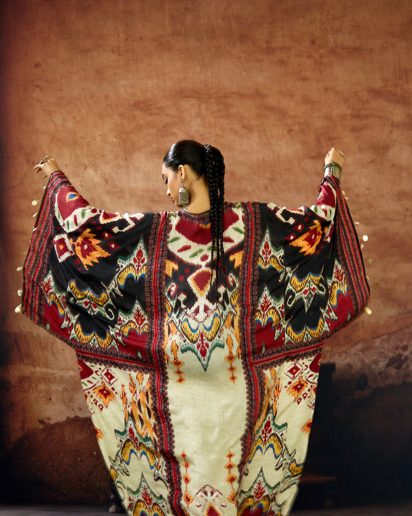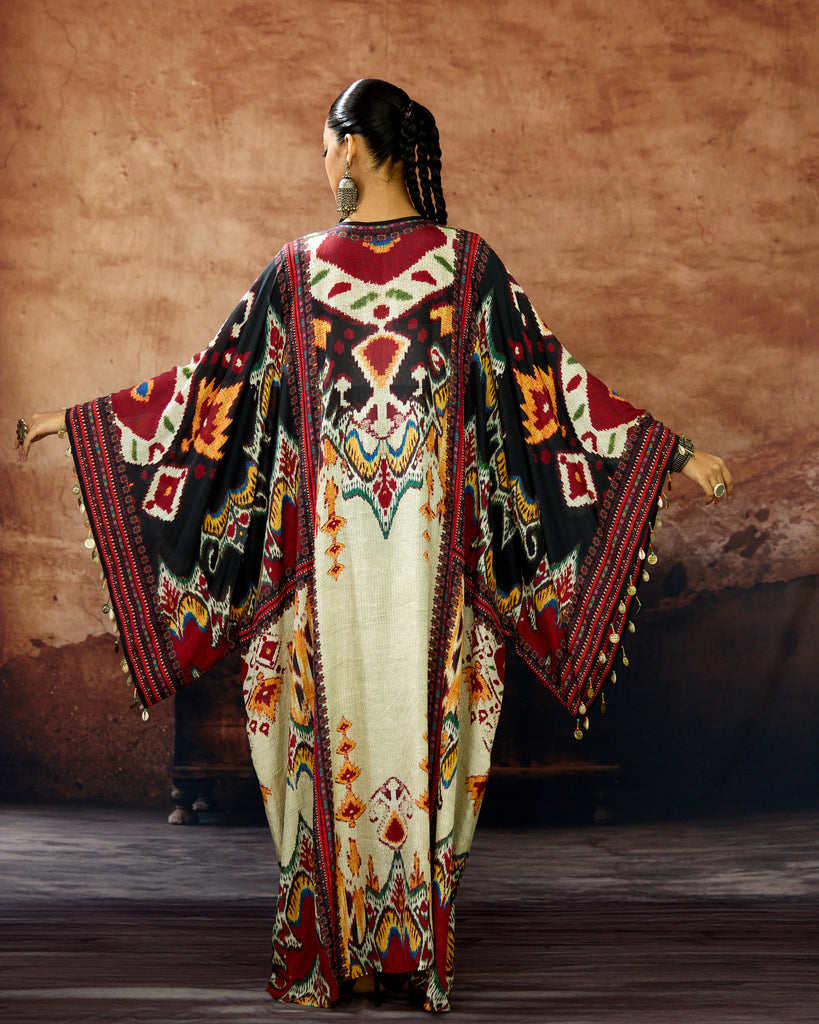 This Kaftan has straight boxy kimono sleeves and panels on the sides.