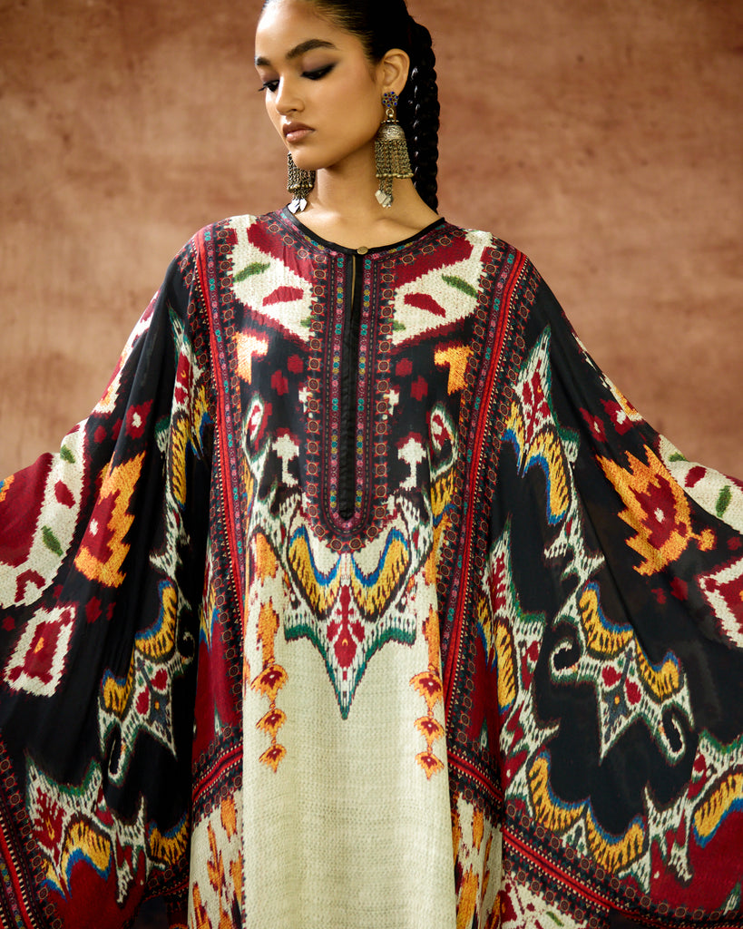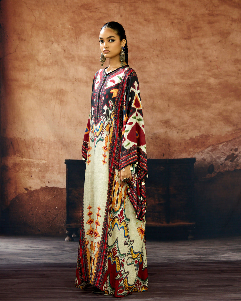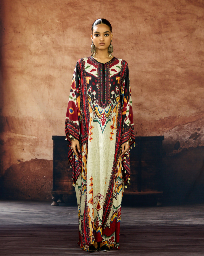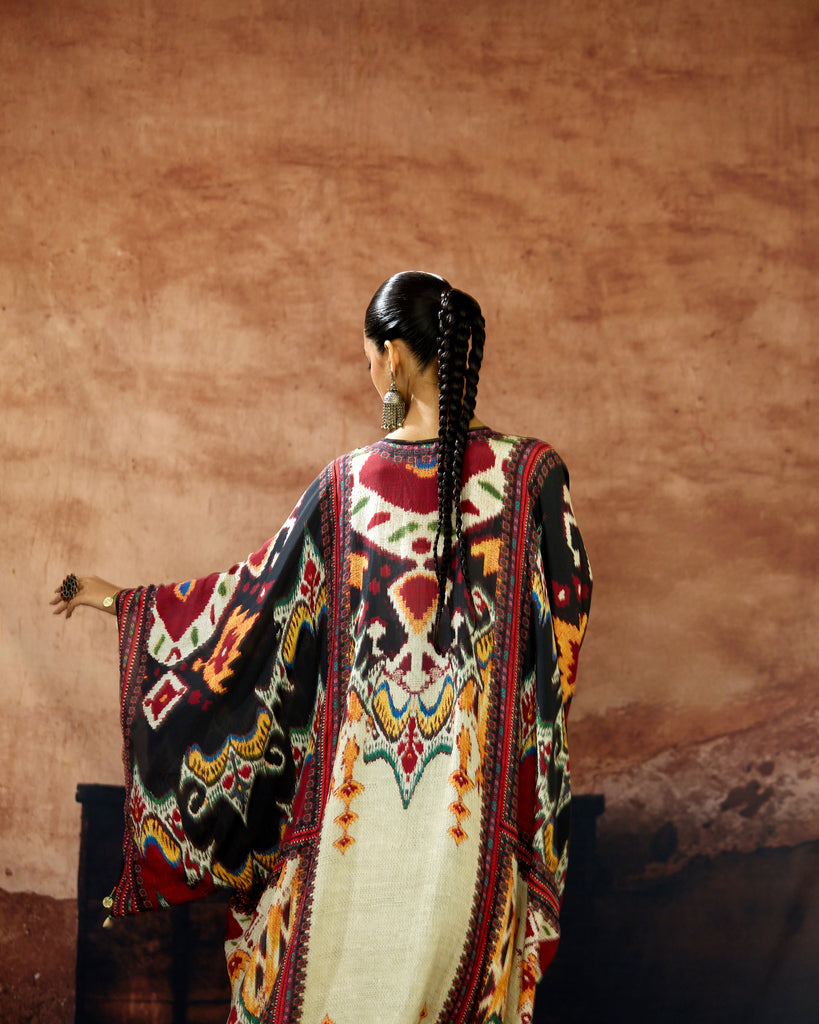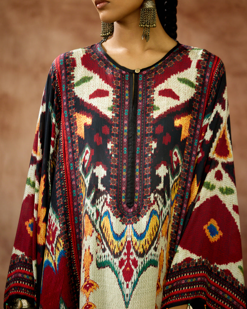 This Kaftan has straight boxy kimono sleeves and panels on the sides.