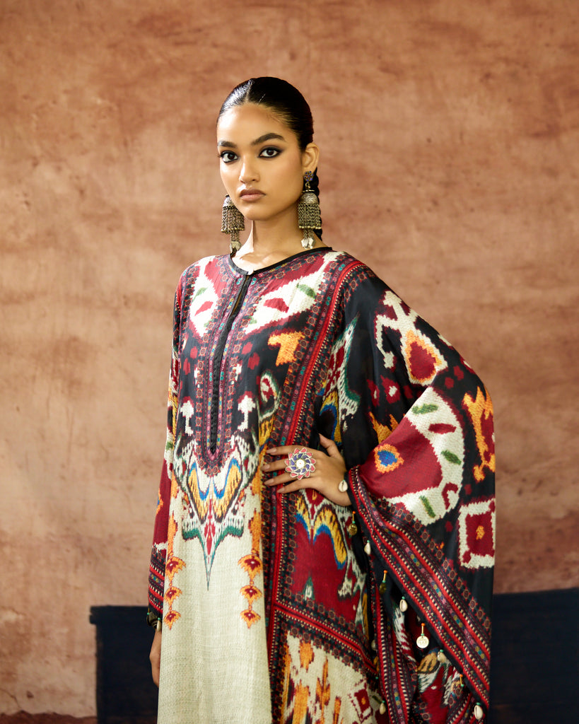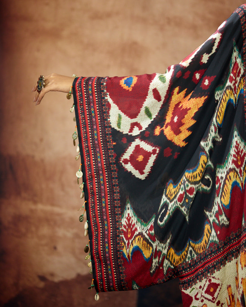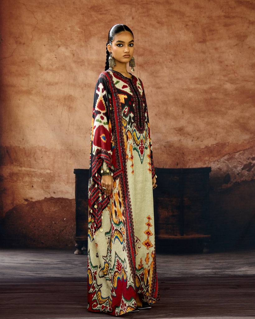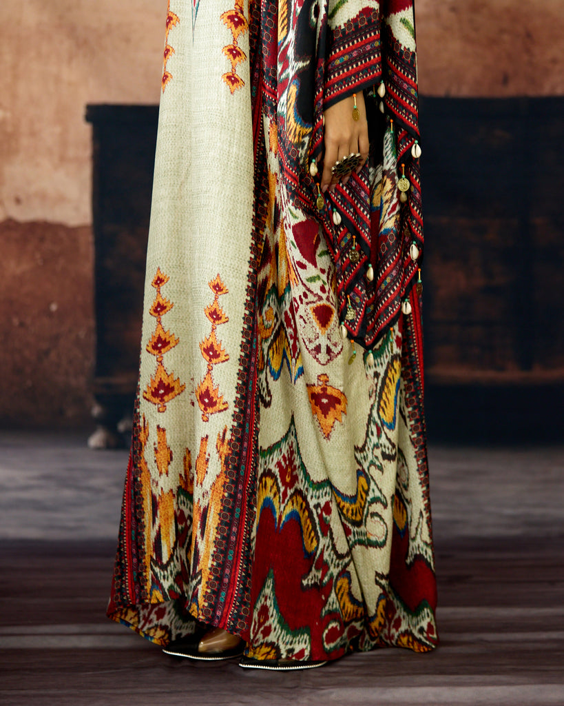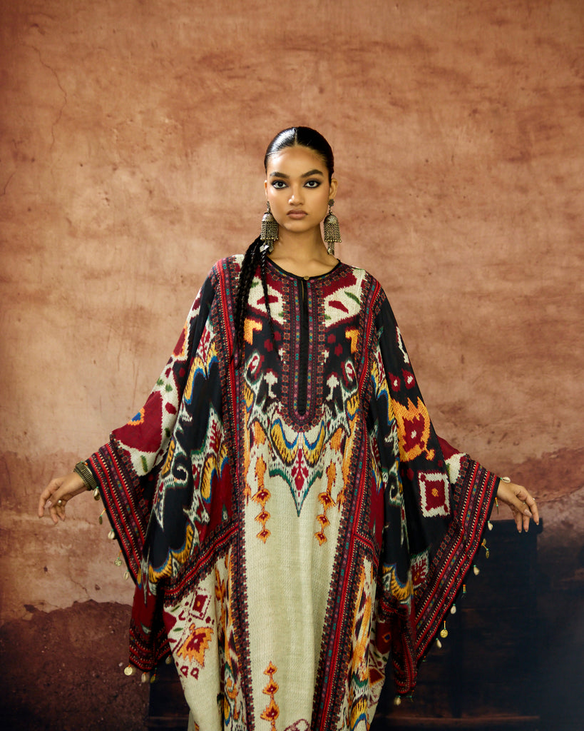 This Kaftan has straight boxy kimono sleeves and panels on the sides.