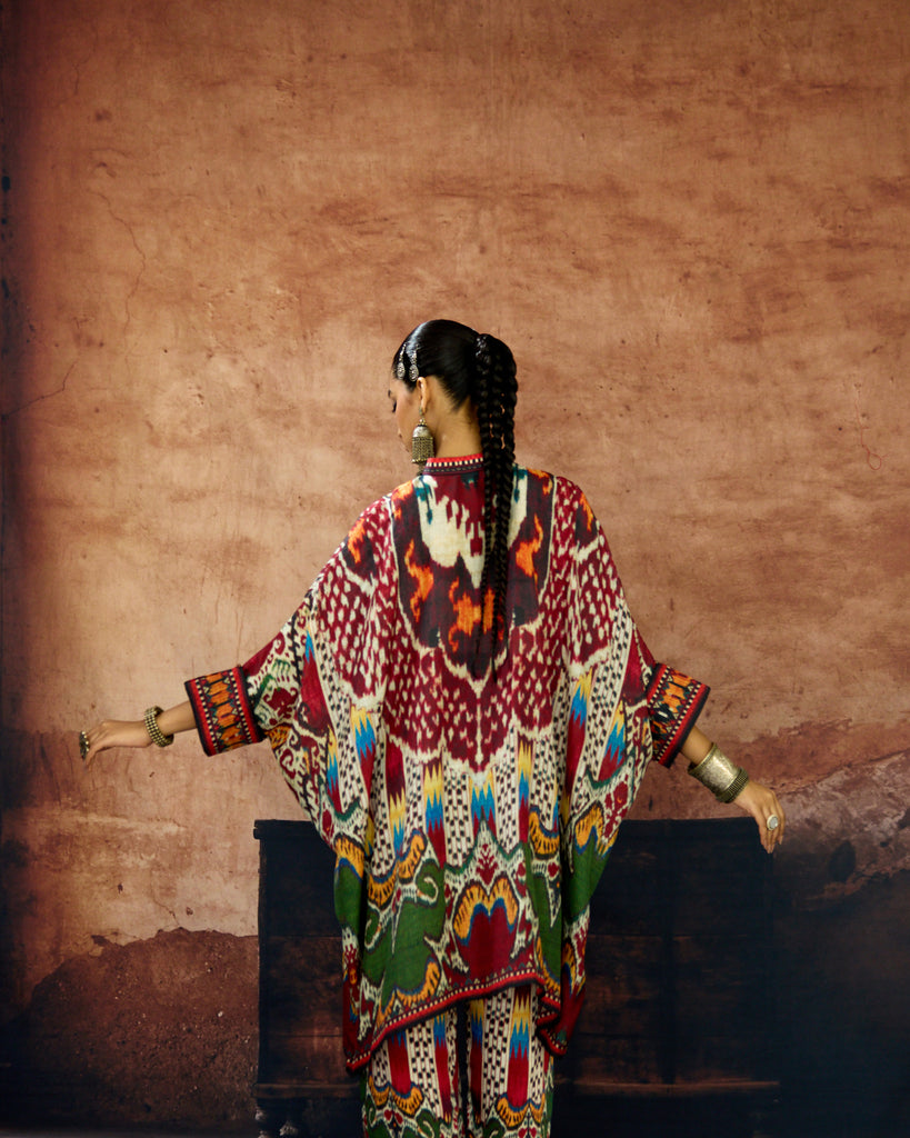 It has drop sleeves with folded cuffs and a comfortable wide flare that drops on the sides as a drape.