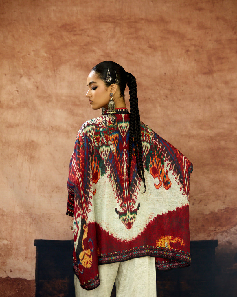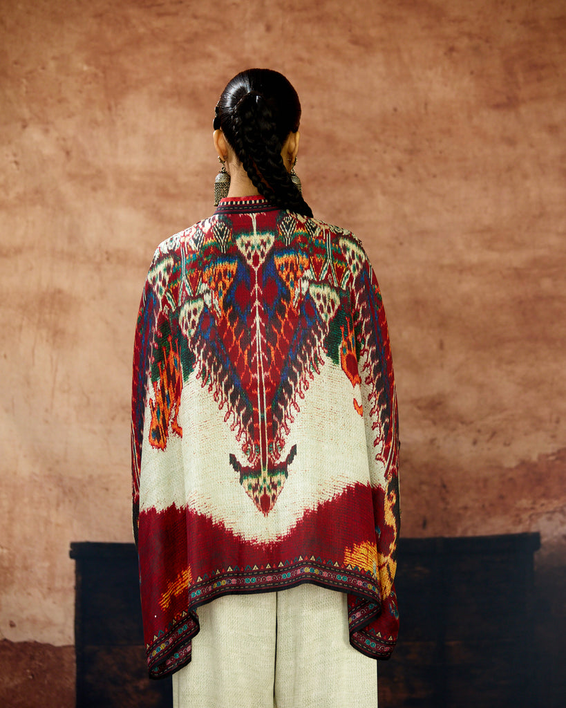 It has drop sleeves with folded cuffs and a comfortable wide flare that drops on the sides as a drape.
