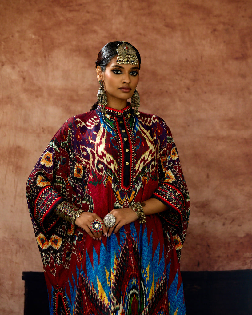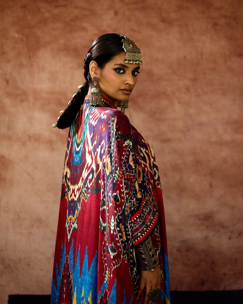 It has drop sleeves with folded cuffs and a comfortable wide flare that drops on the sides as a drape with side slits.