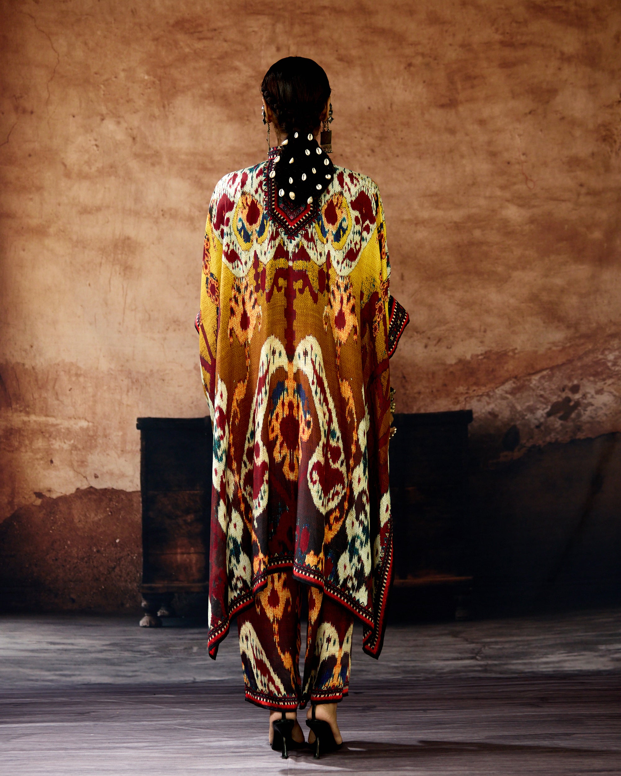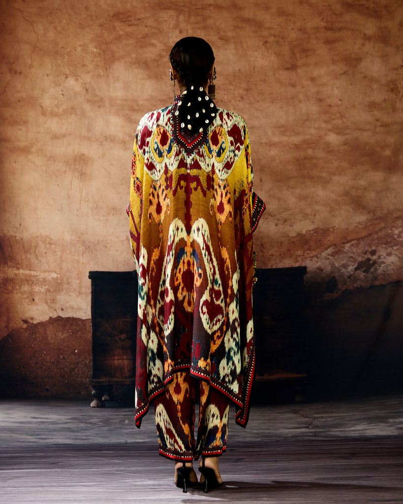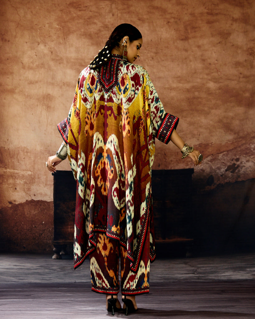 It has drop sleeves with folded cuffs and a comfortable wide flare that drops on the sides as a drape with side slits.