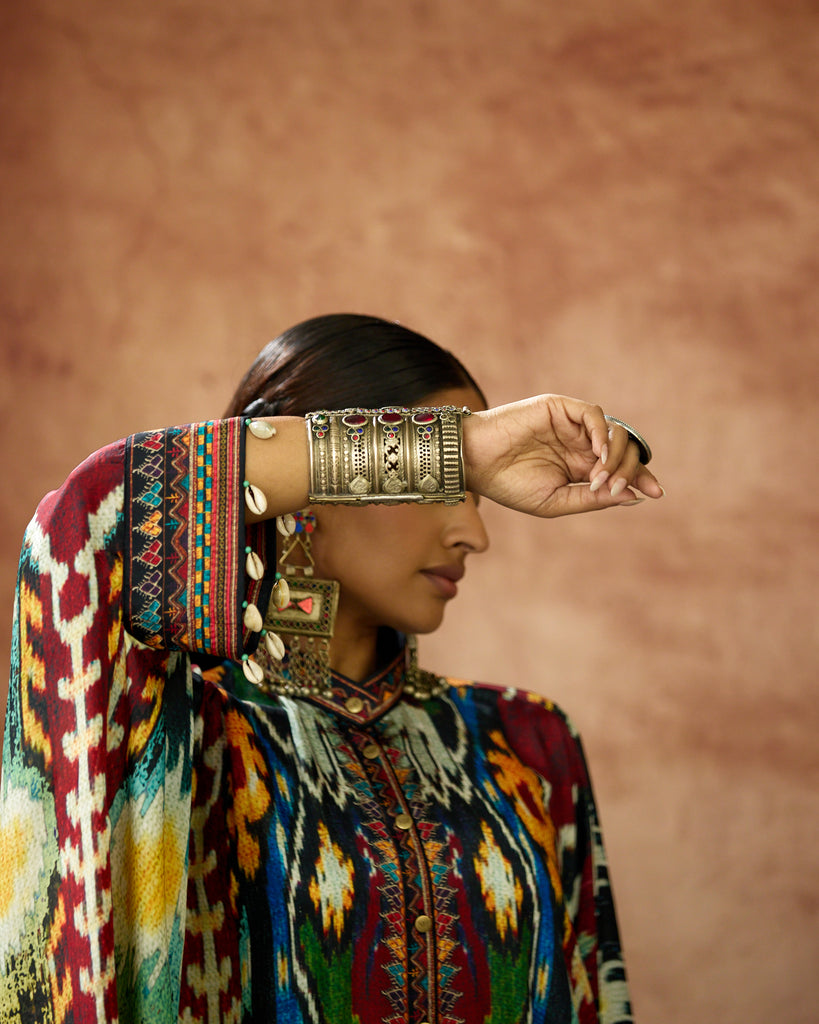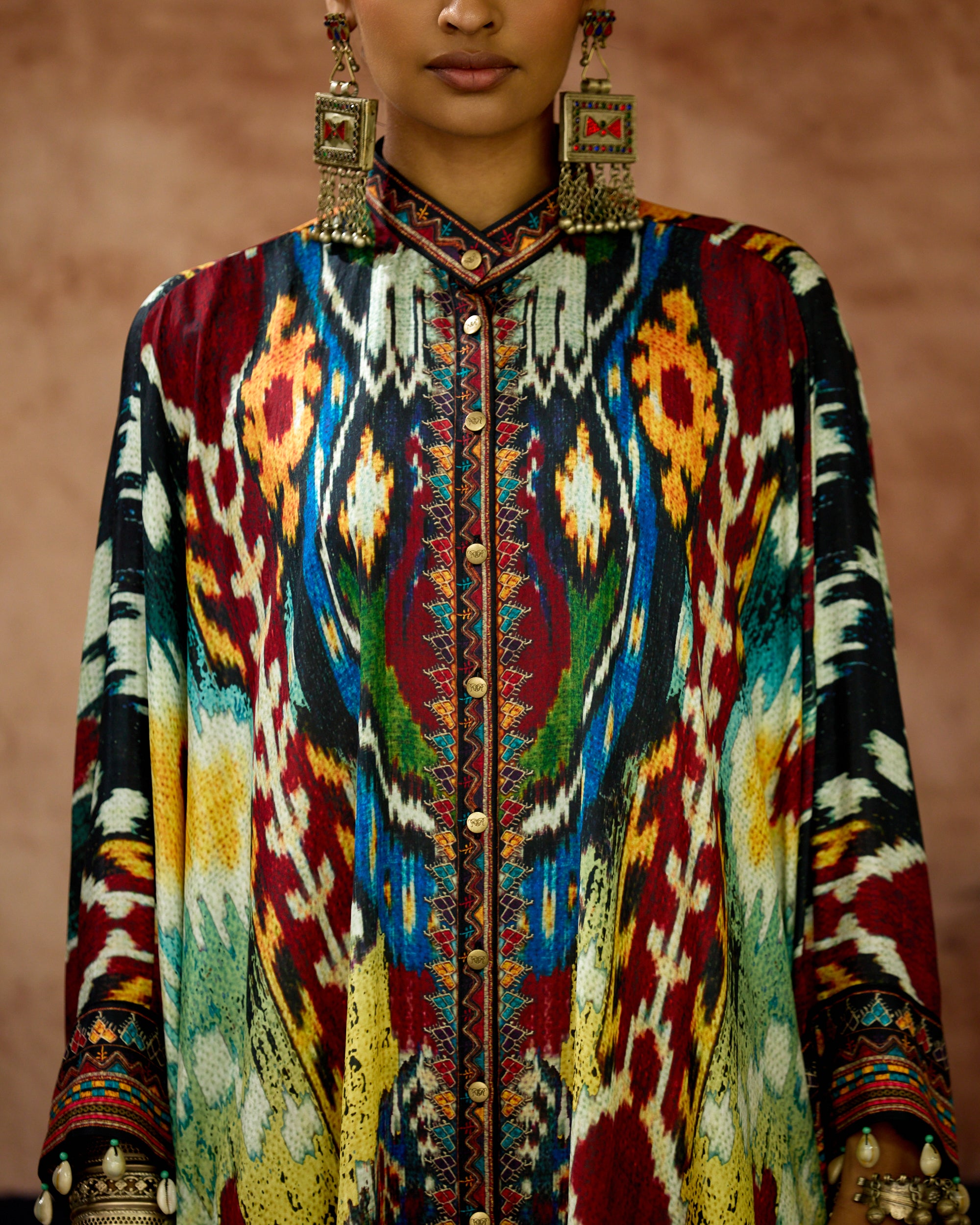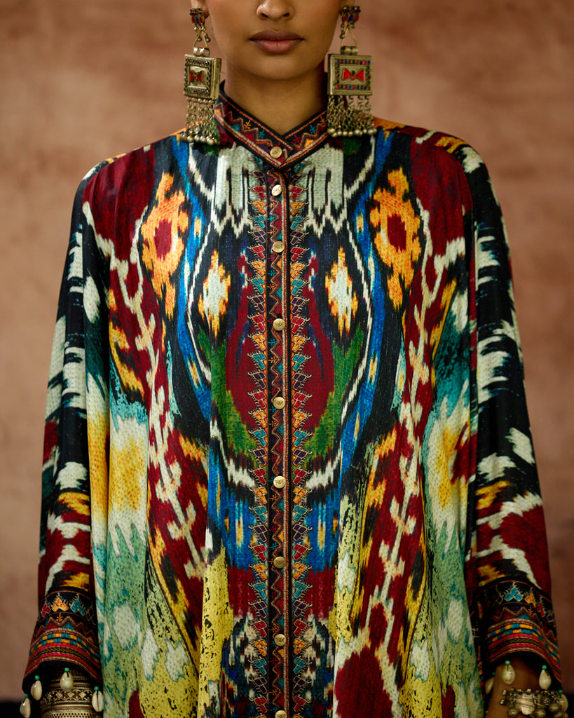 A printed silk kaftan tunic shirt with cuffs and button front placket.