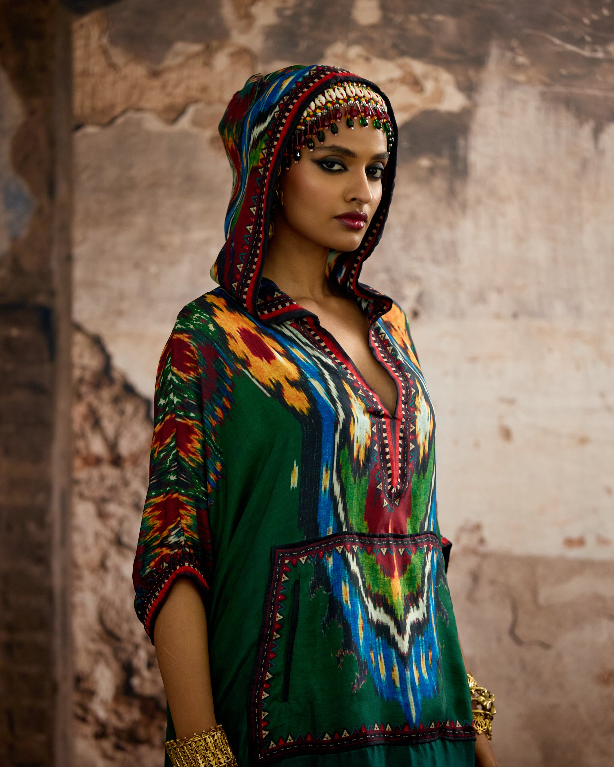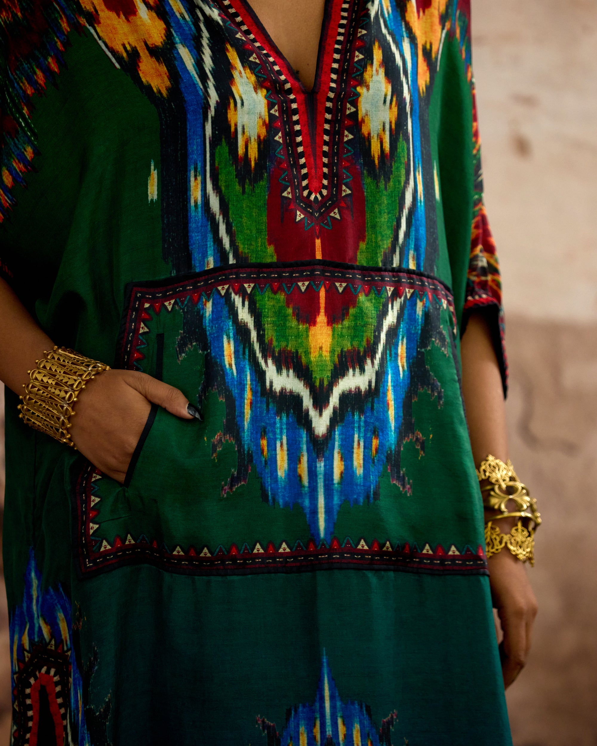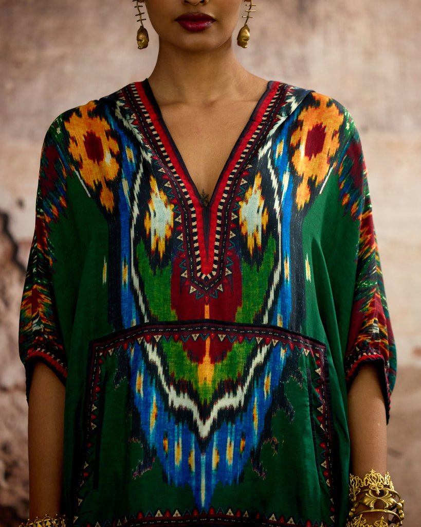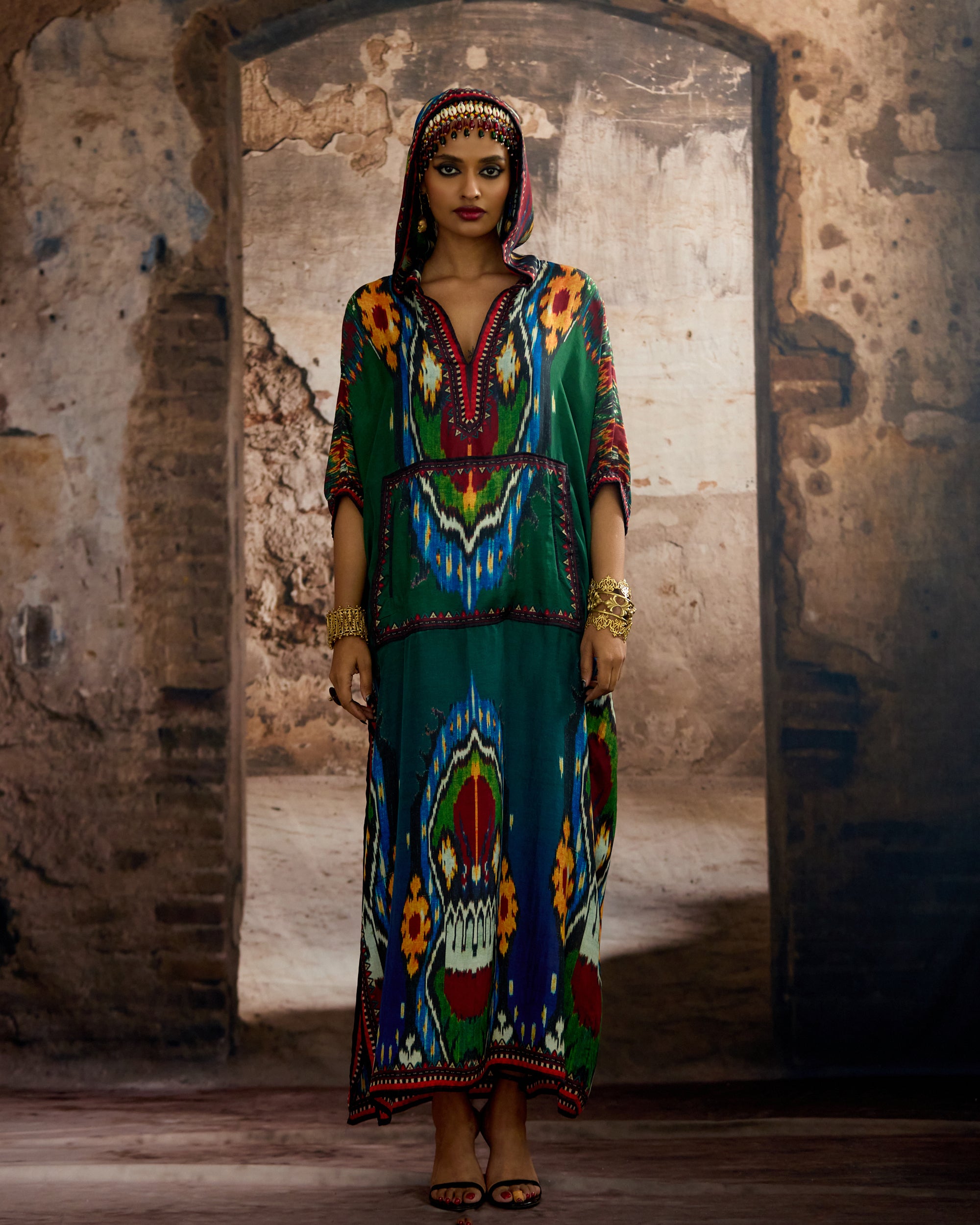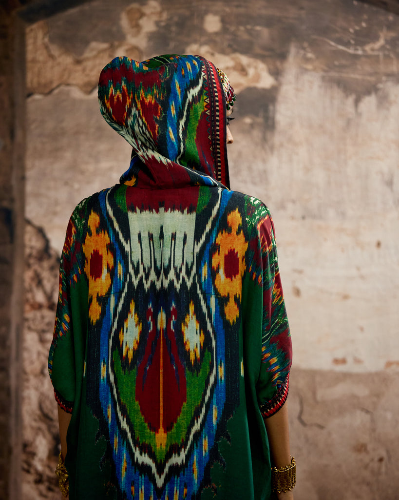 The Habiba kaftan is a wispy and a sporty version of our silk kaftan with an attached silk hood and front pockets on the waist. The kaftan has kimono sleeves with an elastic hem and a side slit on the left.