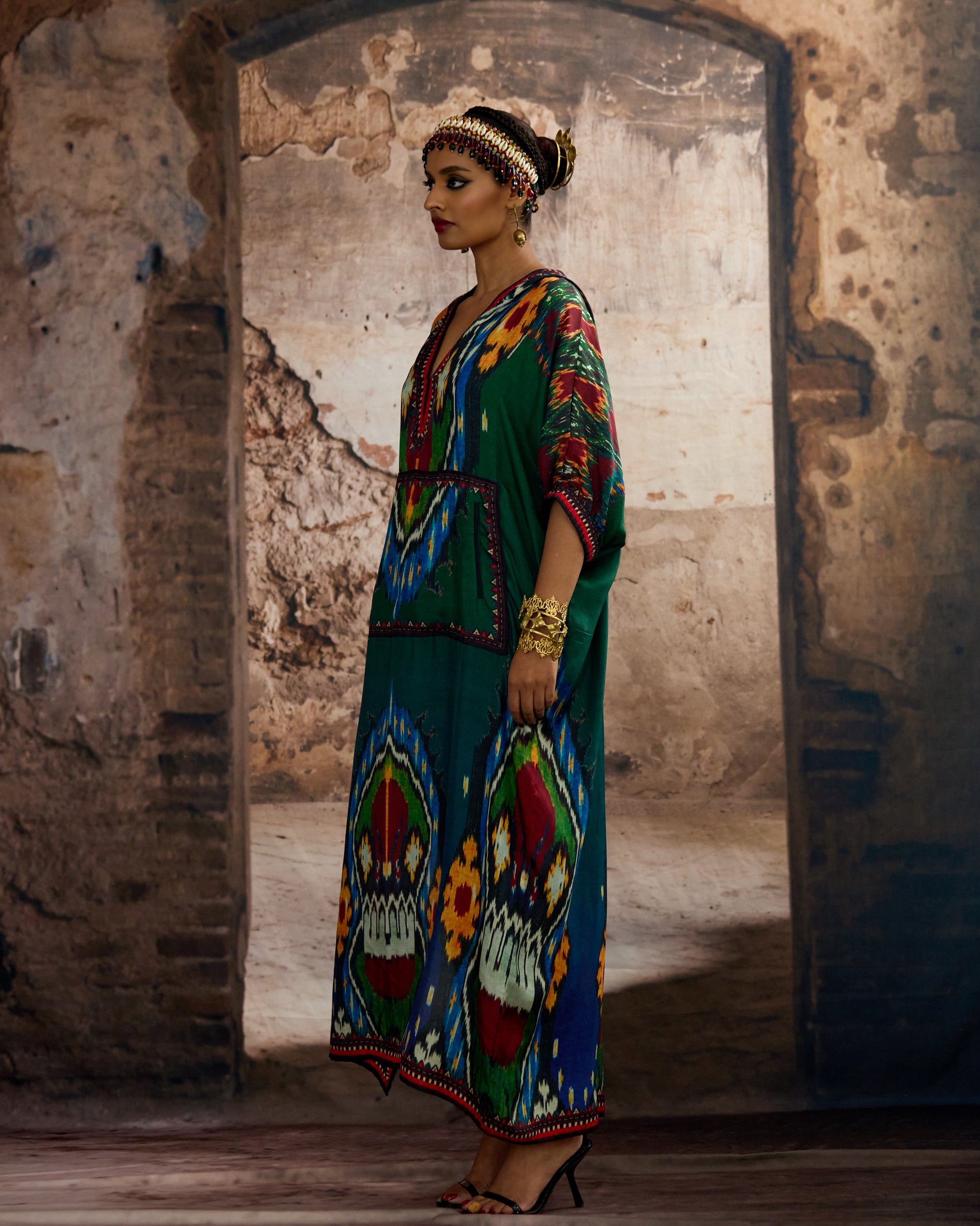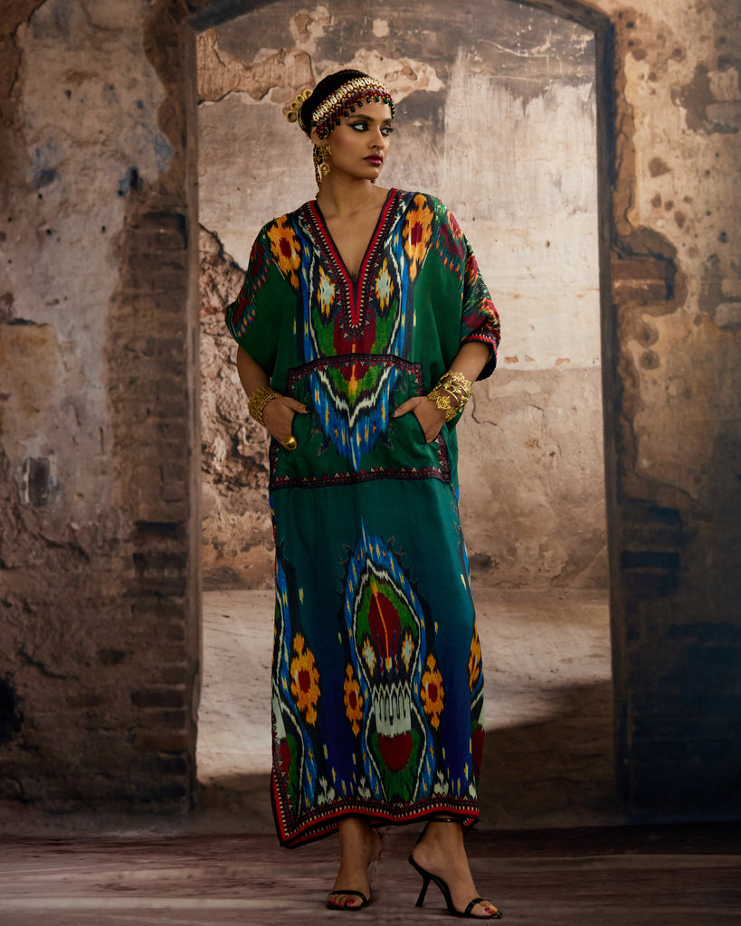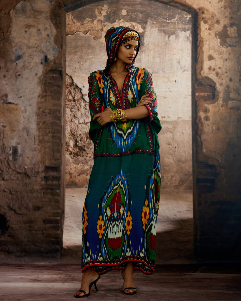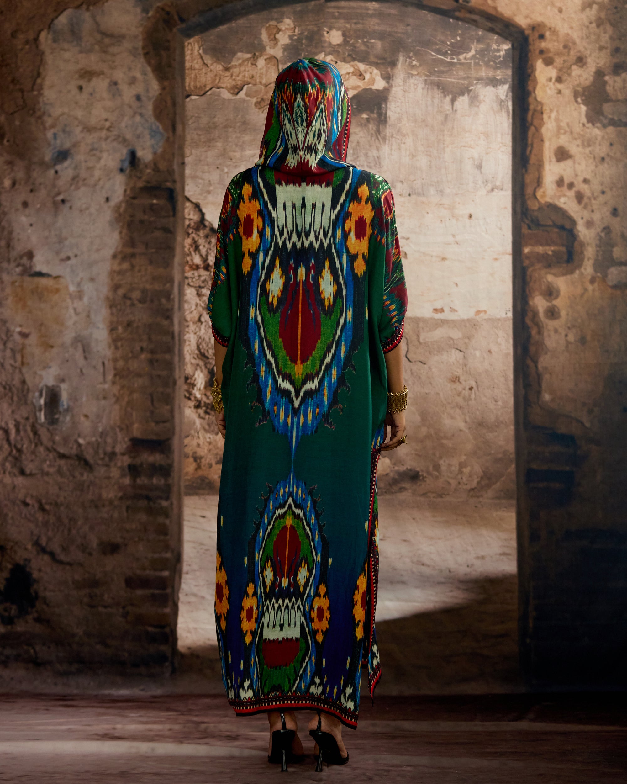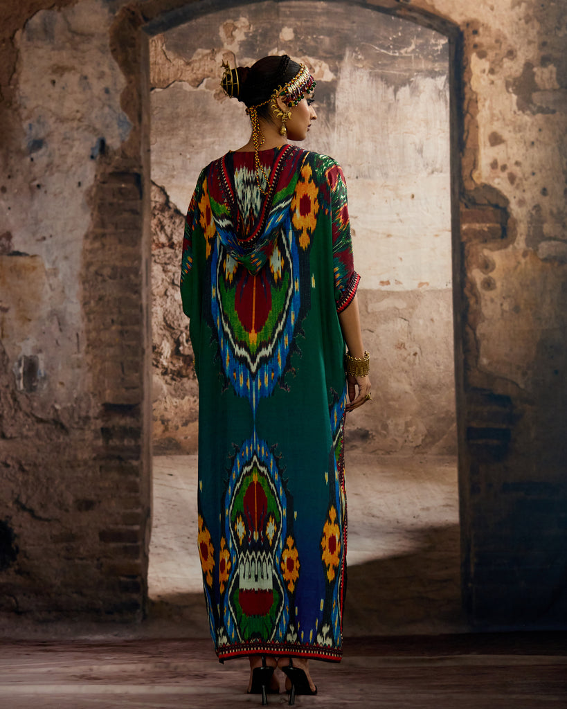 The Habiba kaftan is a wispy and a sporty version of our silk kaftan with an attached silk hood and front pockets on the waist. The kaftan has kimono sleeves with an elastic hem and a side slit on the left.