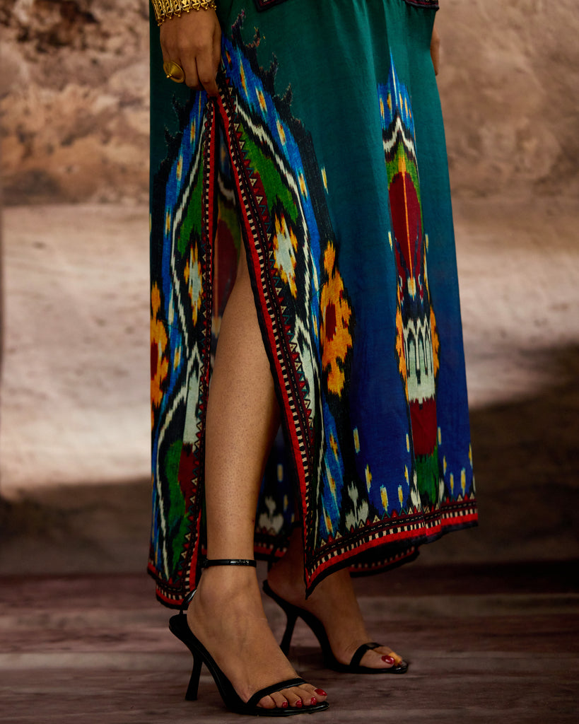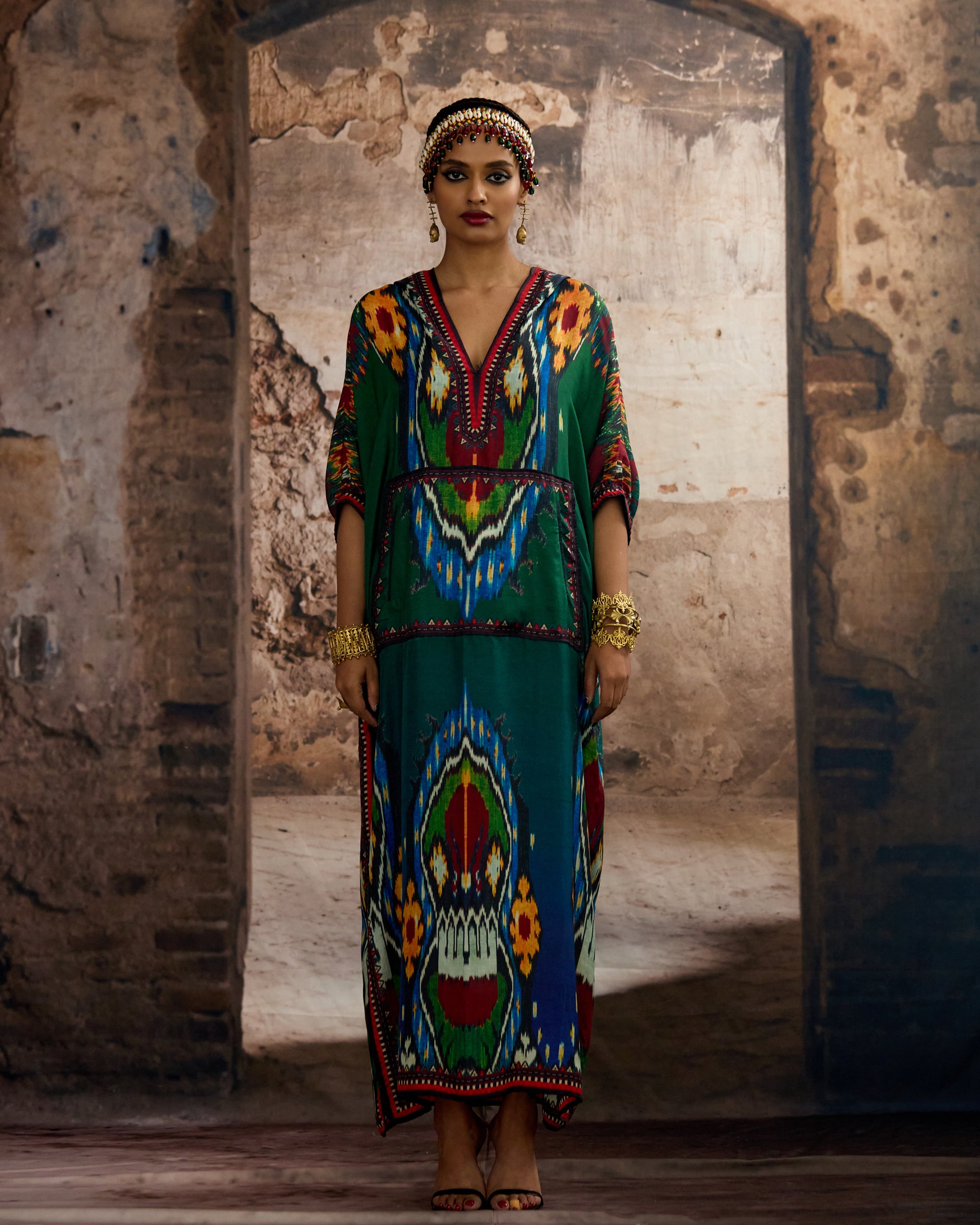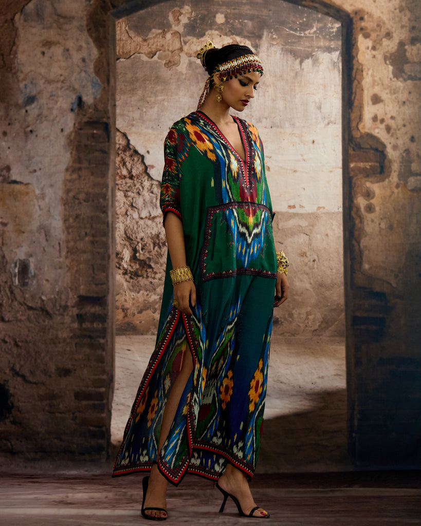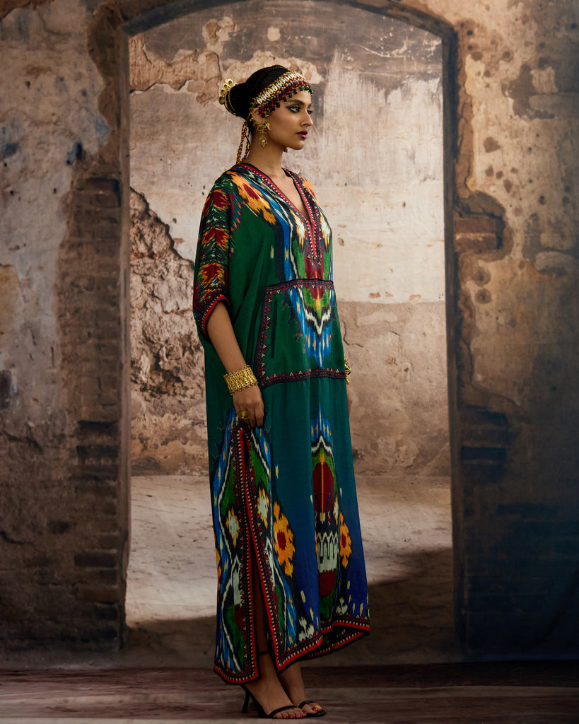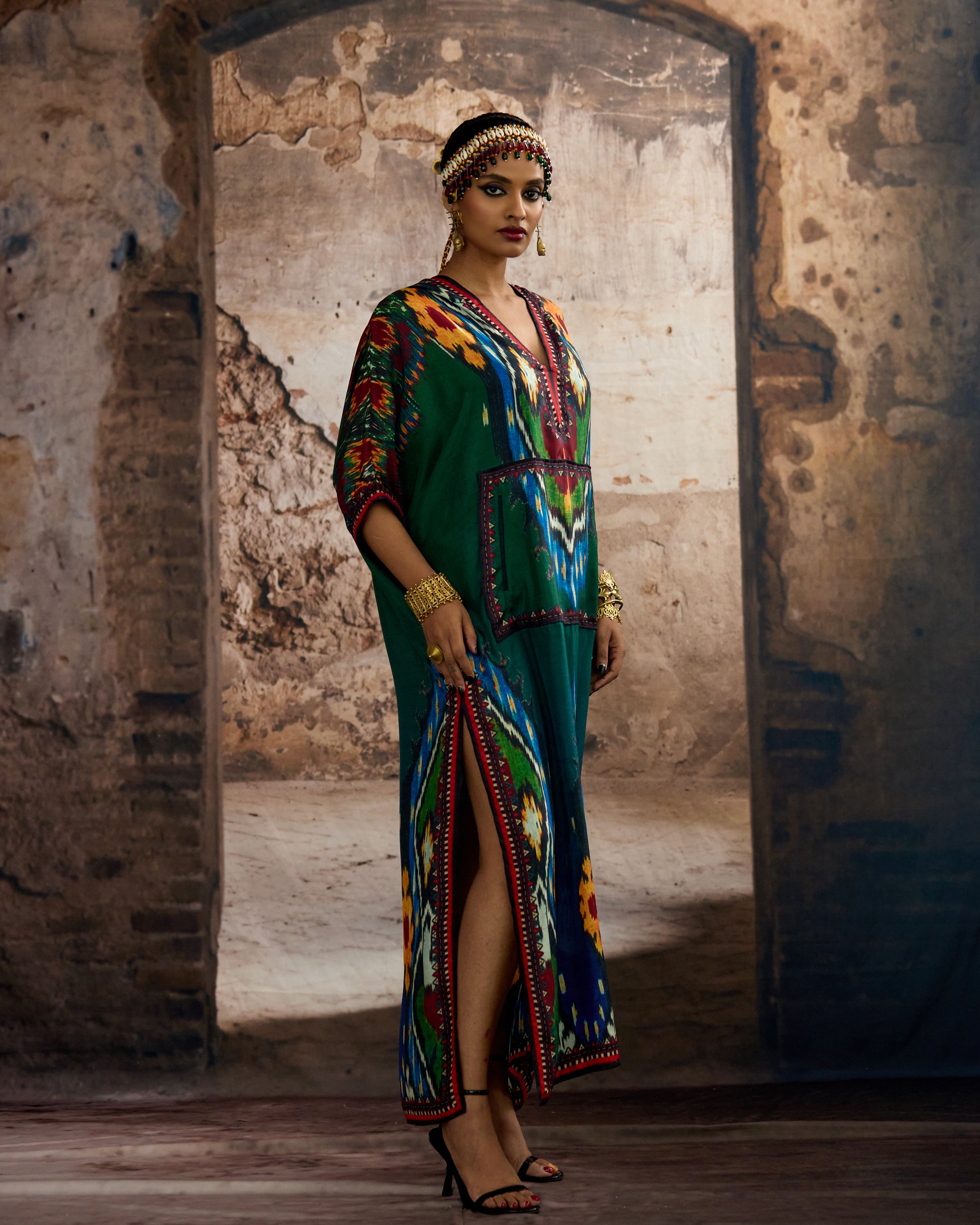 The Habiba kaftan is a wispy and a sporty version of our silk kaftan with an attached silk hood and front pockets on the waist. The kaftan has kimono sleeves with an elastic hem and a side slit on the left.