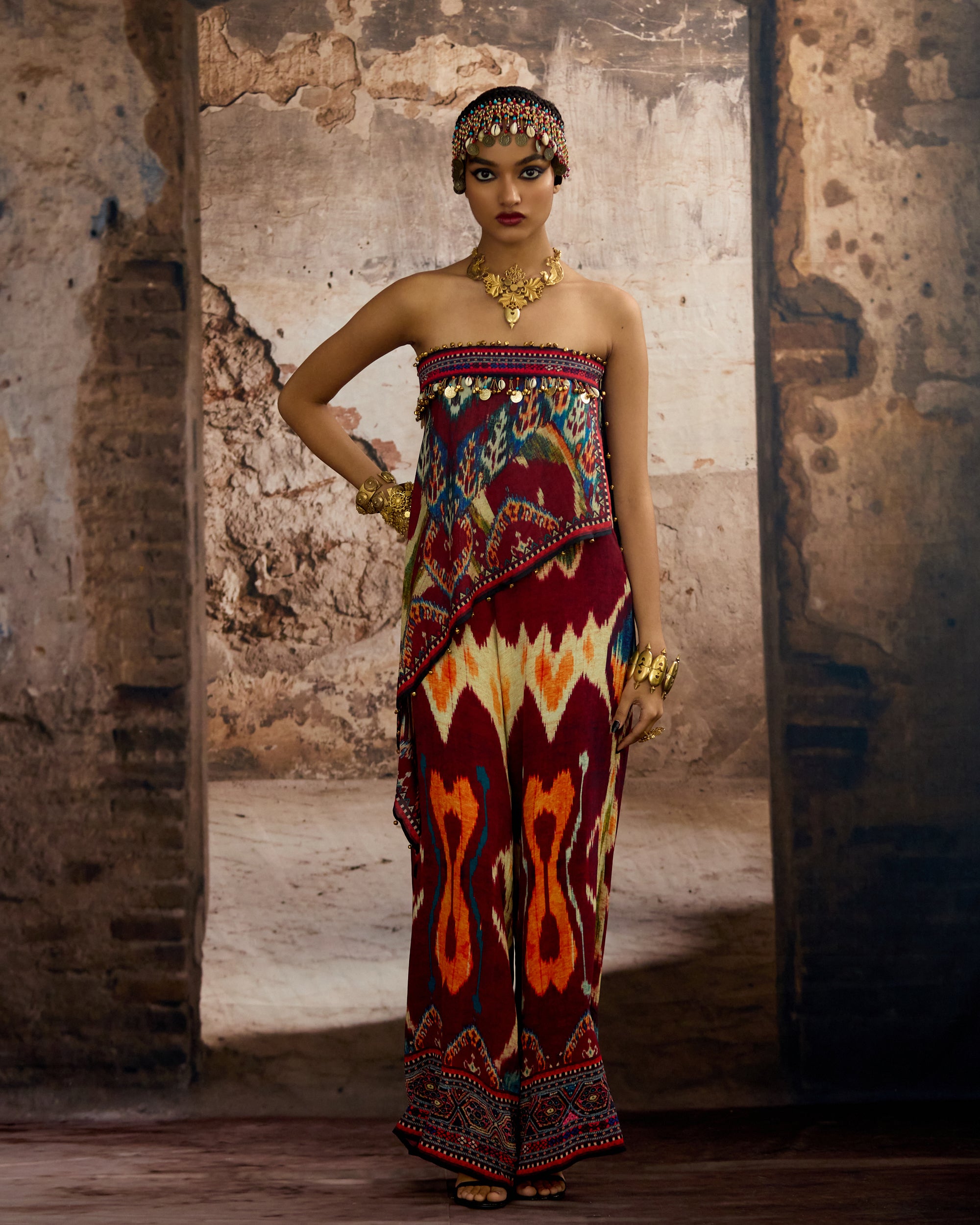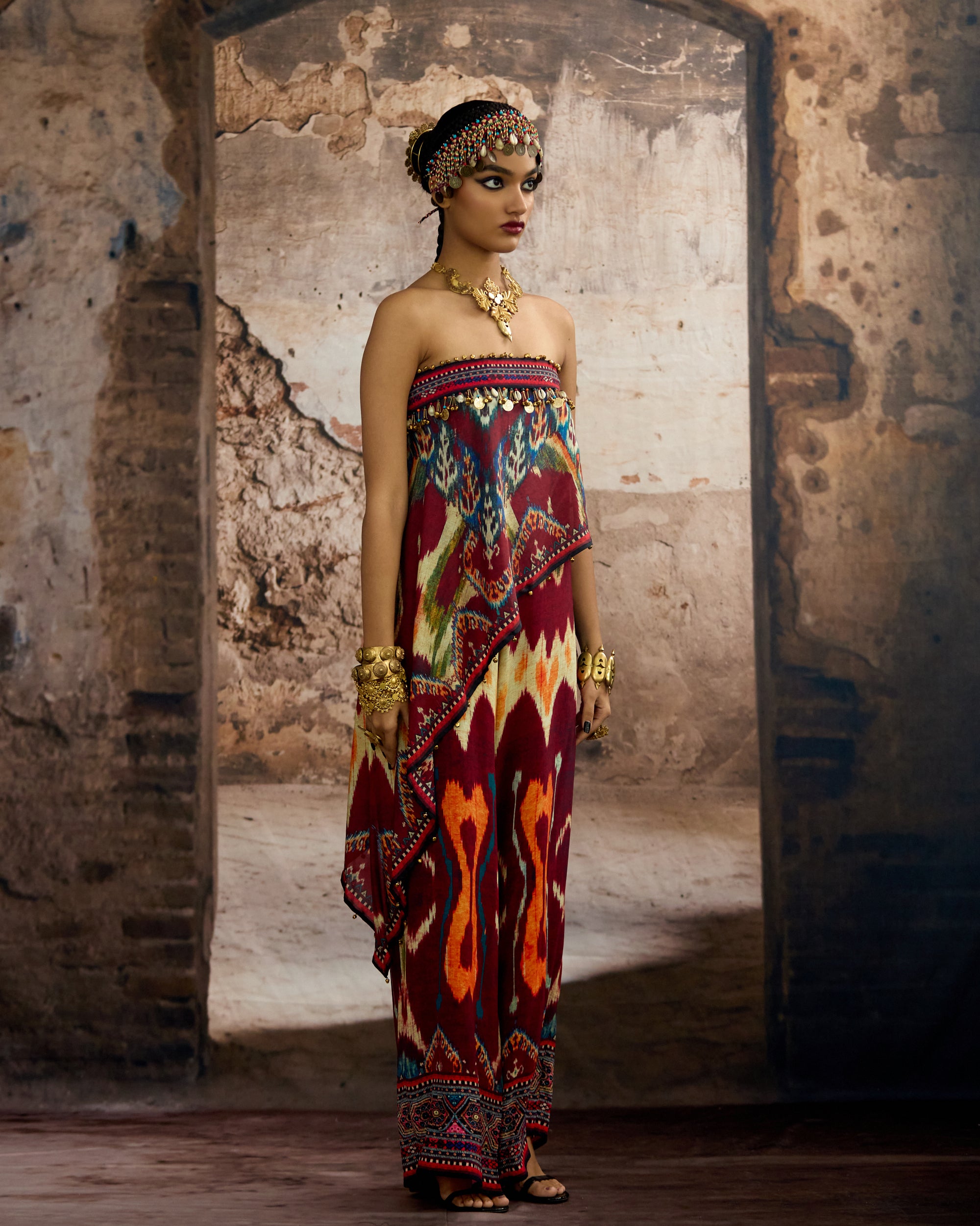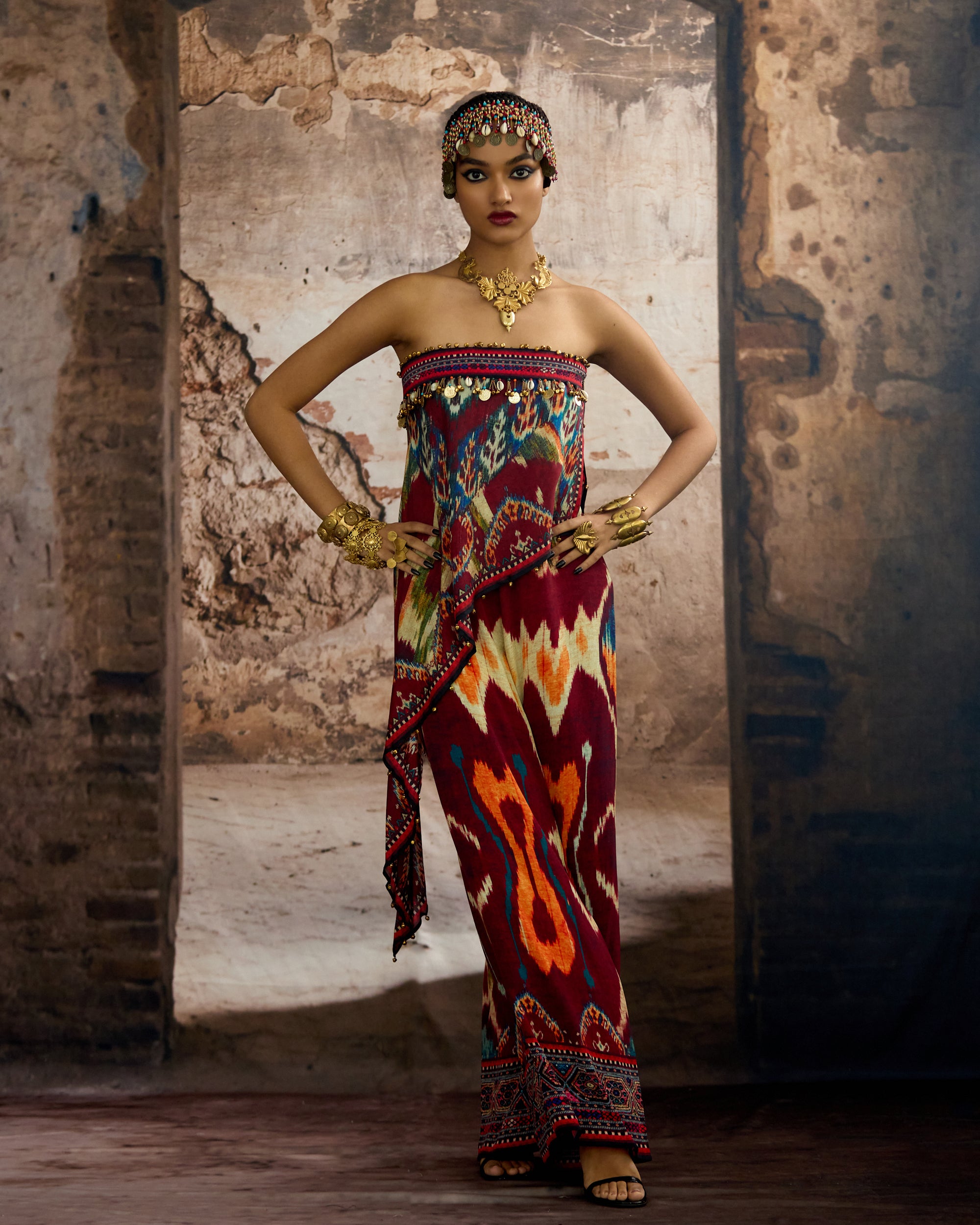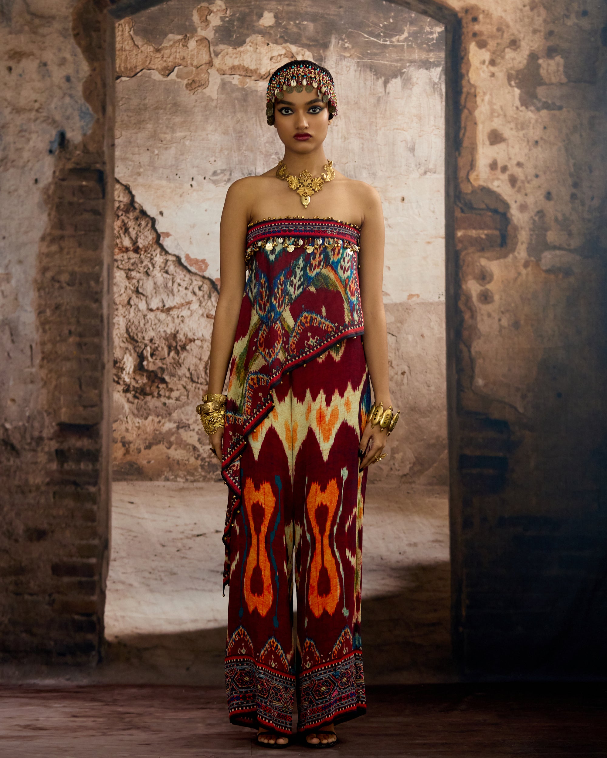 A printed strapless jumpsuit with an elasticated back. The Jumpsuit has a front drape layer which is asymmetric.