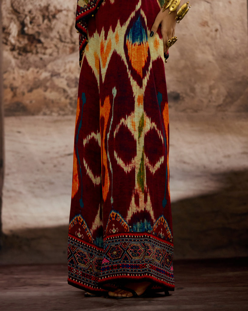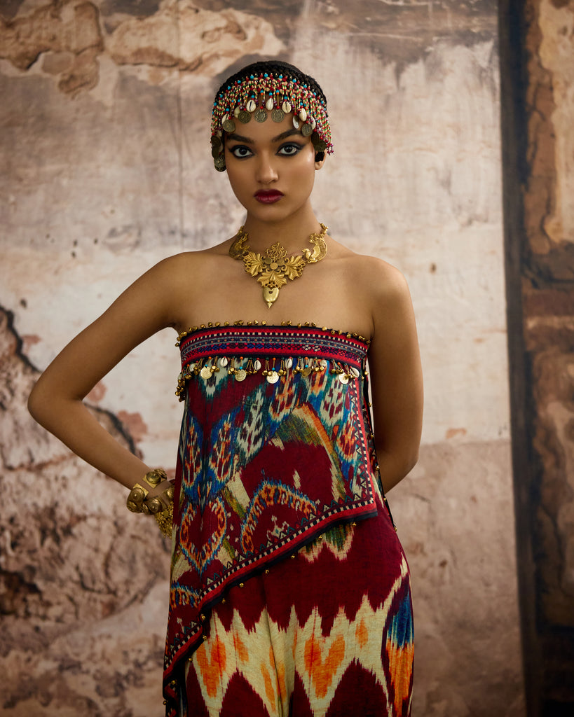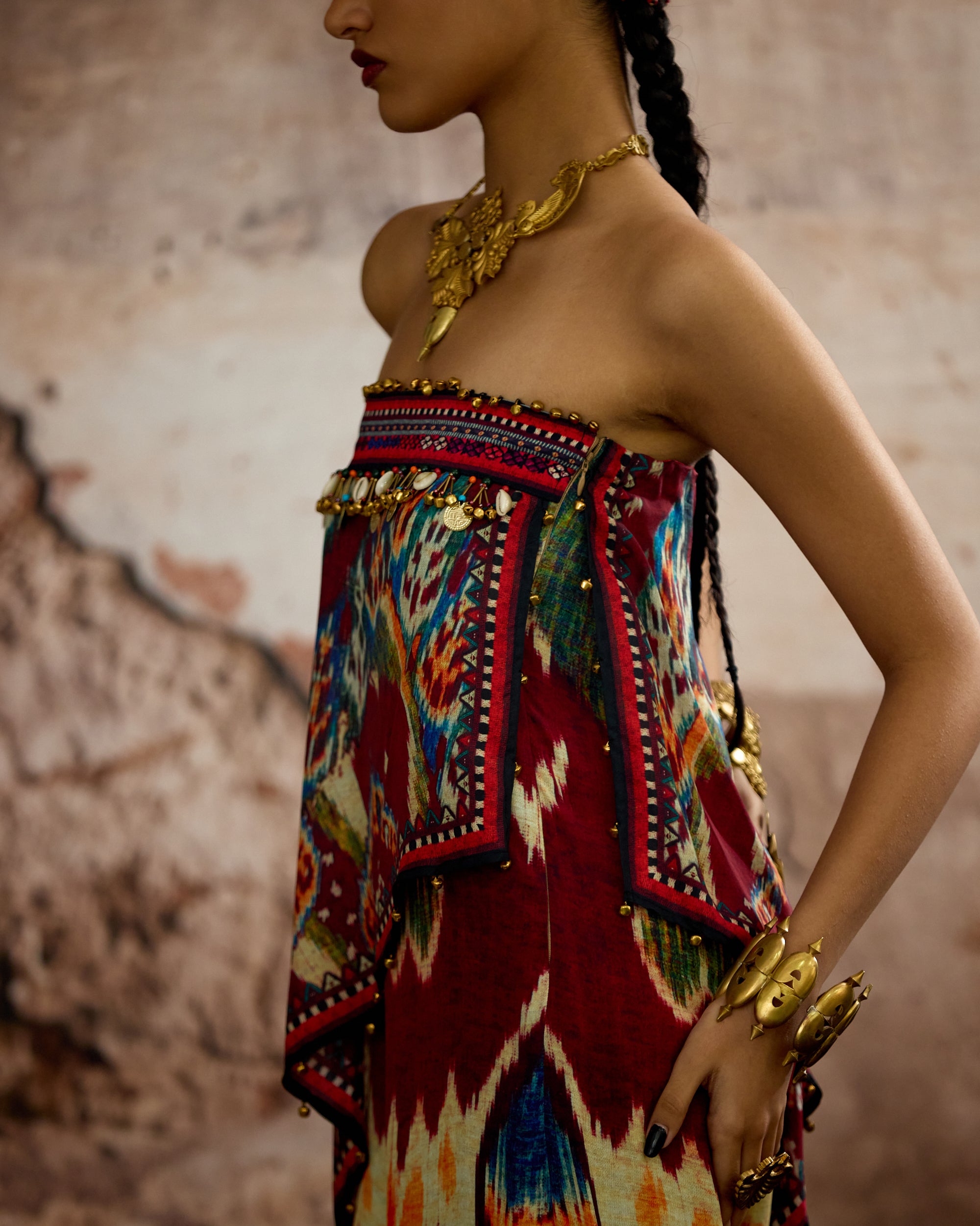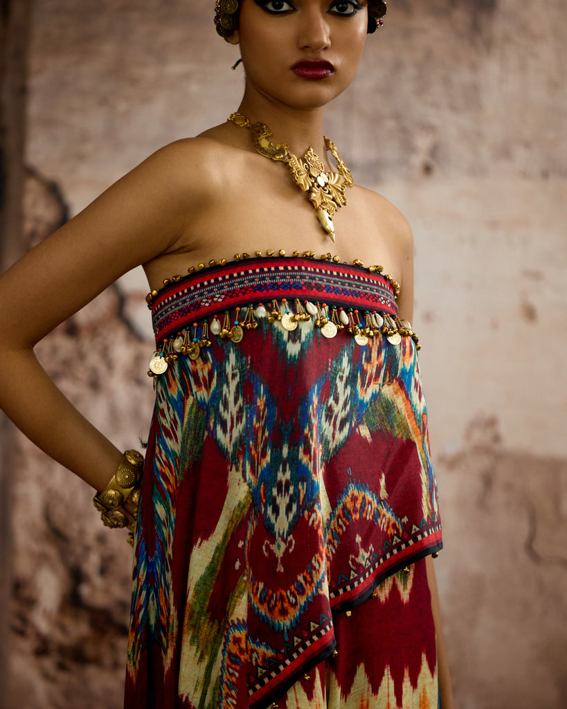 A printed strapless jumpsuit with an elasticated back. The Jumpsuit has a front drape layer which is asymmetric.