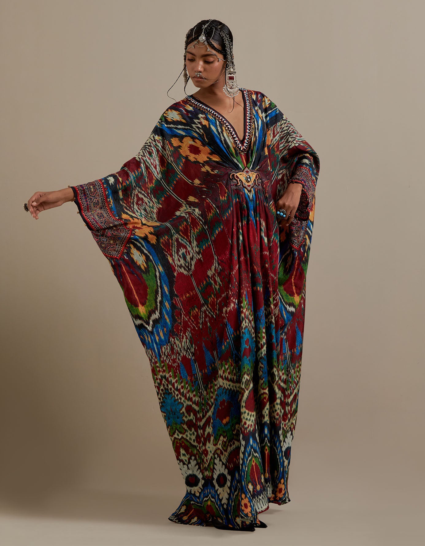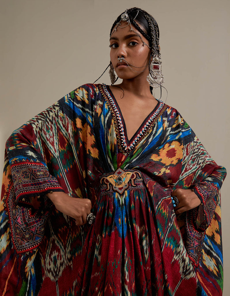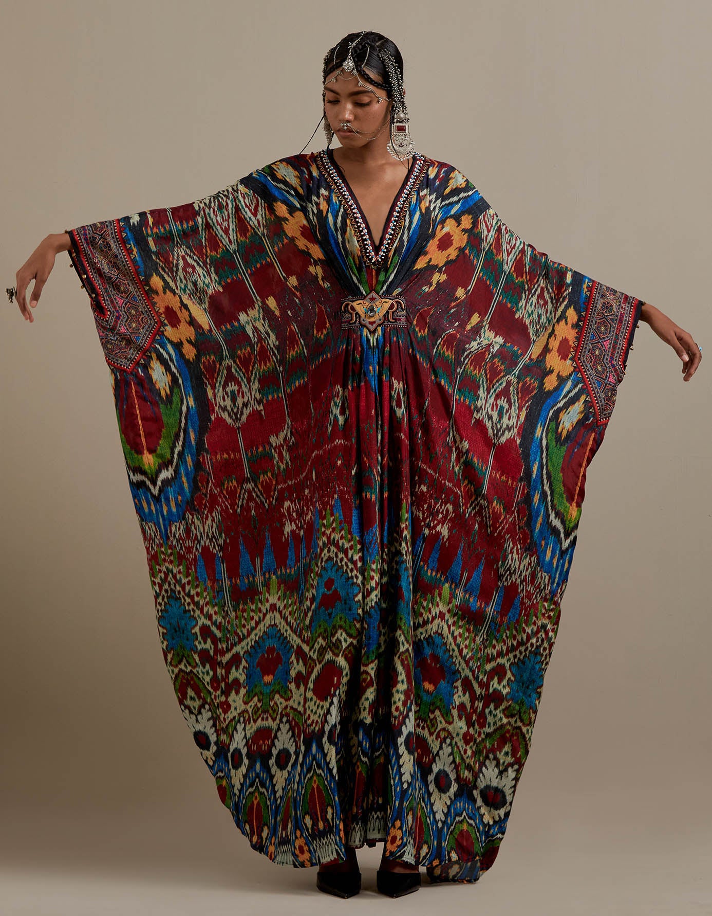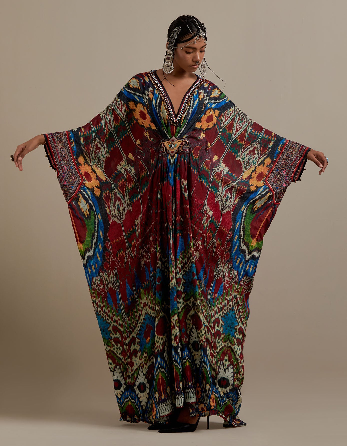 A Printed Silk kaftan dress with a belted empire, embroidered with our insignia broach and Swarovski crystals.