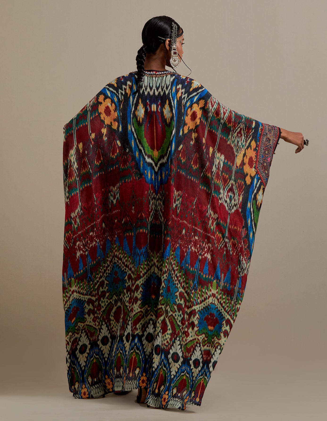 The belt in the kaftan is tied from inside to shape the waist and has a flared loose back.