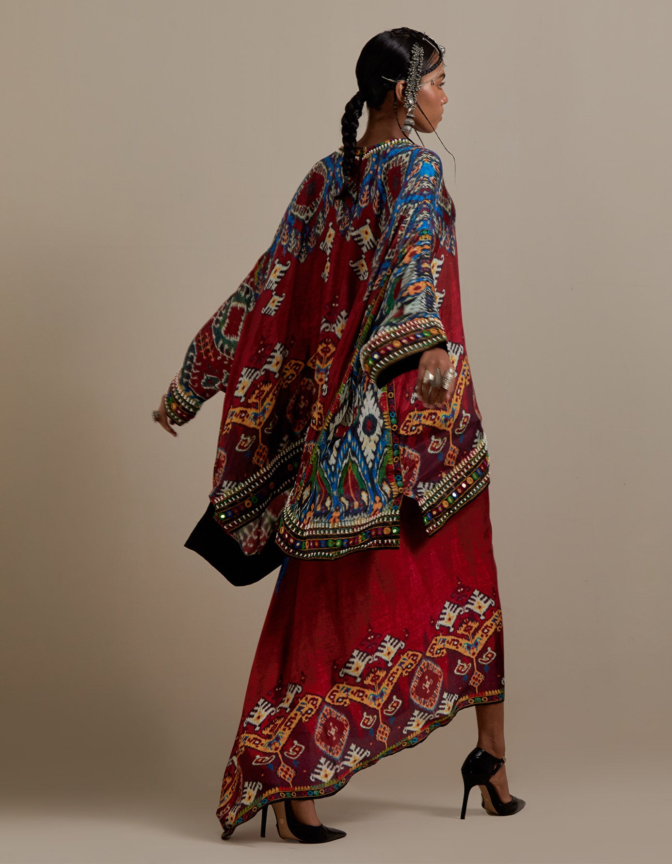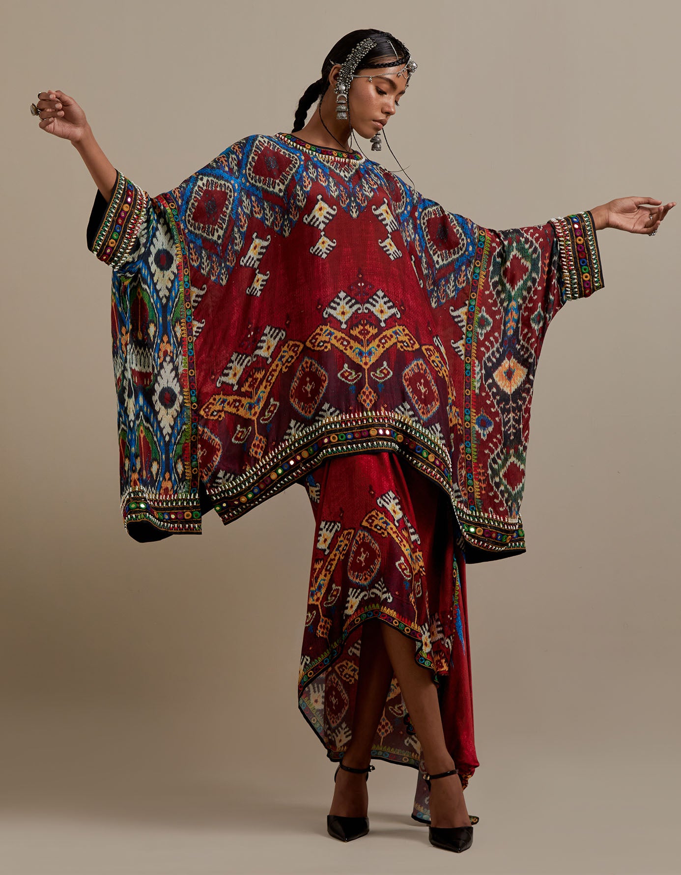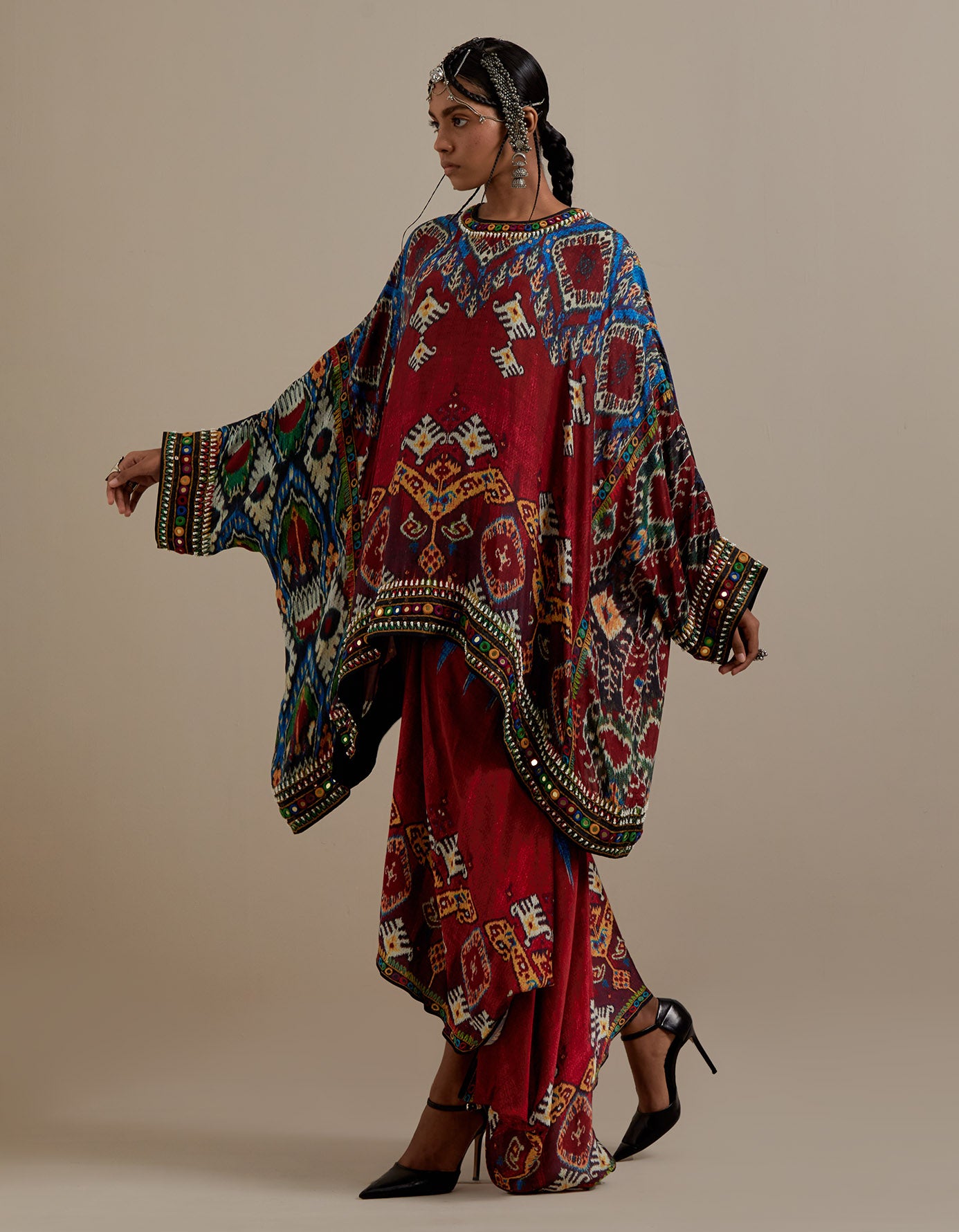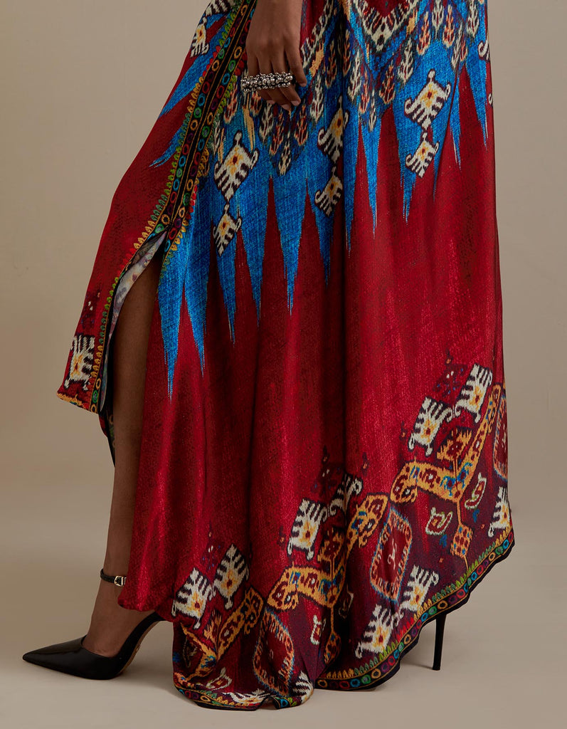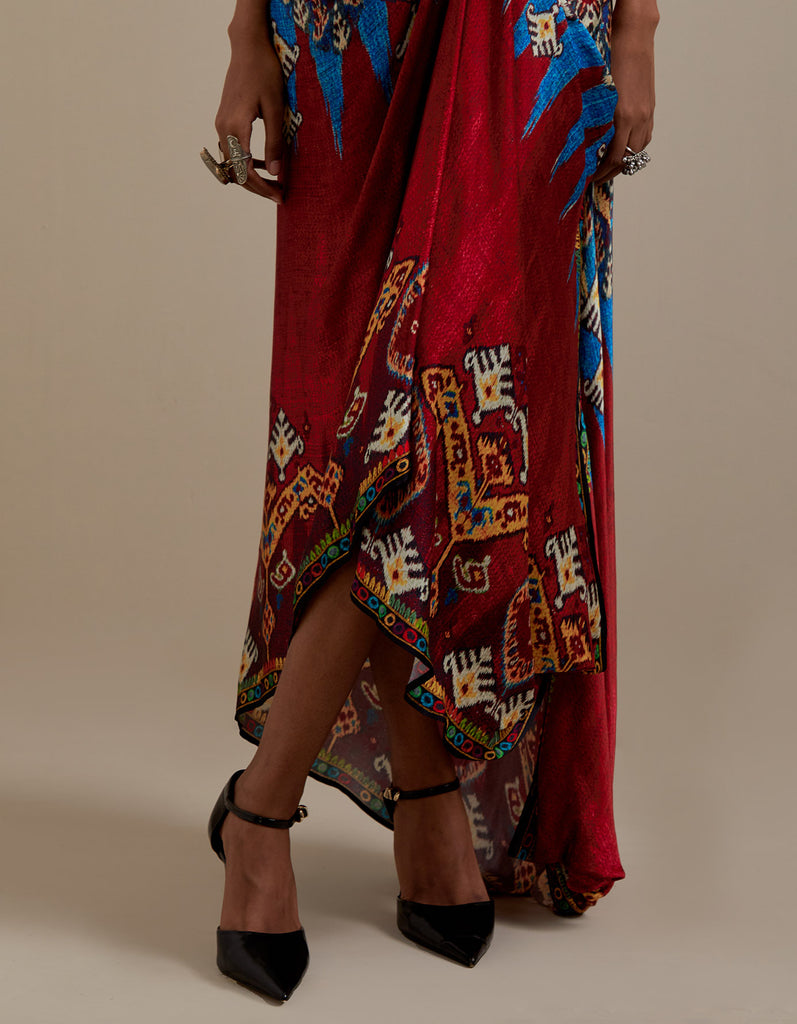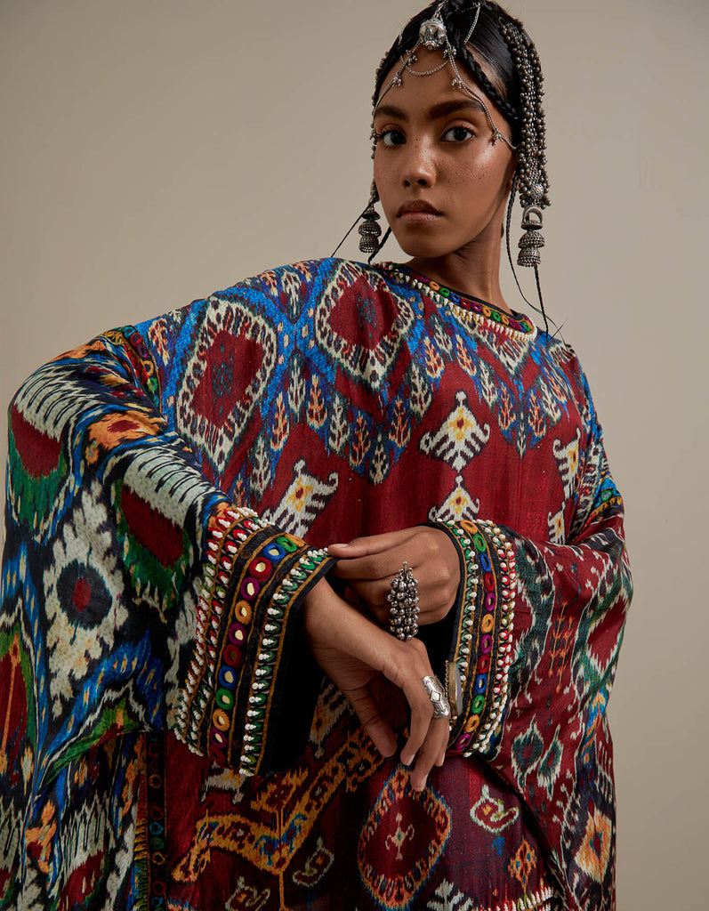 The Insha printed coordinating set has a full width tunic with a round neckline and a matching pre draped skirt with a waistband. The printed set has a timeline of about 4-5 weeks.