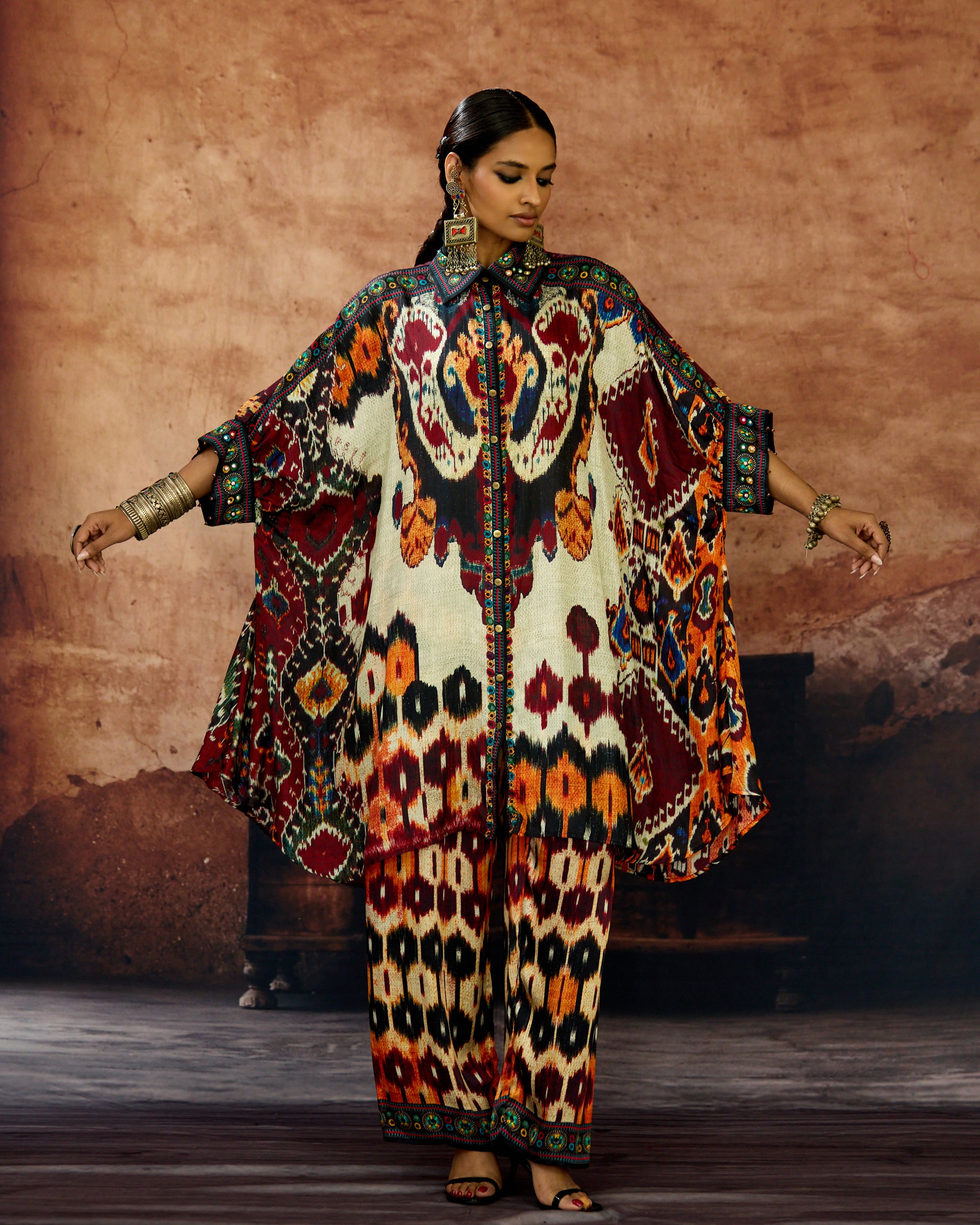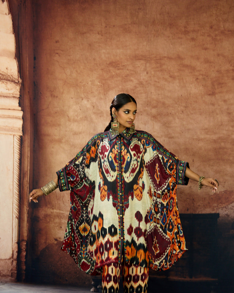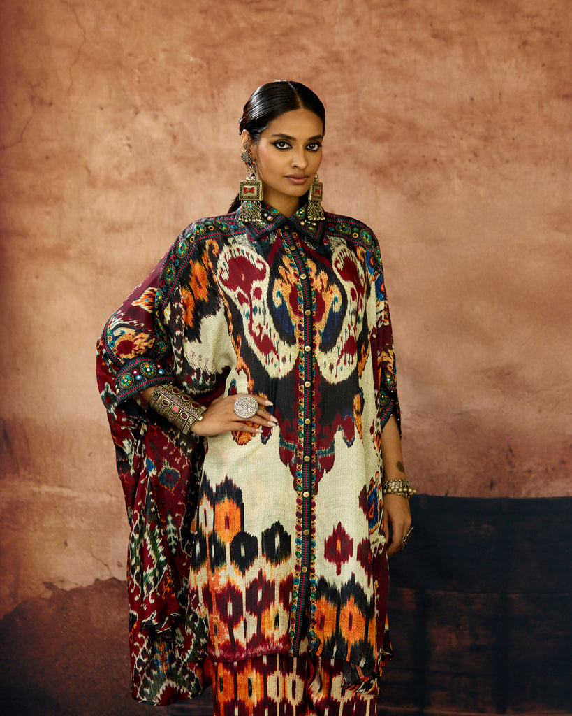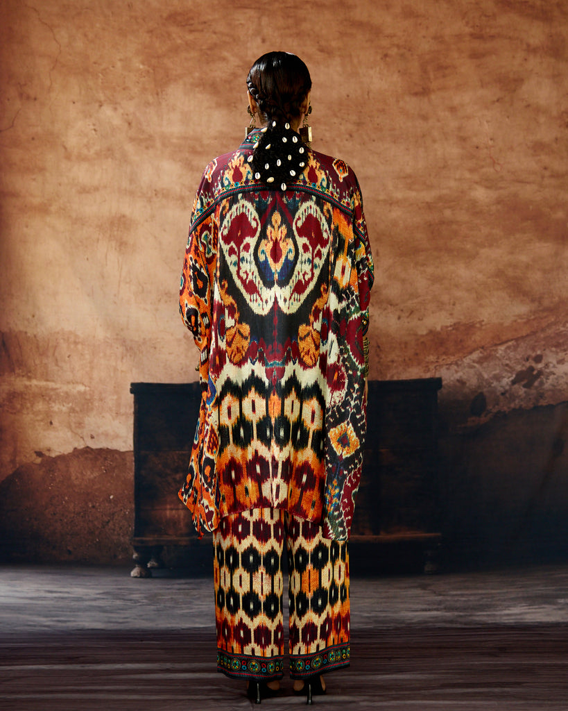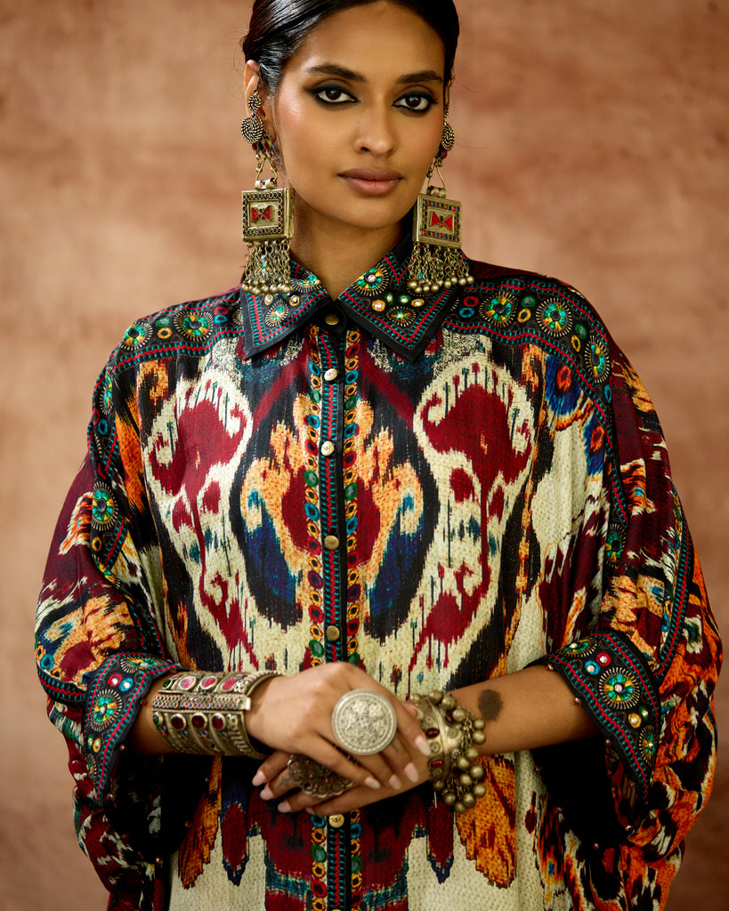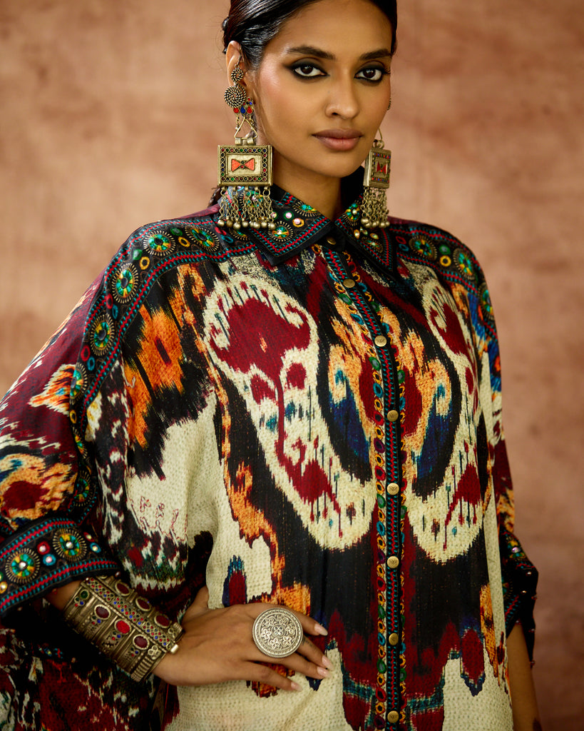 A silk print Circular sleeve button front shirt with extended cuffs. The shirt is a loose fit.