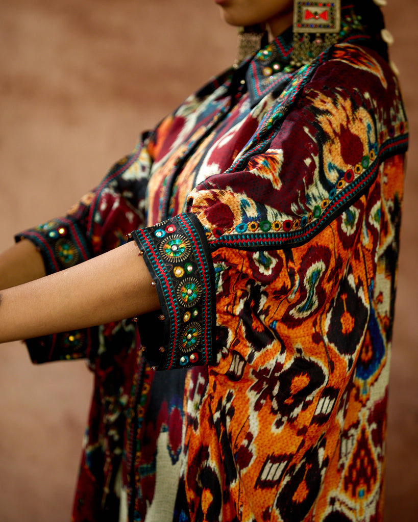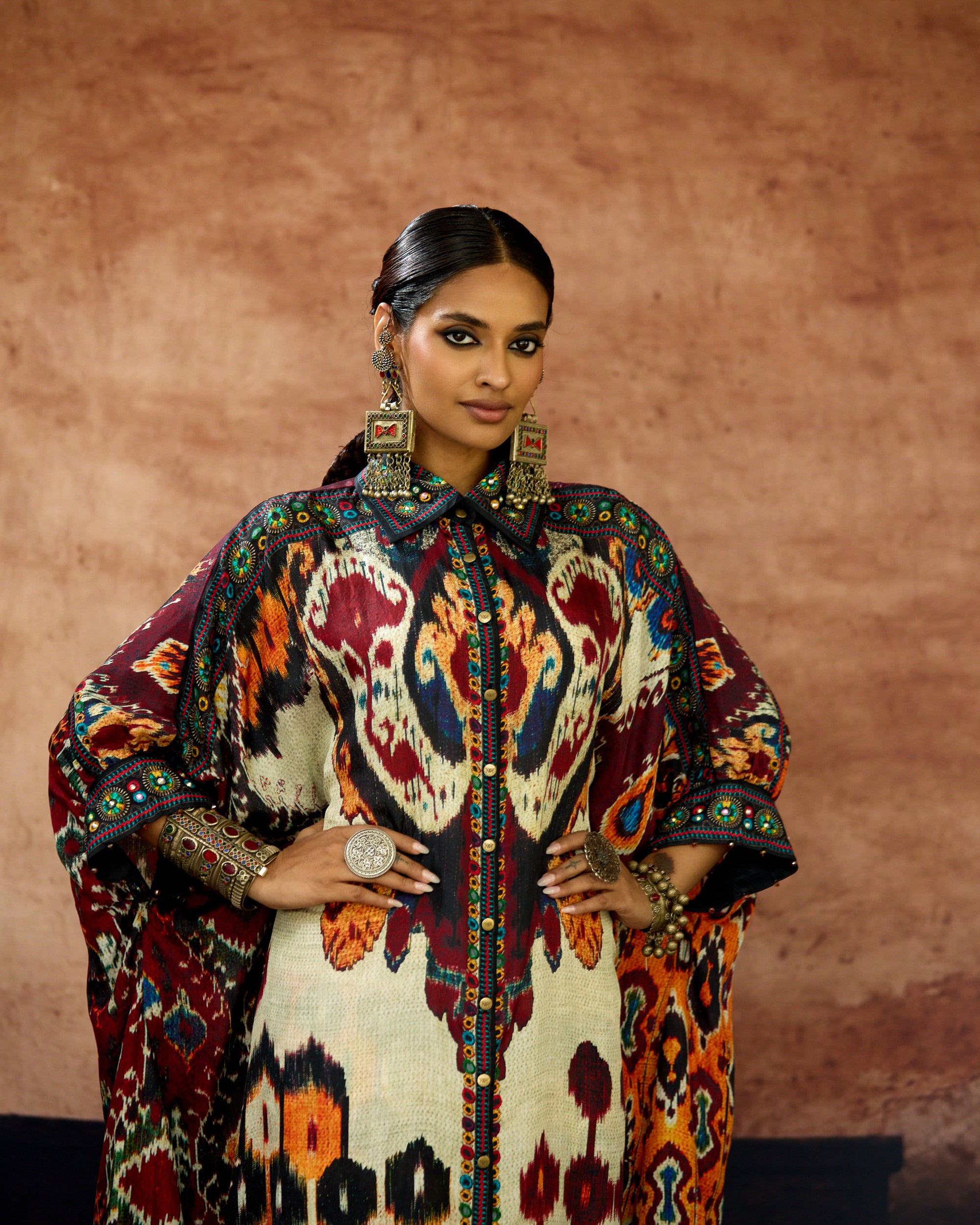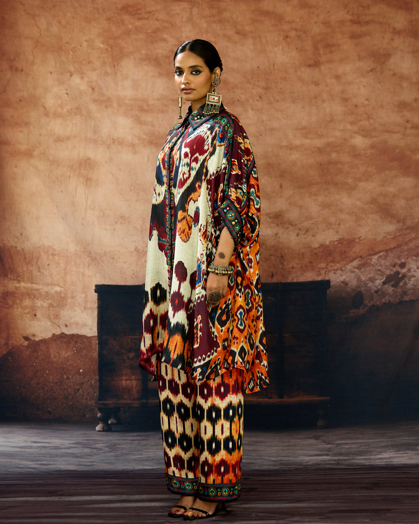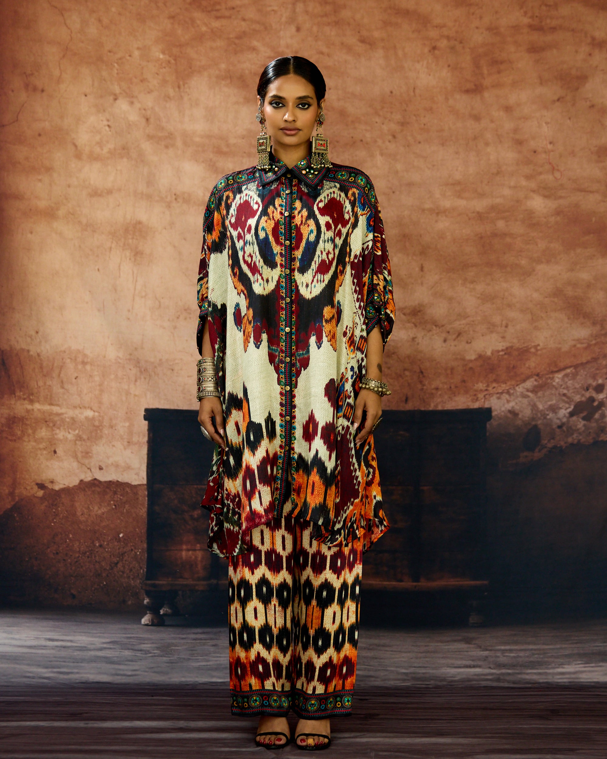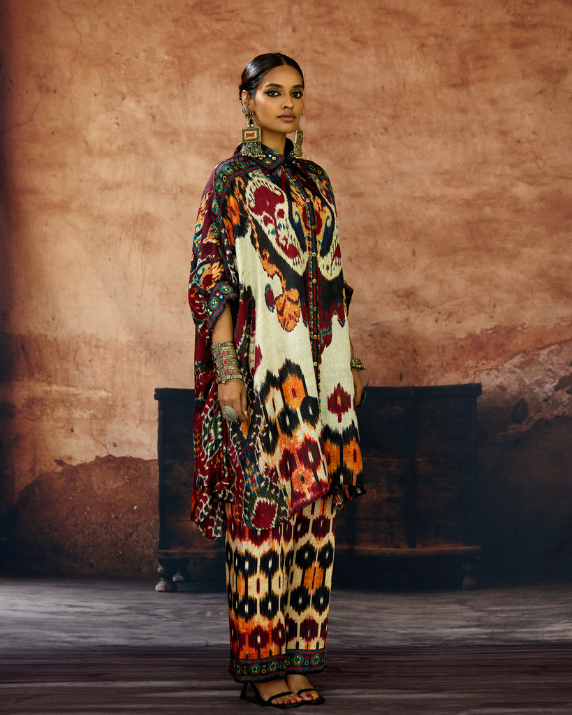 A silk print Circular sleeve button front shirt with extended cuffs. The shirt is a loose fit.