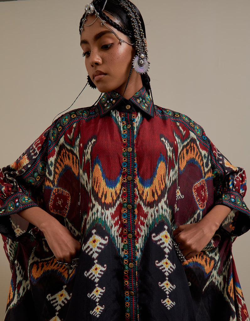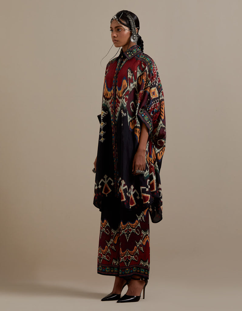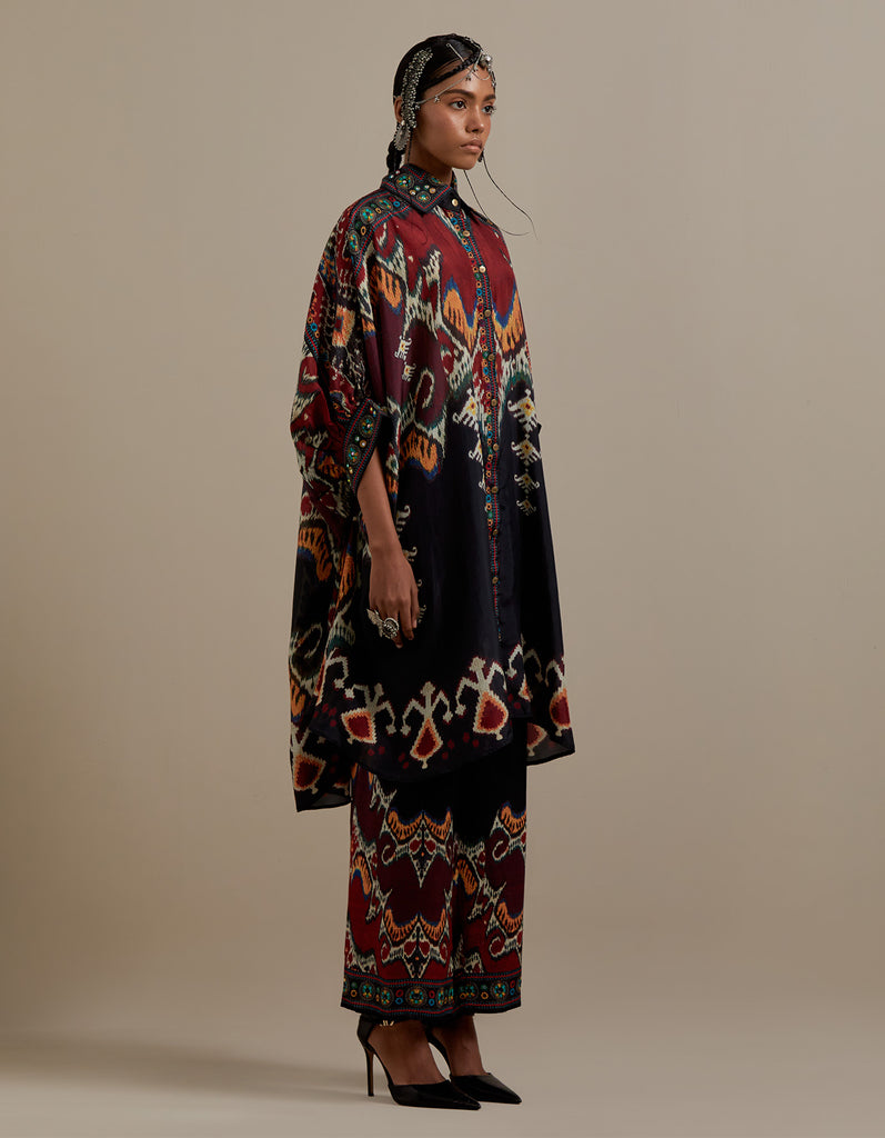 A silk print Circular sleeve button front shirt with extended cuffs. The shirt is a loose fit.