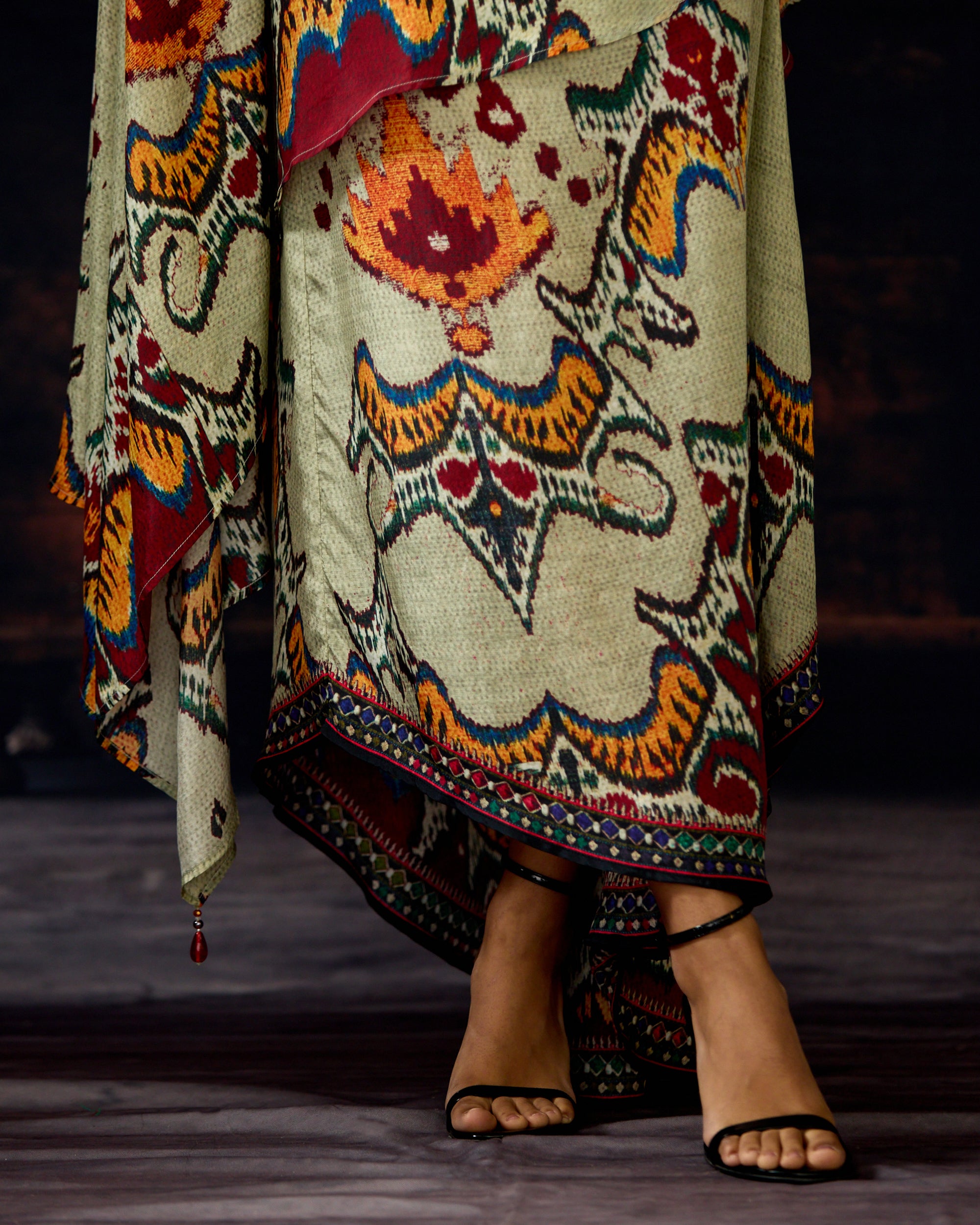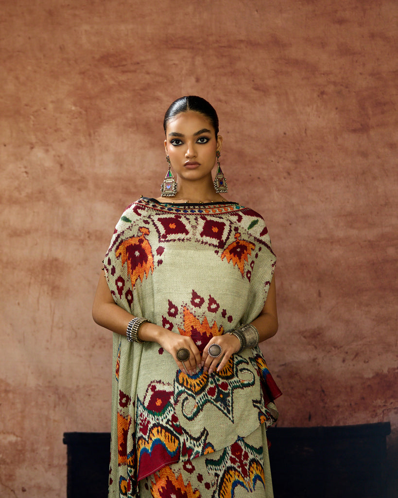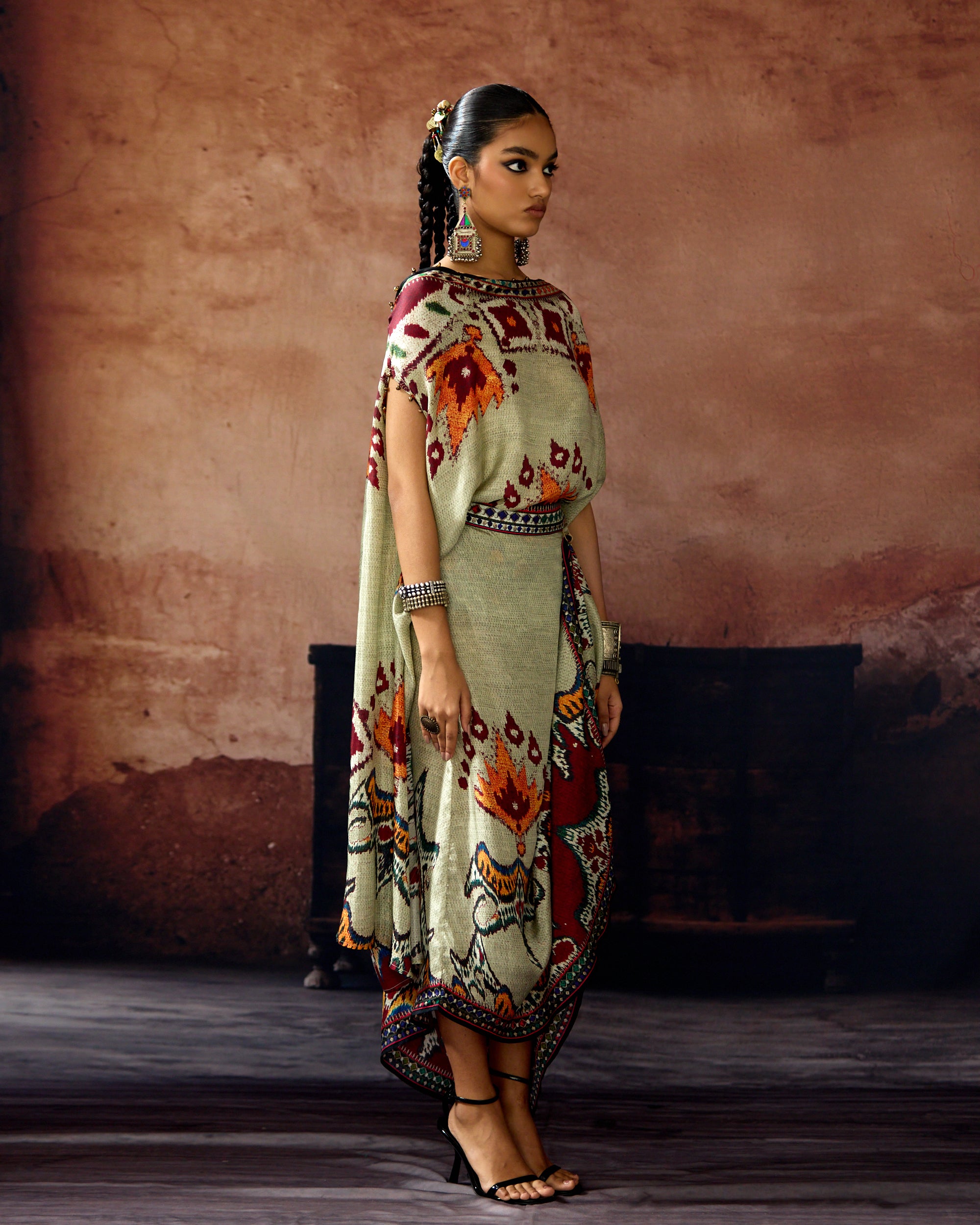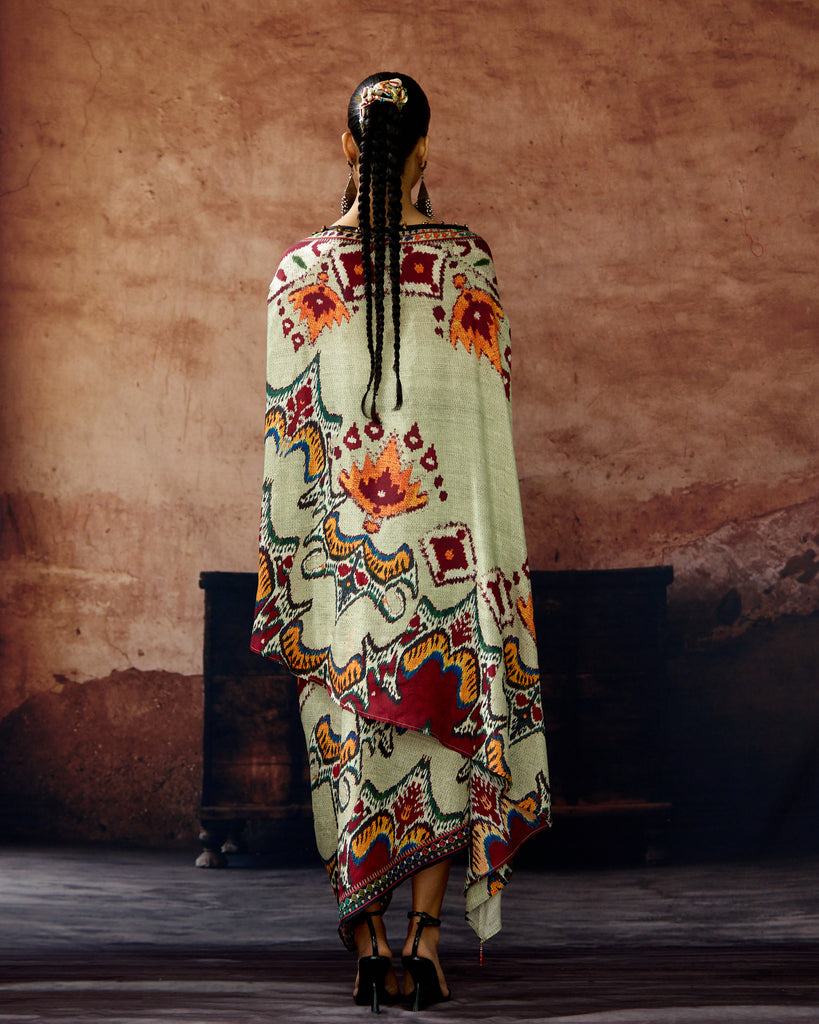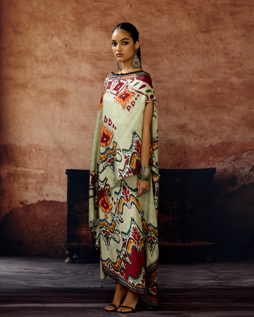 The Kamini set is a draped asymmetric cape with a wide boat neckline and armholes for the hands.