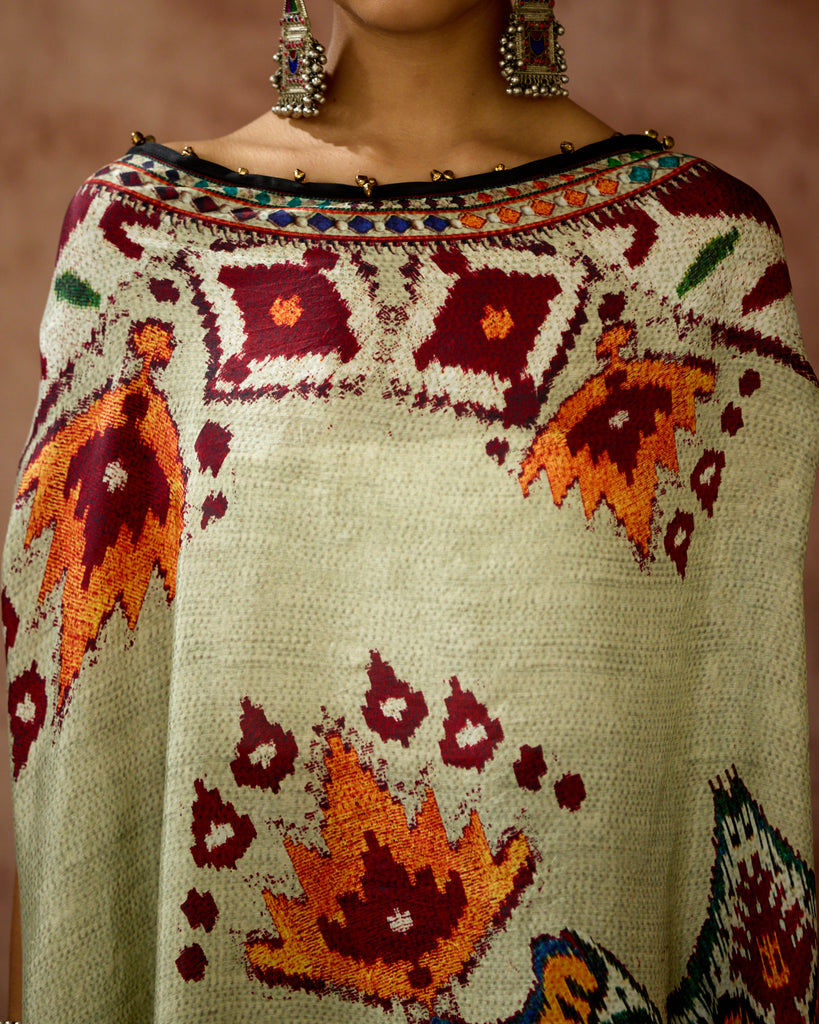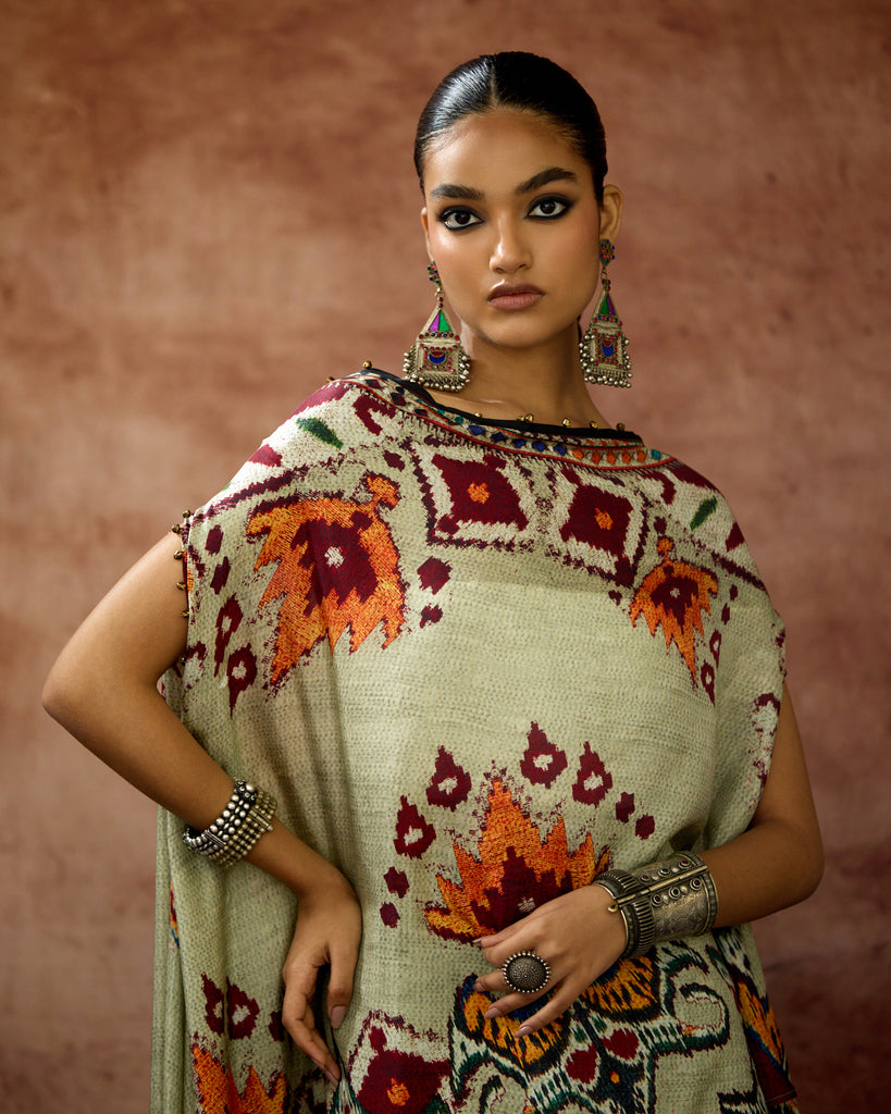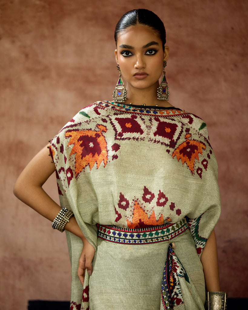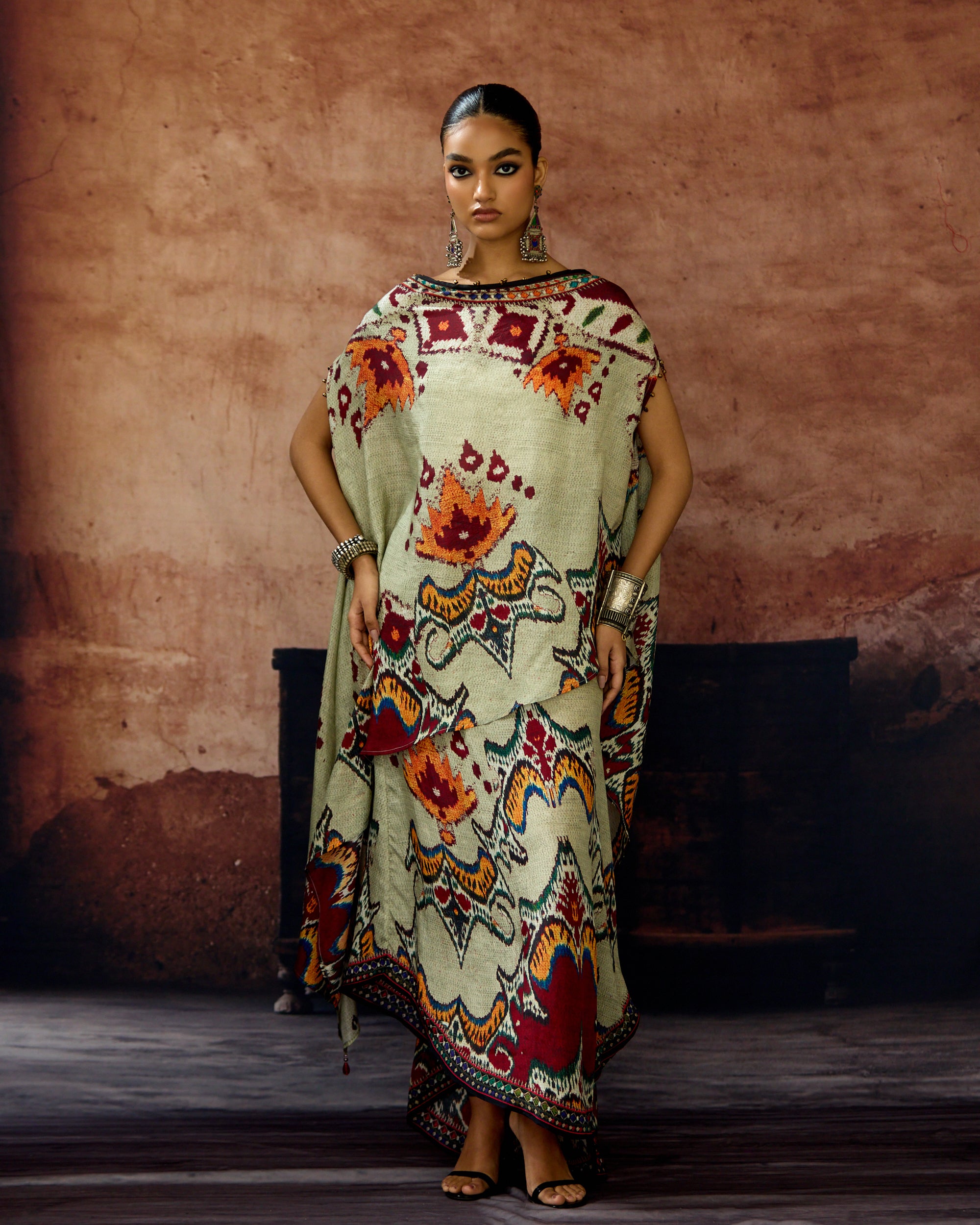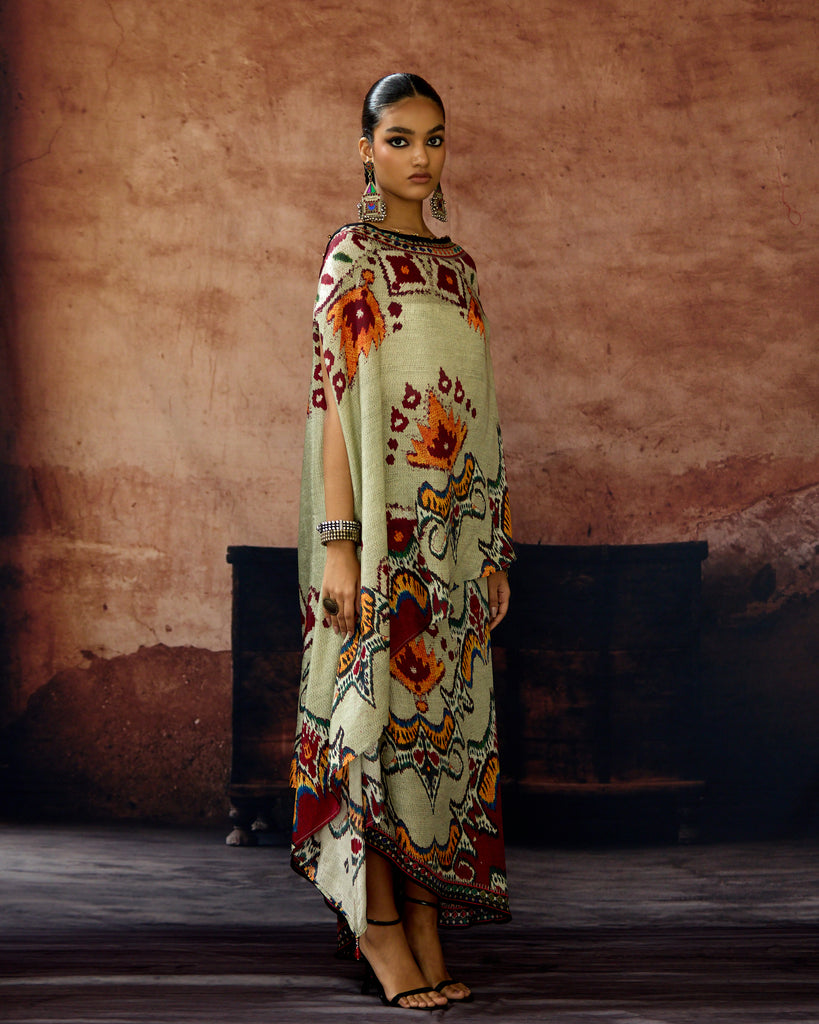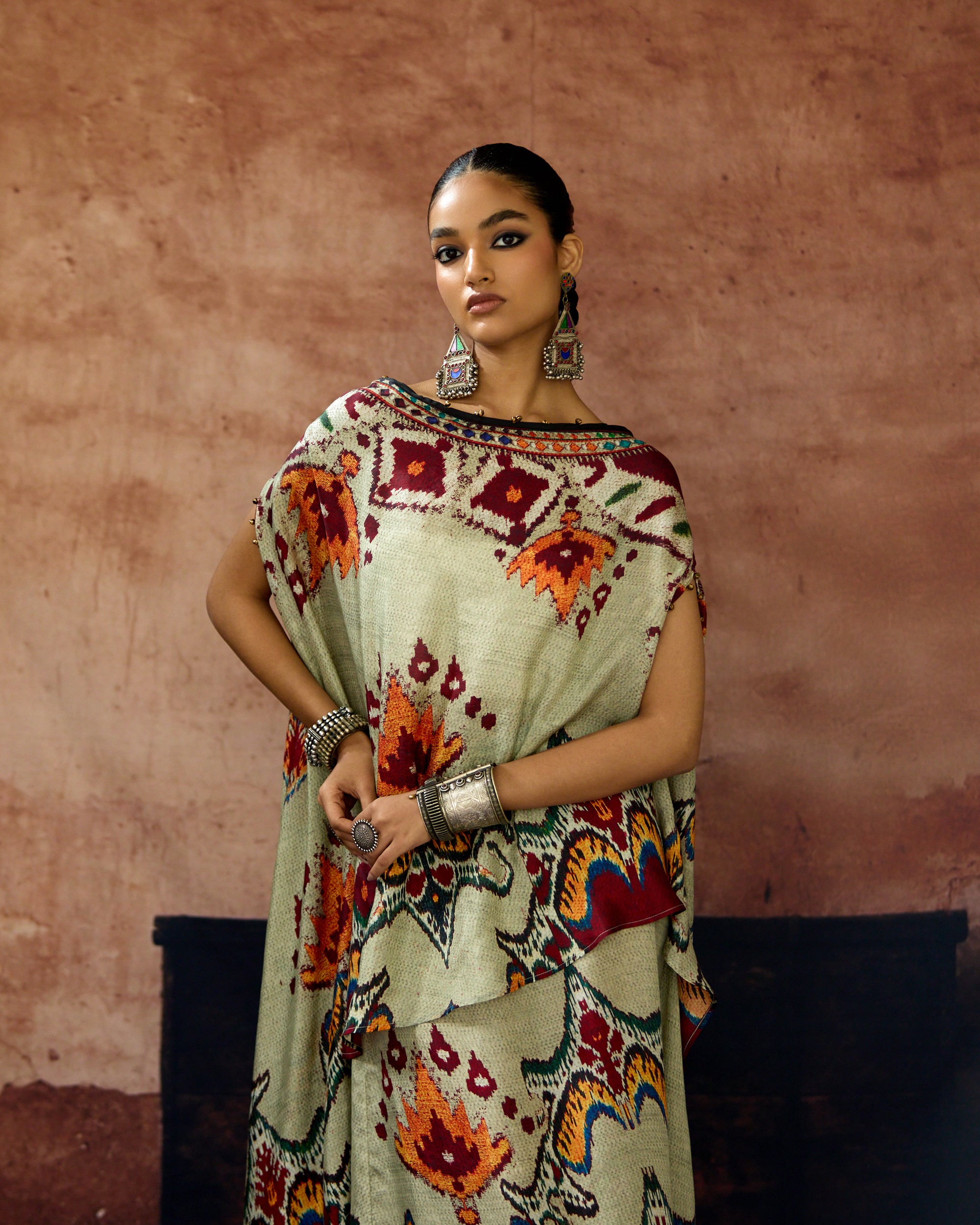 The Kamini set is a draped asymmetric cape with a wide boat neckline and armholes for the hands.