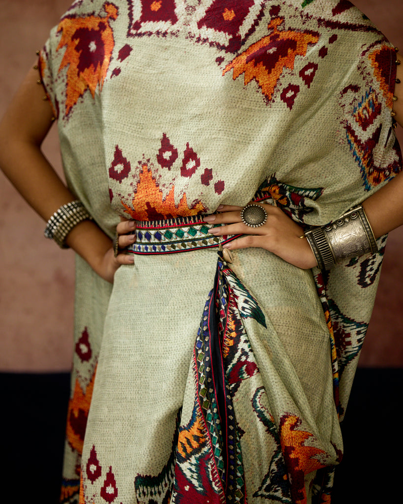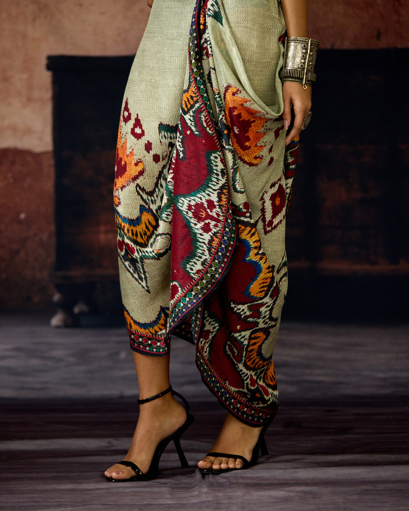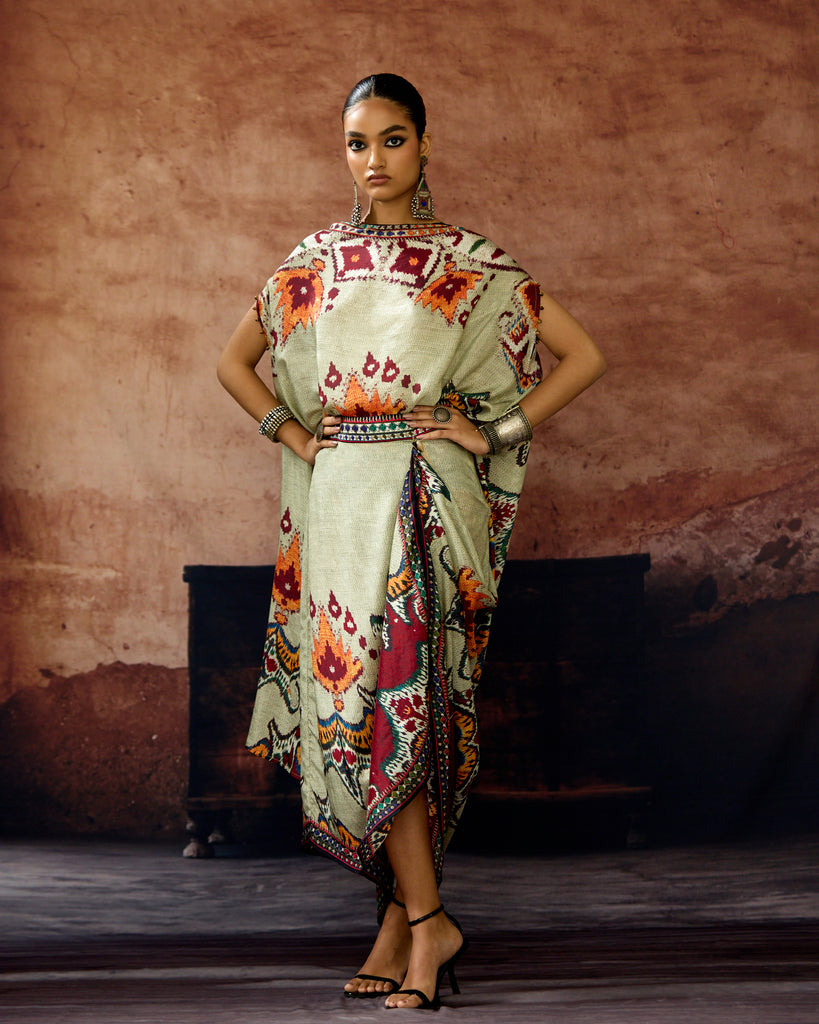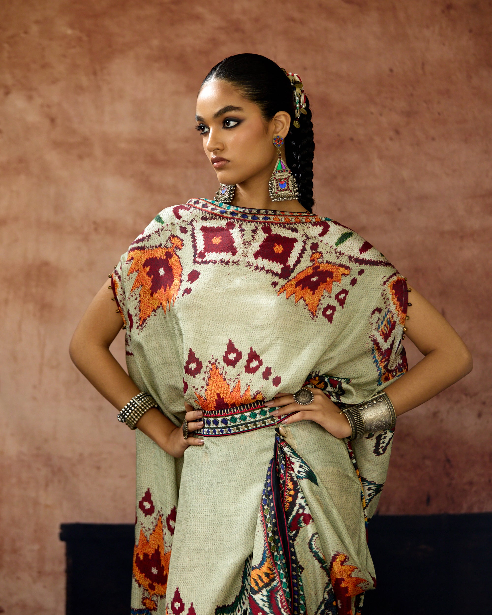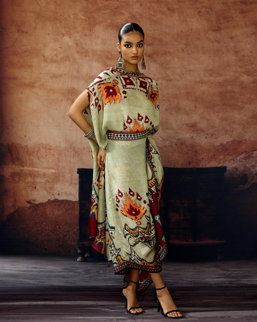 The set comes with an asymmetric draped skirt in the coordinating print that had a belt and back elastic. The skirt also has a loop on the waist band that allows a cowry shell at the bottom right hem of the skirt to be tucked into it to create a shorter drape for the same.
