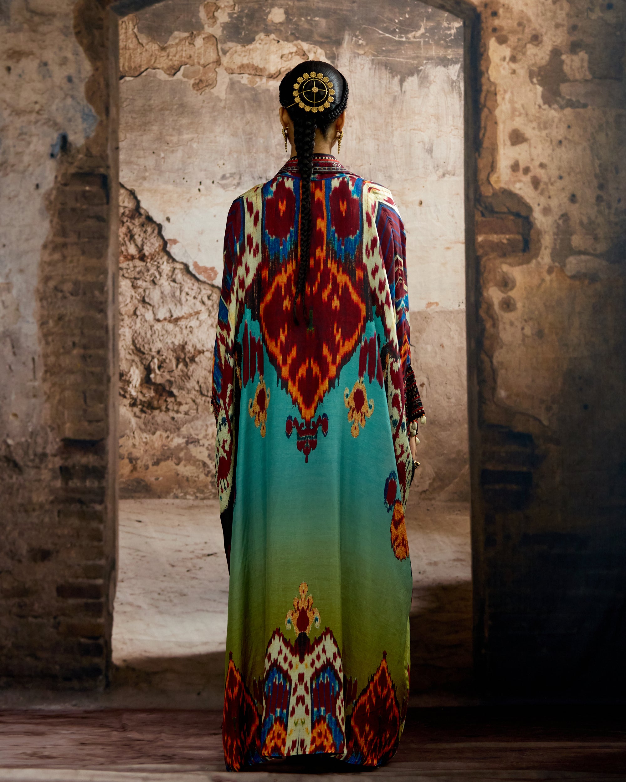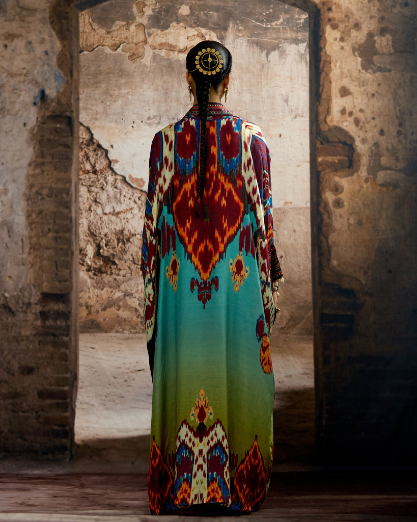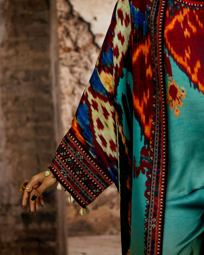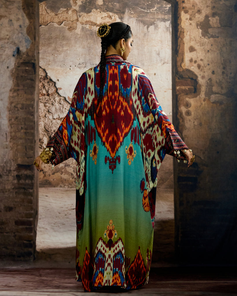 The Kimono Jacket is a free sized open front collar jacket with broad cuffs.