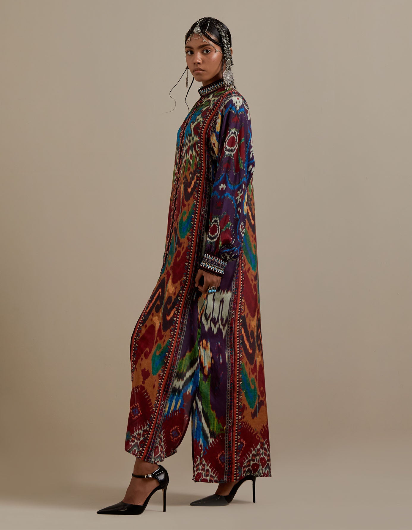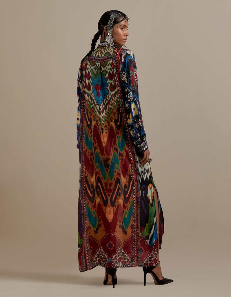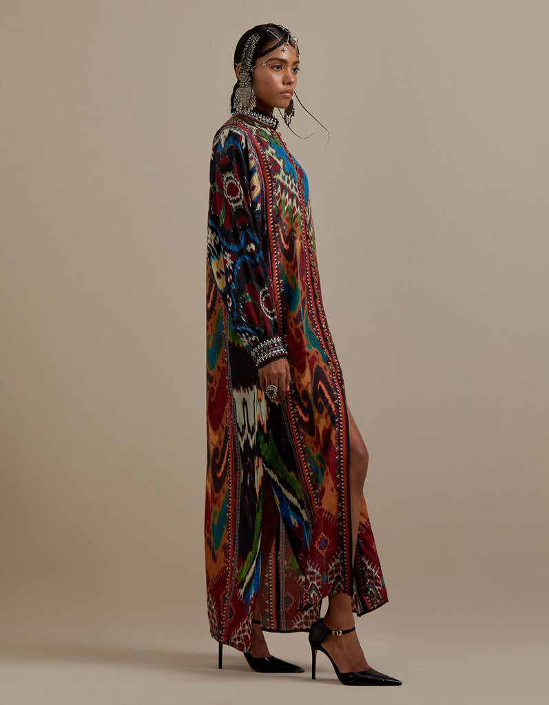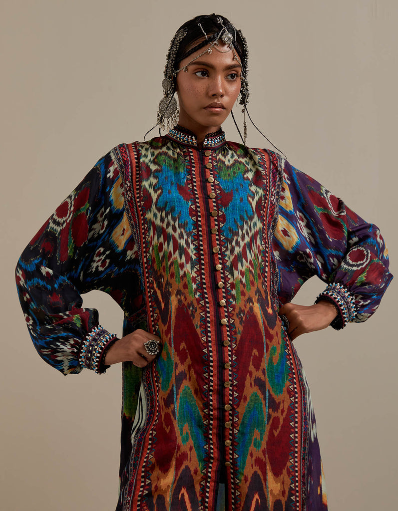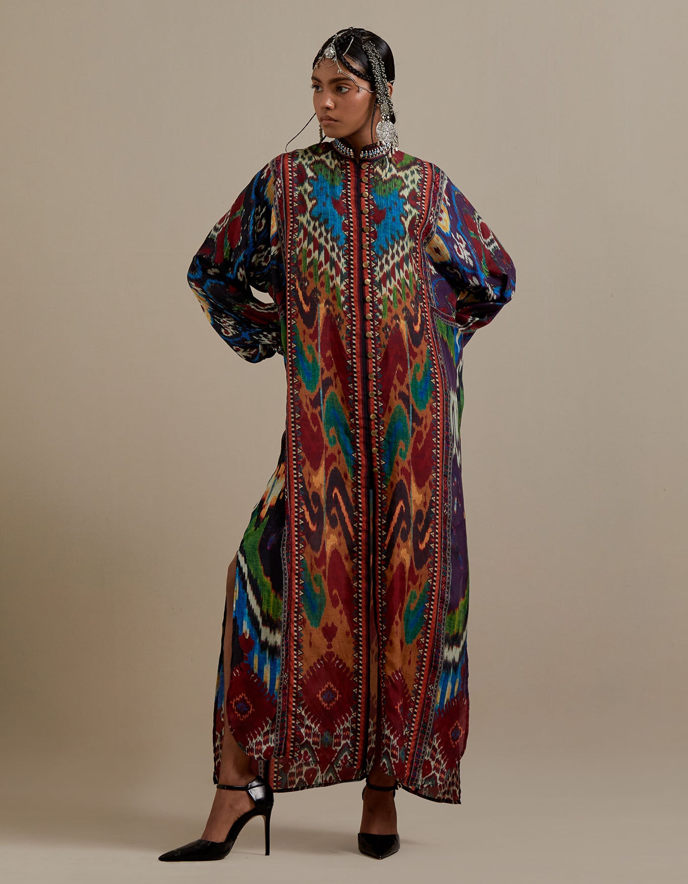 Kiza : A silk print shirt dress with kimono sleeves and a cuff closure. The shirt dress has a button front opening all the way down as per the images shown.