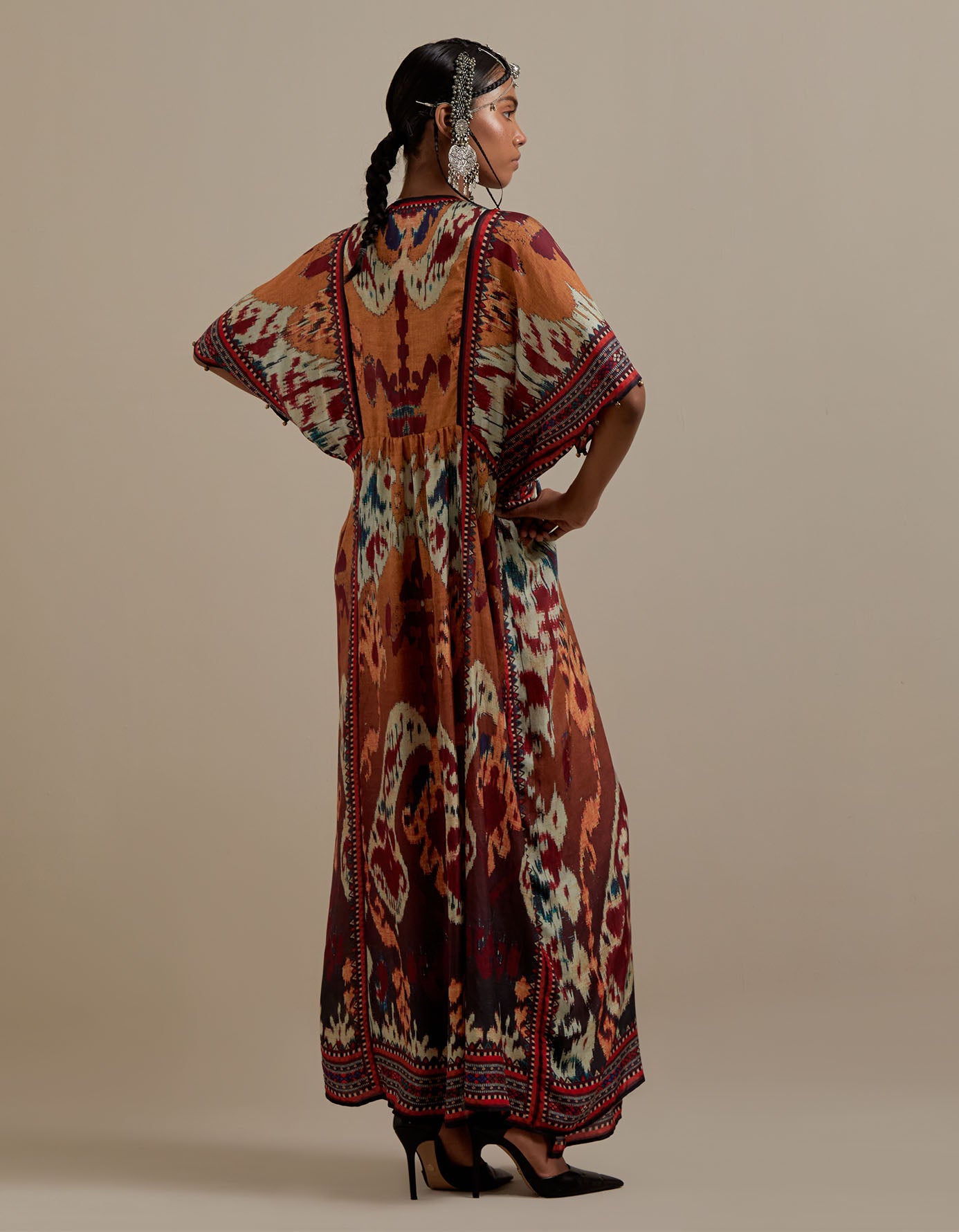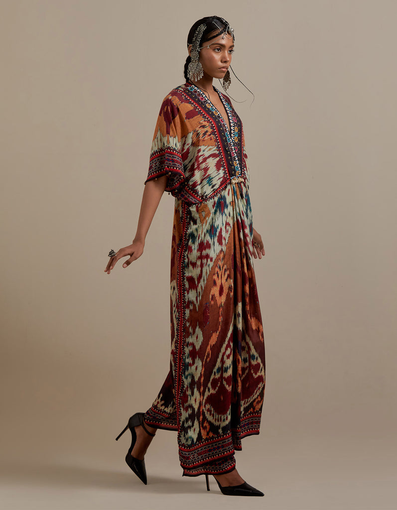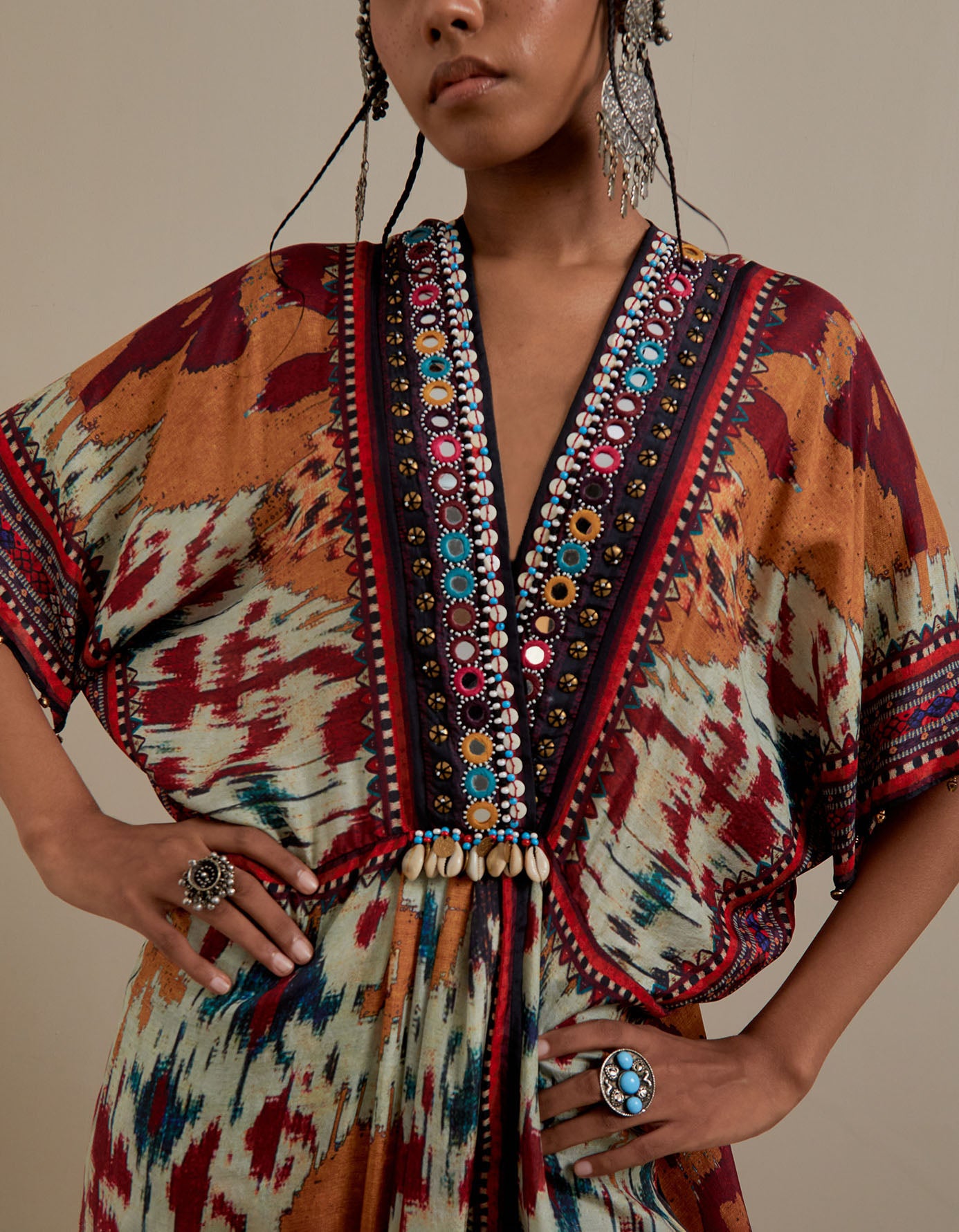 The kaftan dress has an overlap front neckline in a contrast colors and a draped overlap cascade below.