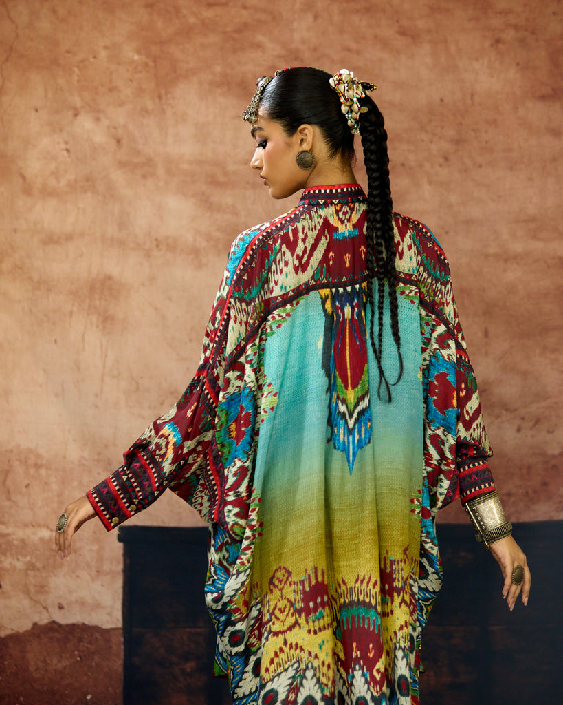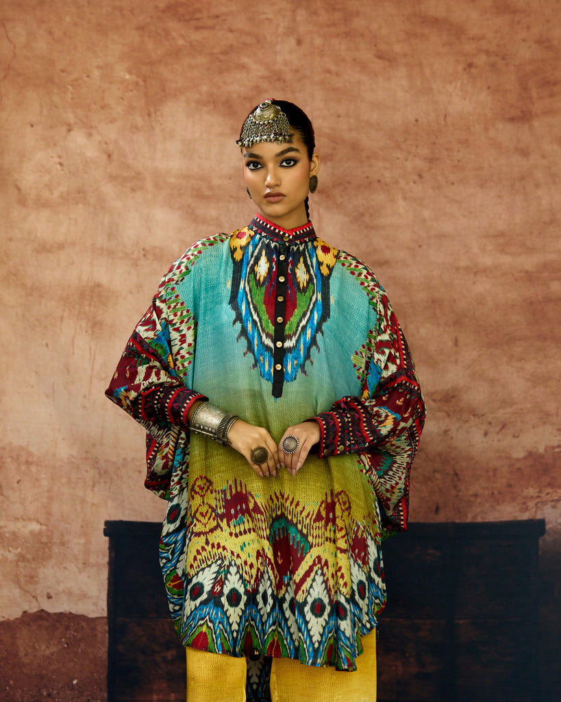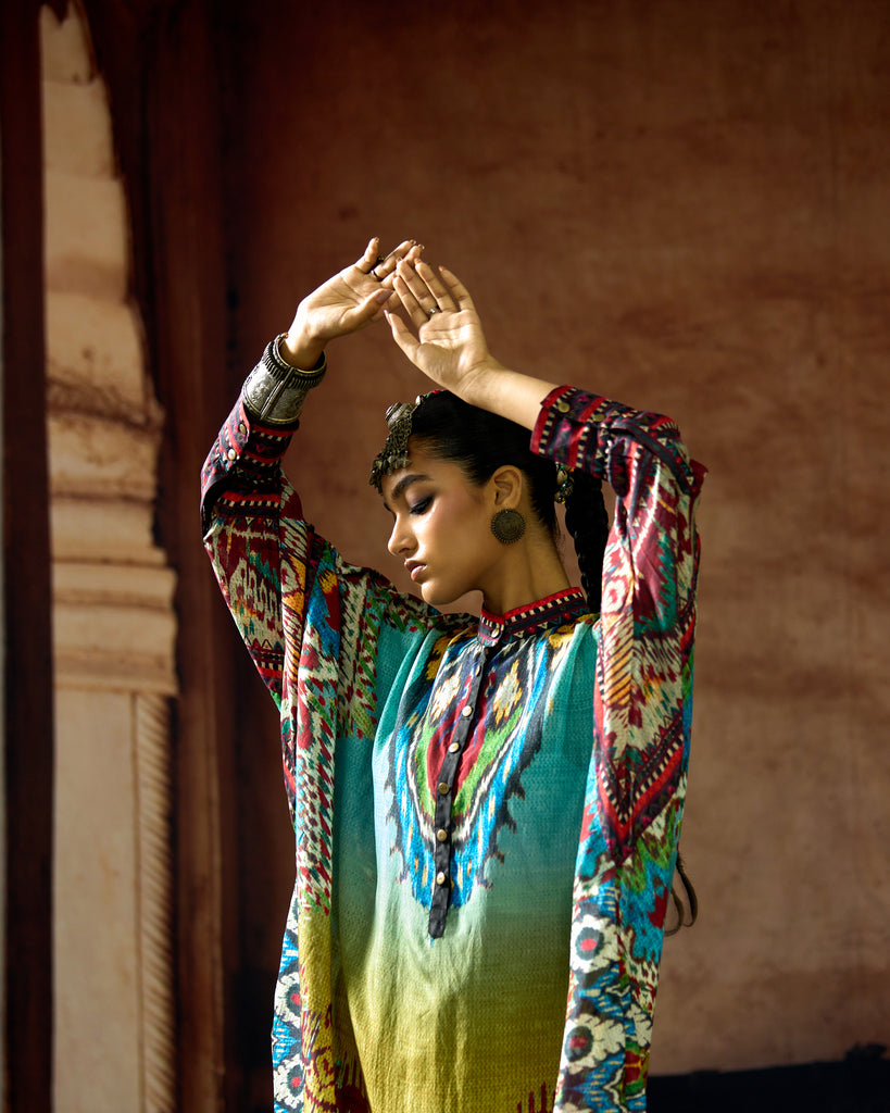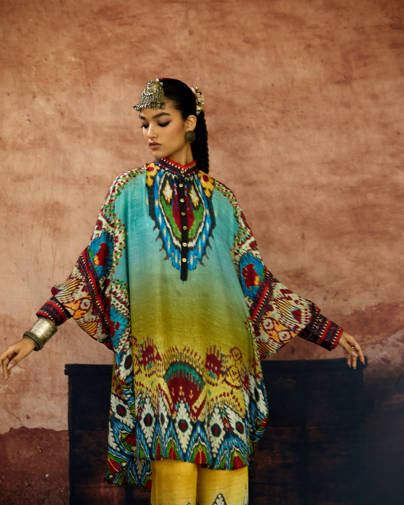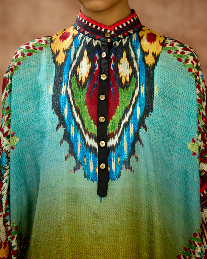 A silk print front placket tunic with a hi-low front and back. The Tunic has a mandarin collar with buttons and cuffs.