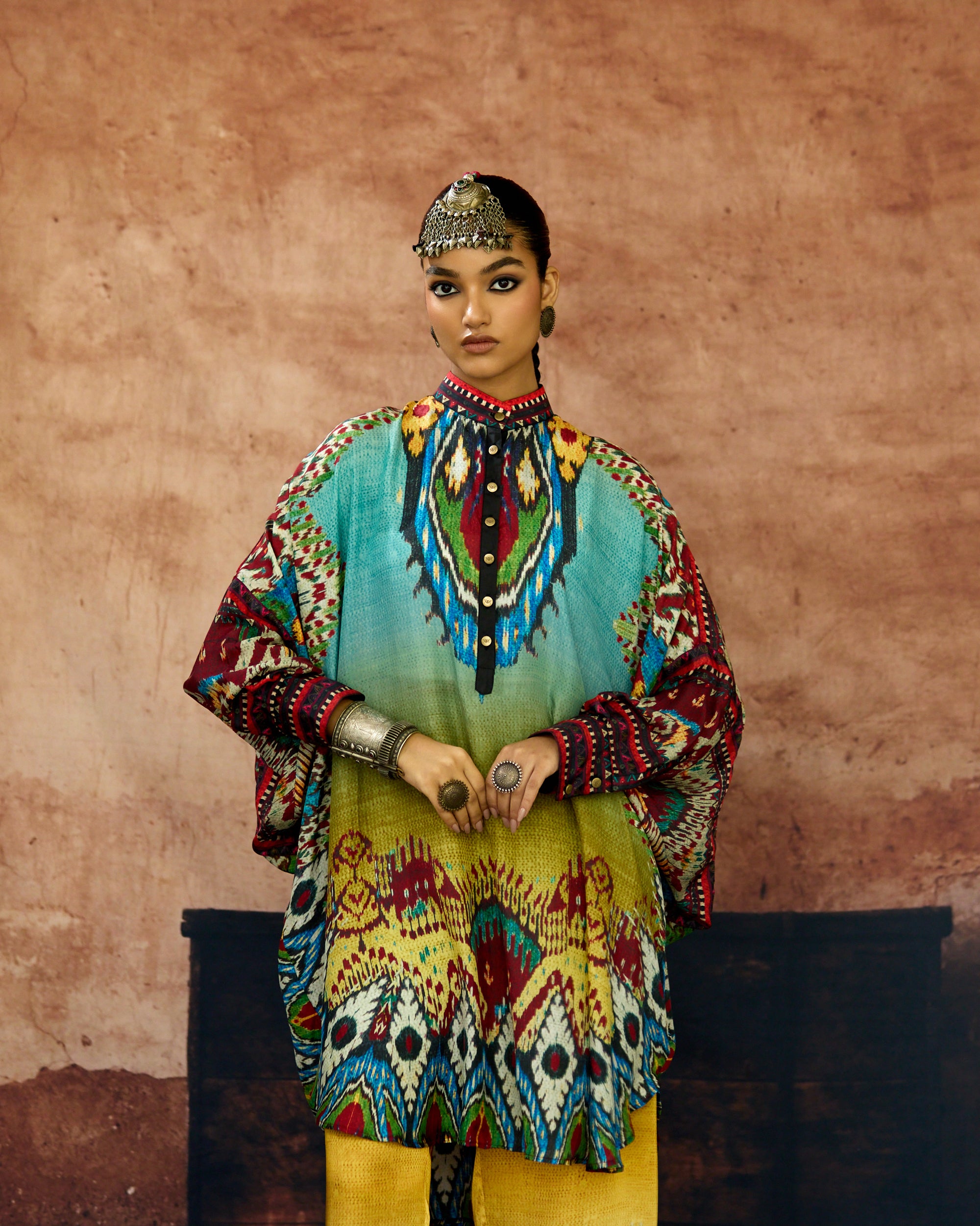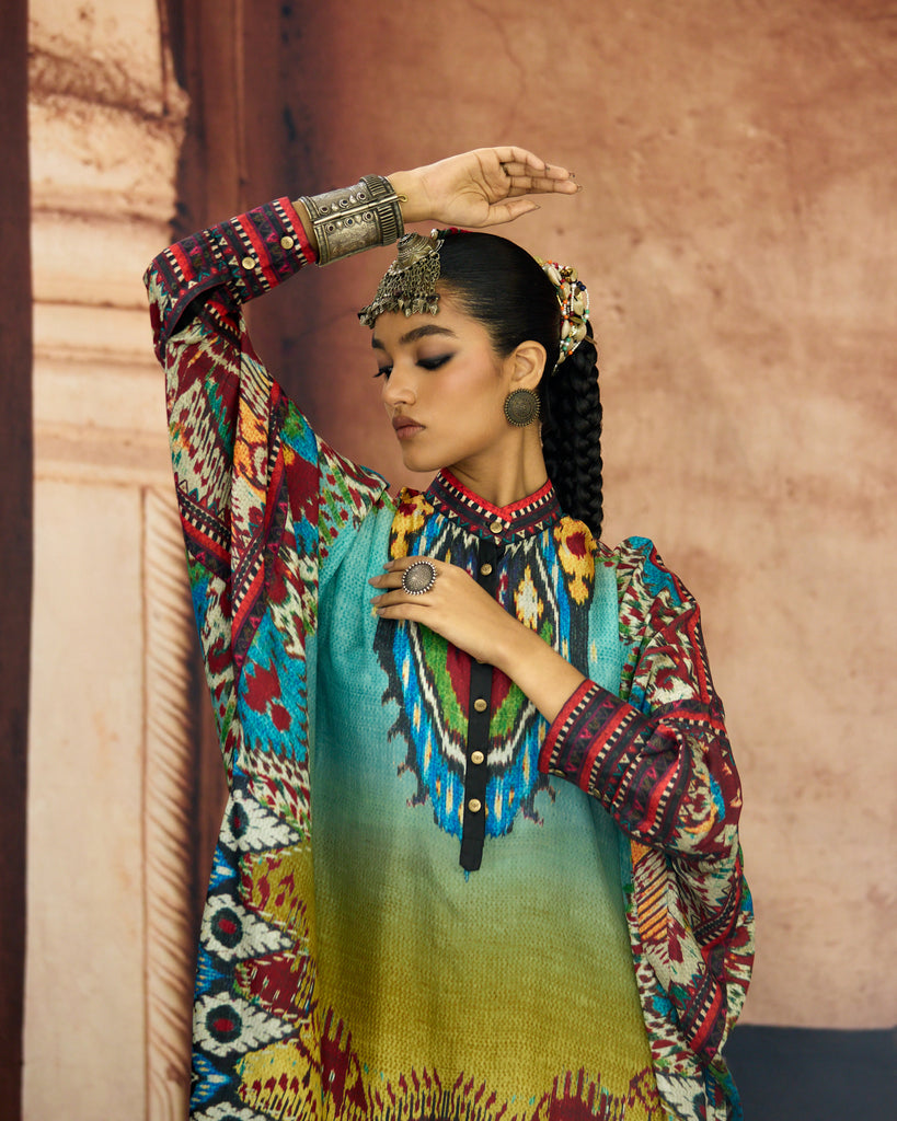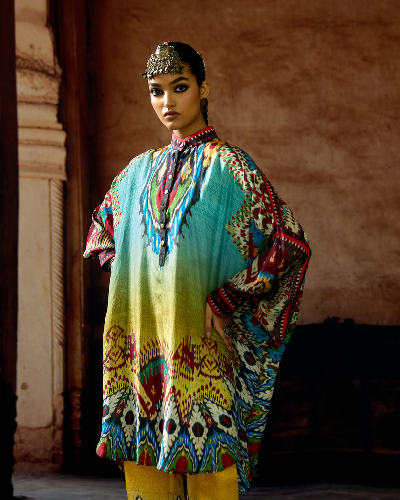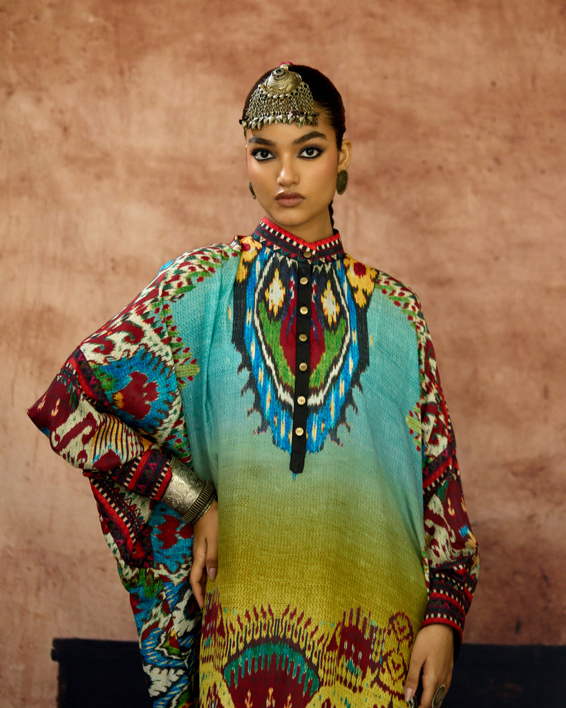 A silk print front placket tunic with a hi-low front and back. The Tunic has a mandarin collar with buttons and cuffs.