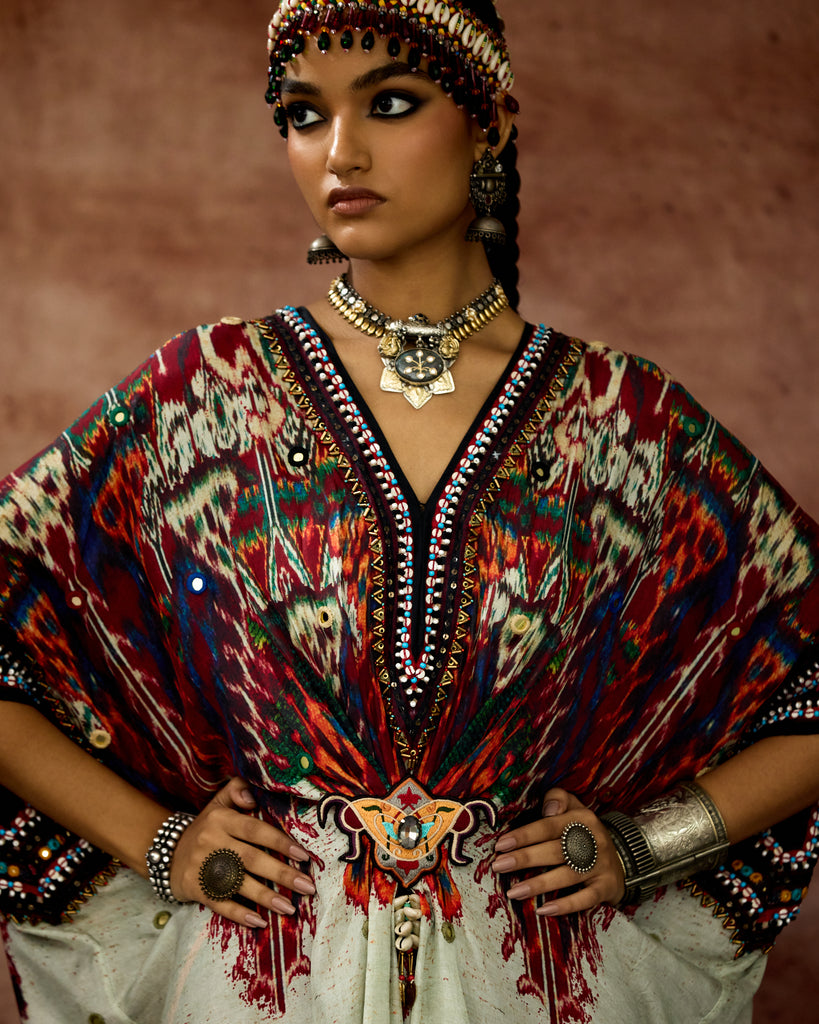 The kaftan is a free size with a belt behind the broach that is used to shape the waistline from inside.