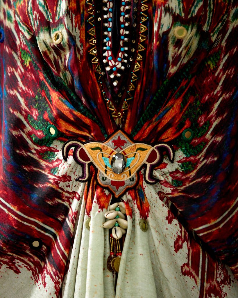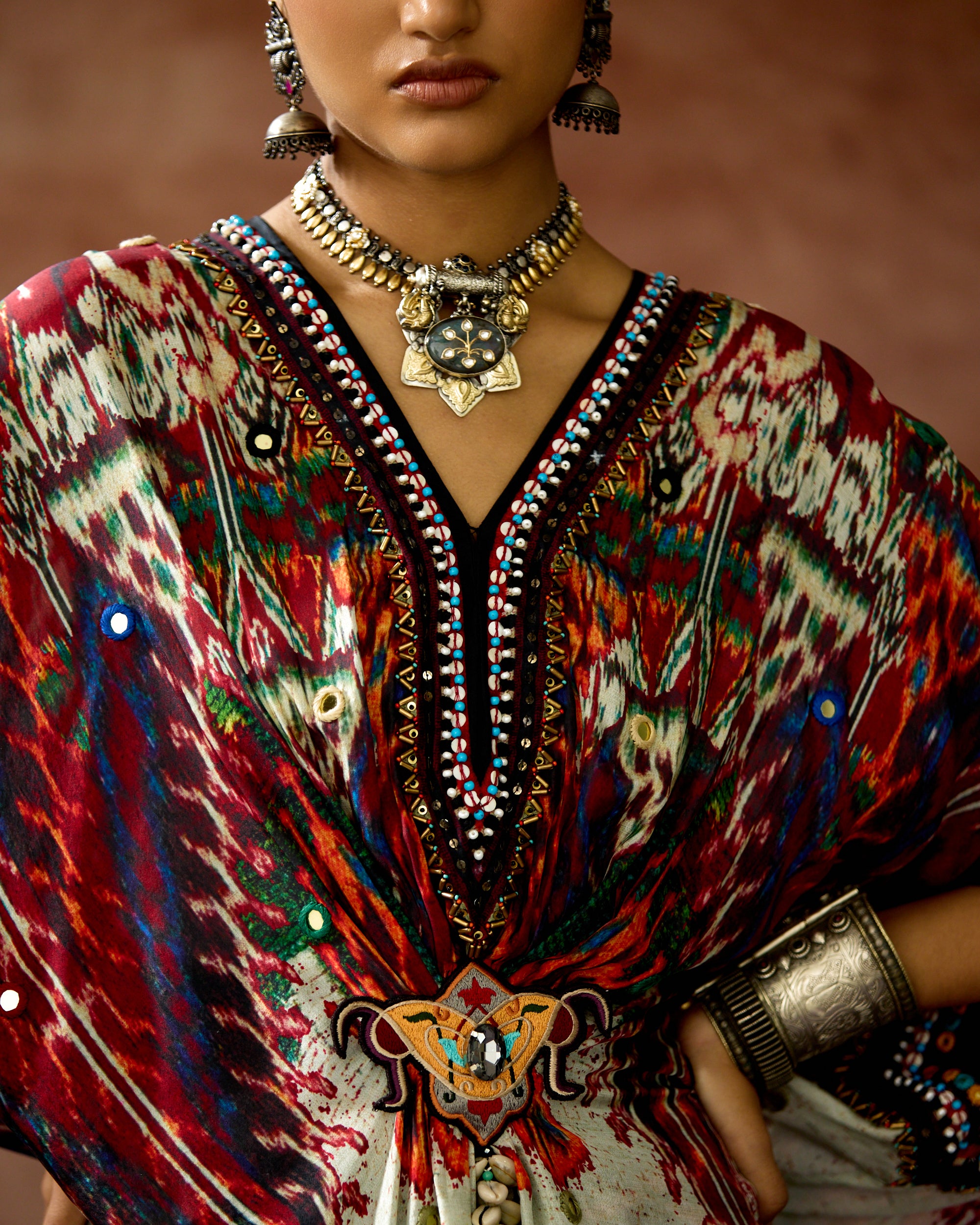 A 'V' neck free size kaftan top with our embroidered insignia broach on the empire.