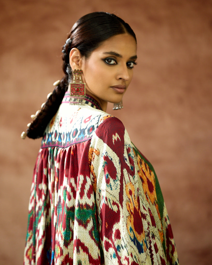 A silk print A-line Button front tunic with a wide circular gathered back. The tunic is a loose fit.