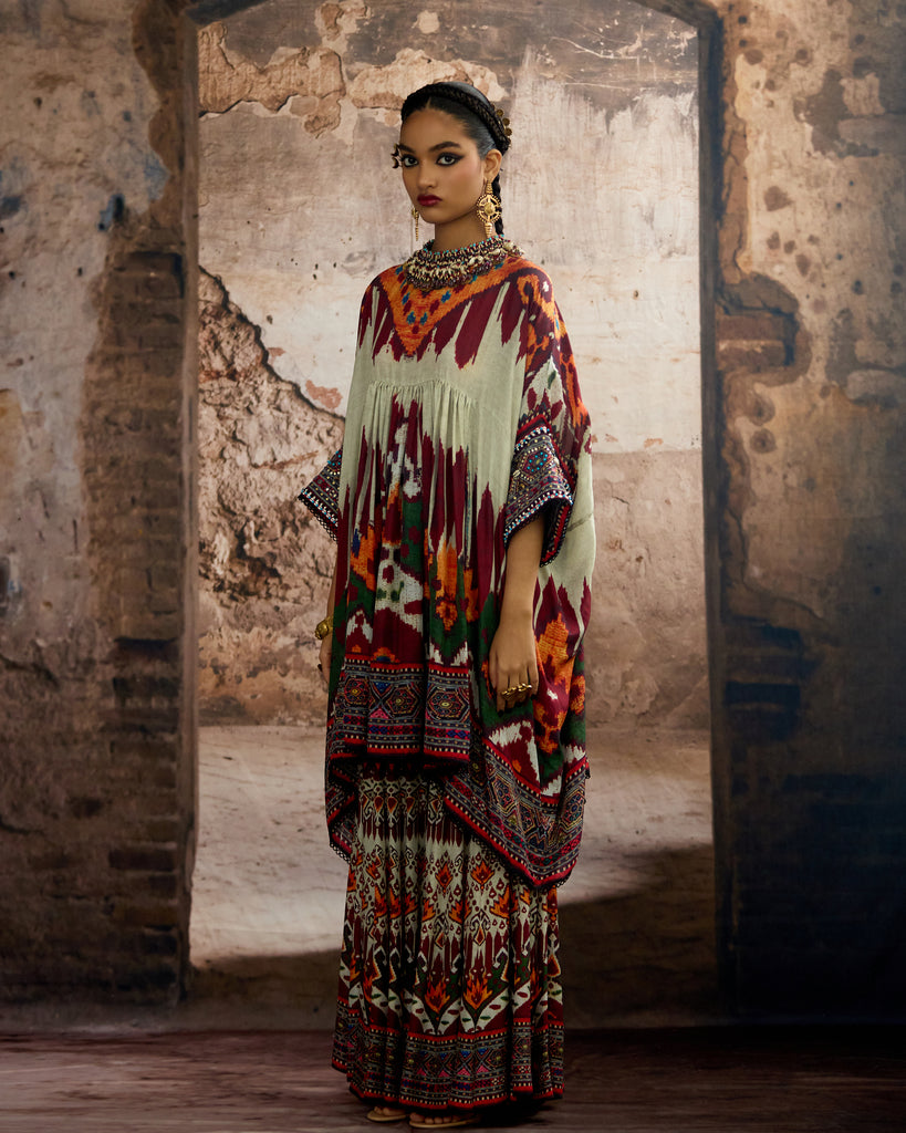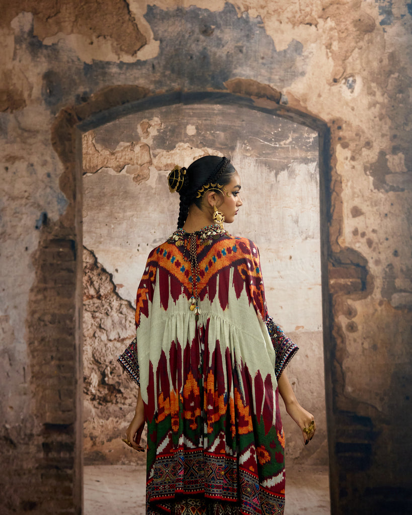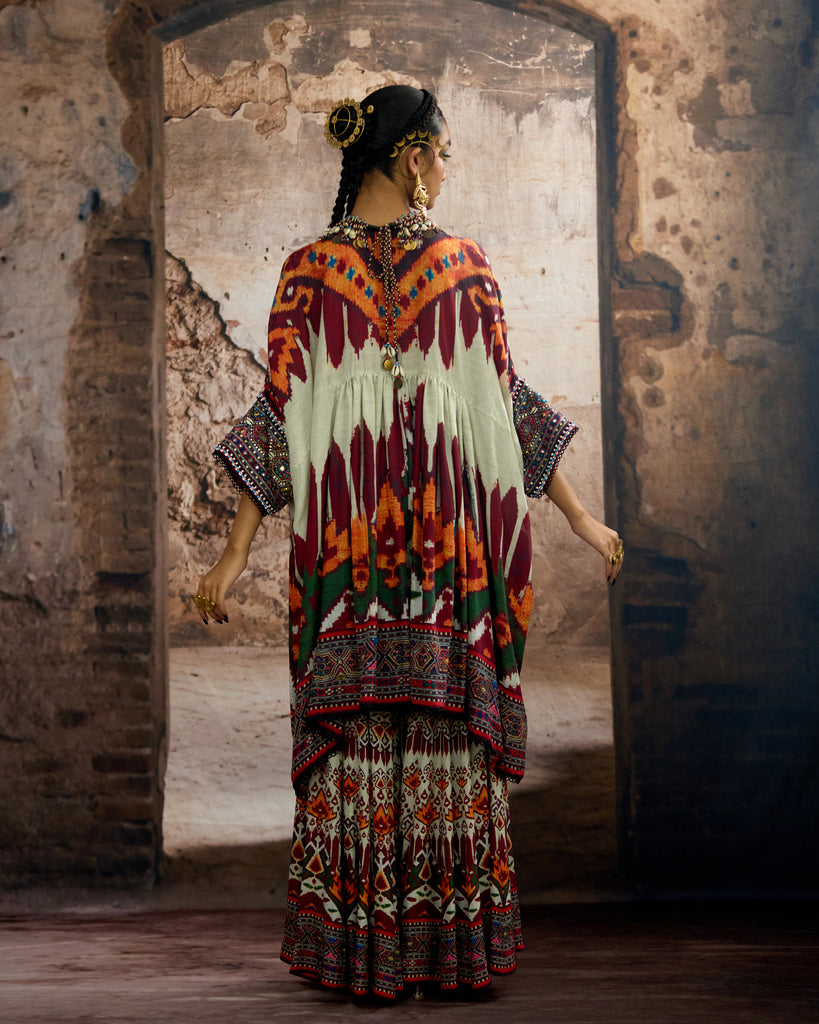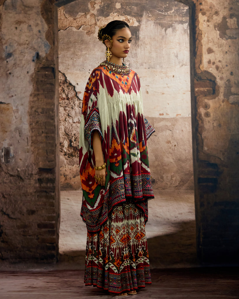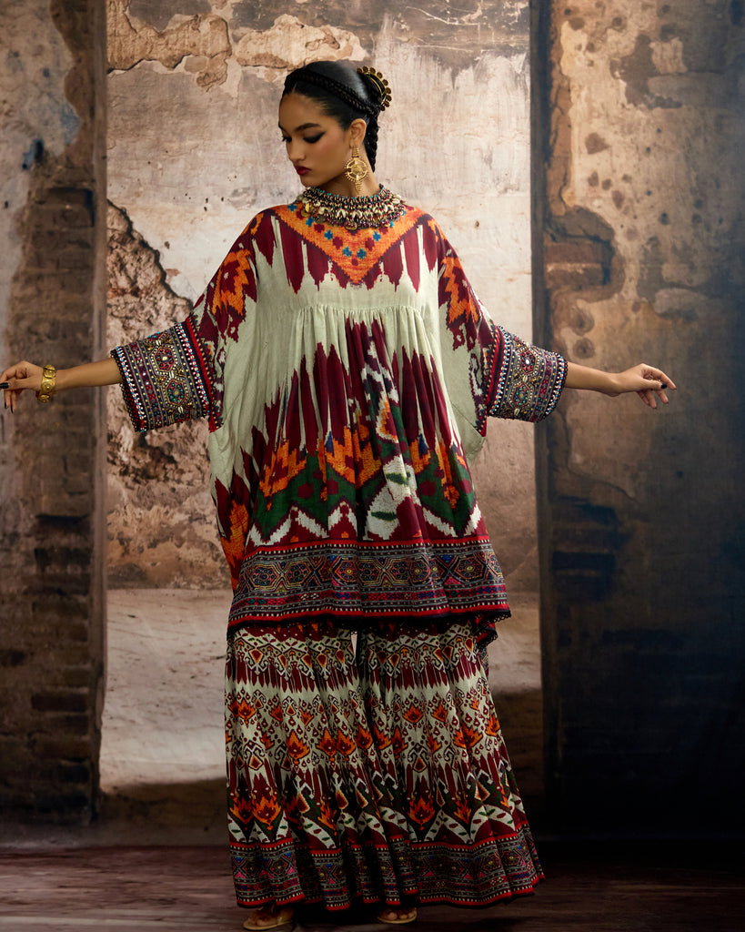 This kaftan tunic can also teamed with a coordinating Printed panelled flare Sharara bottoms with a front flat and back elastic waist.