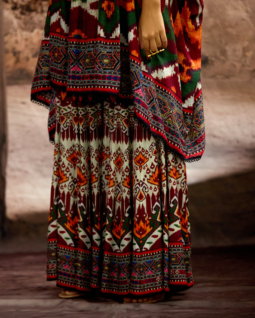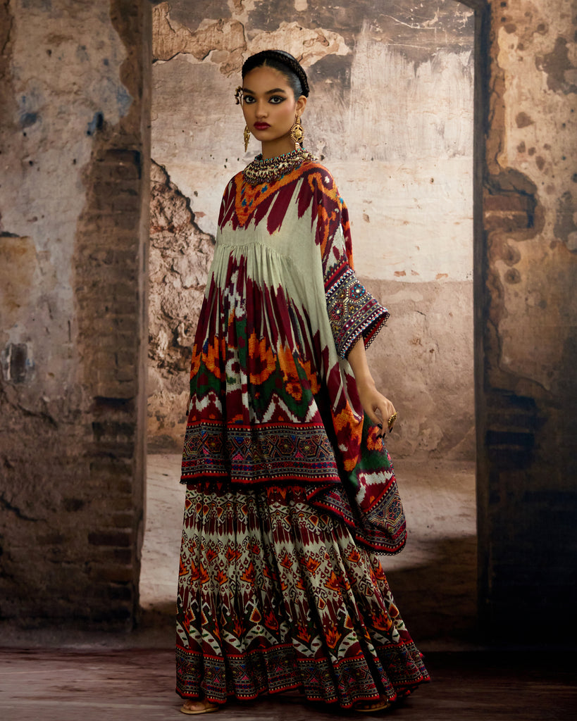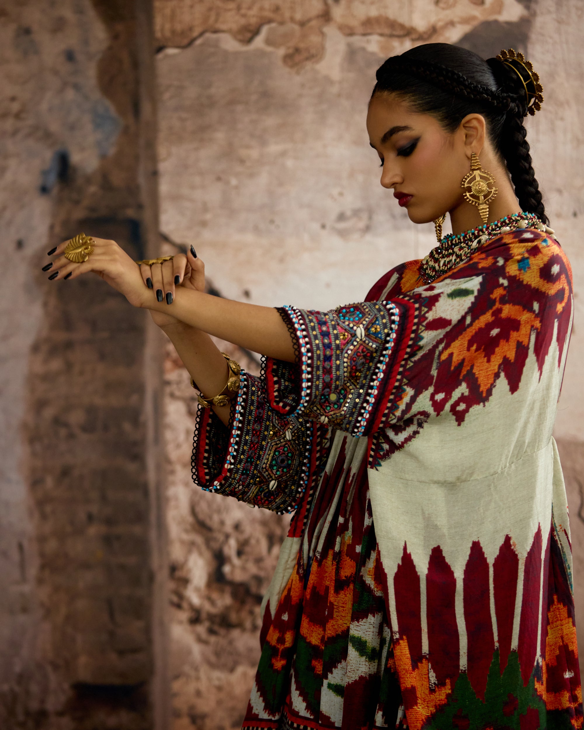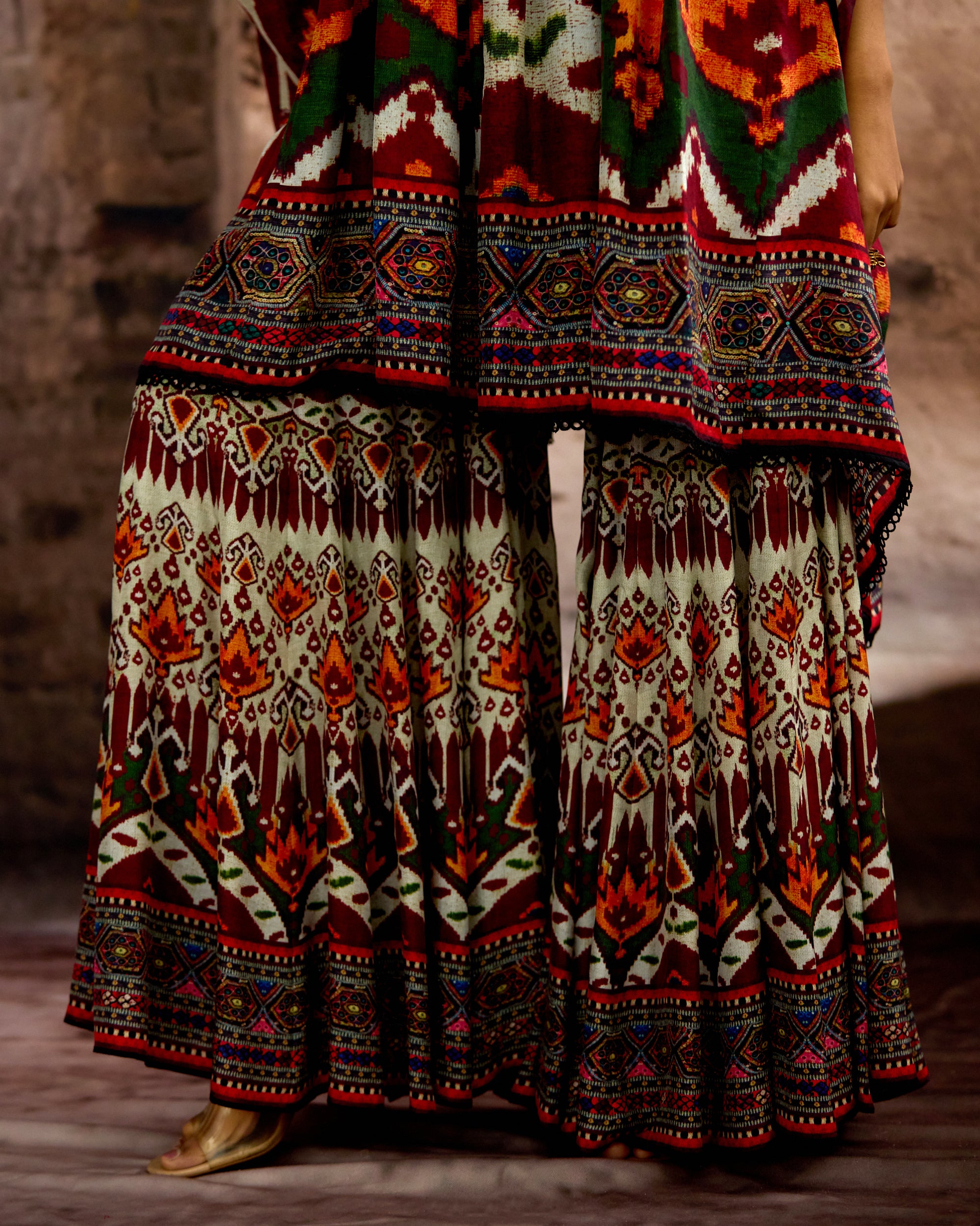 This kaftan tunic can also teamed with a coordinating Printed panelled flare Sharara bottoms with a front flat and back elastic waist.