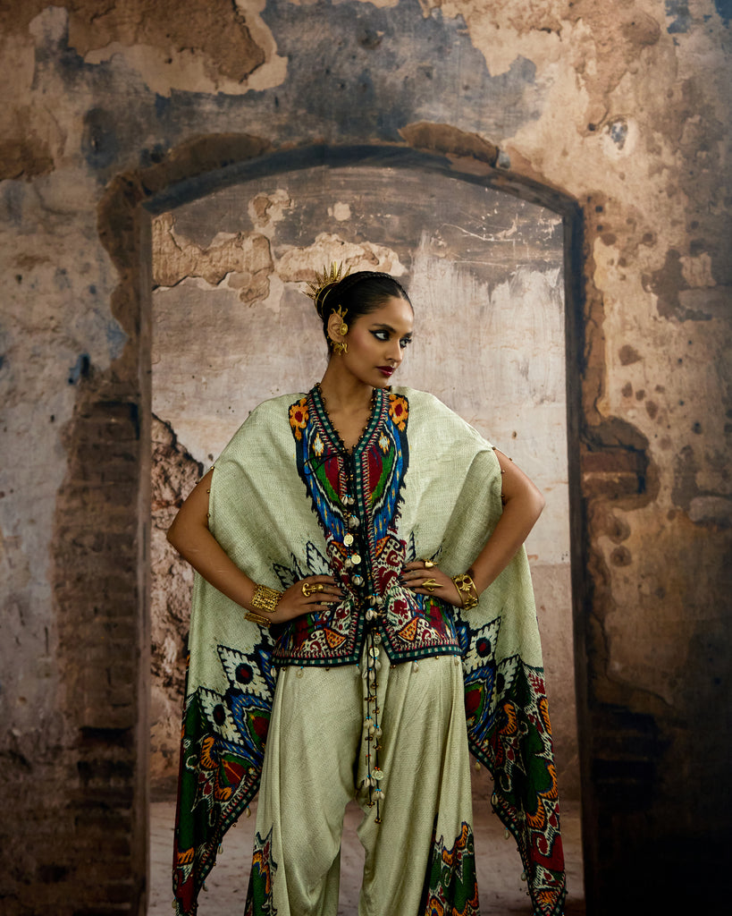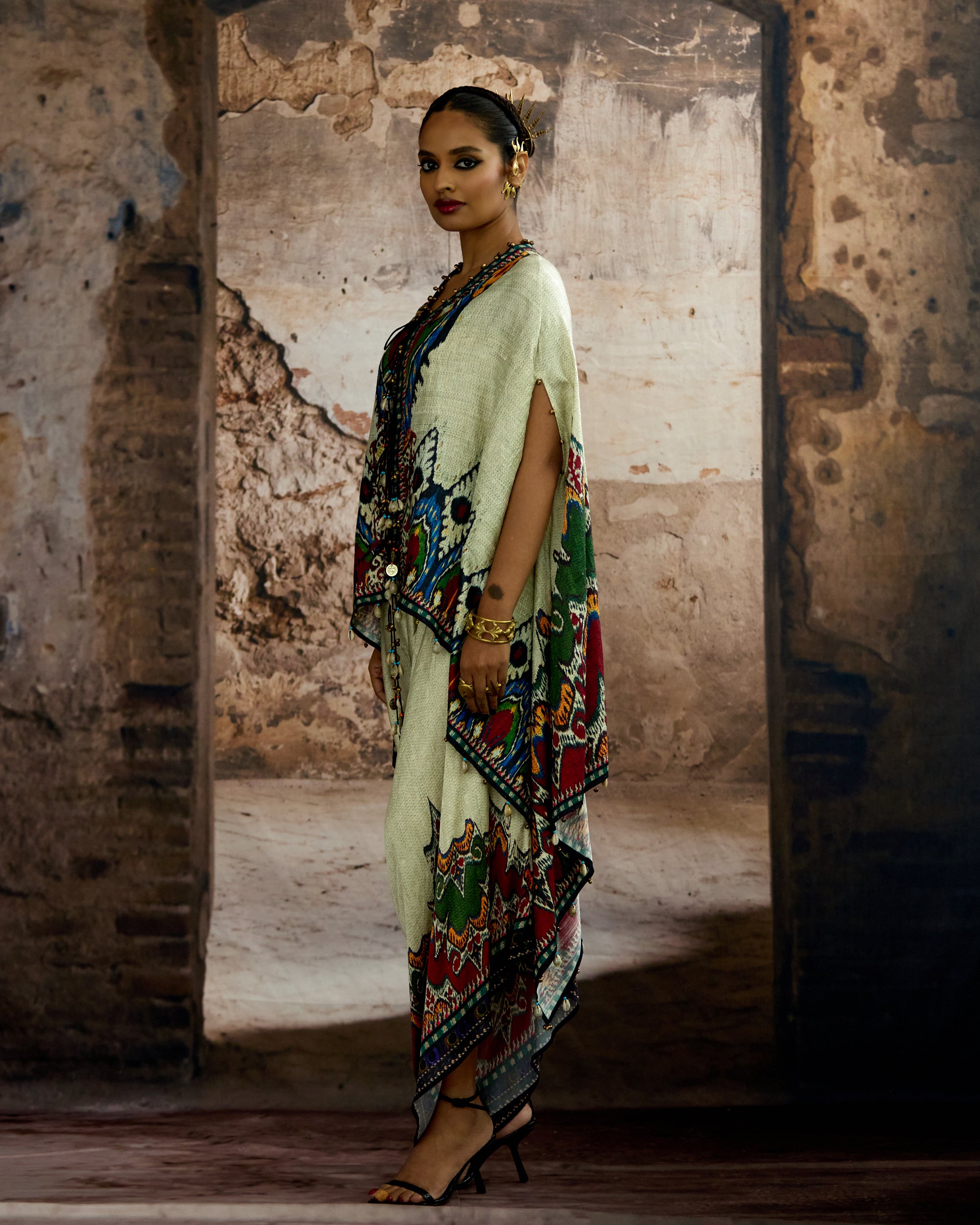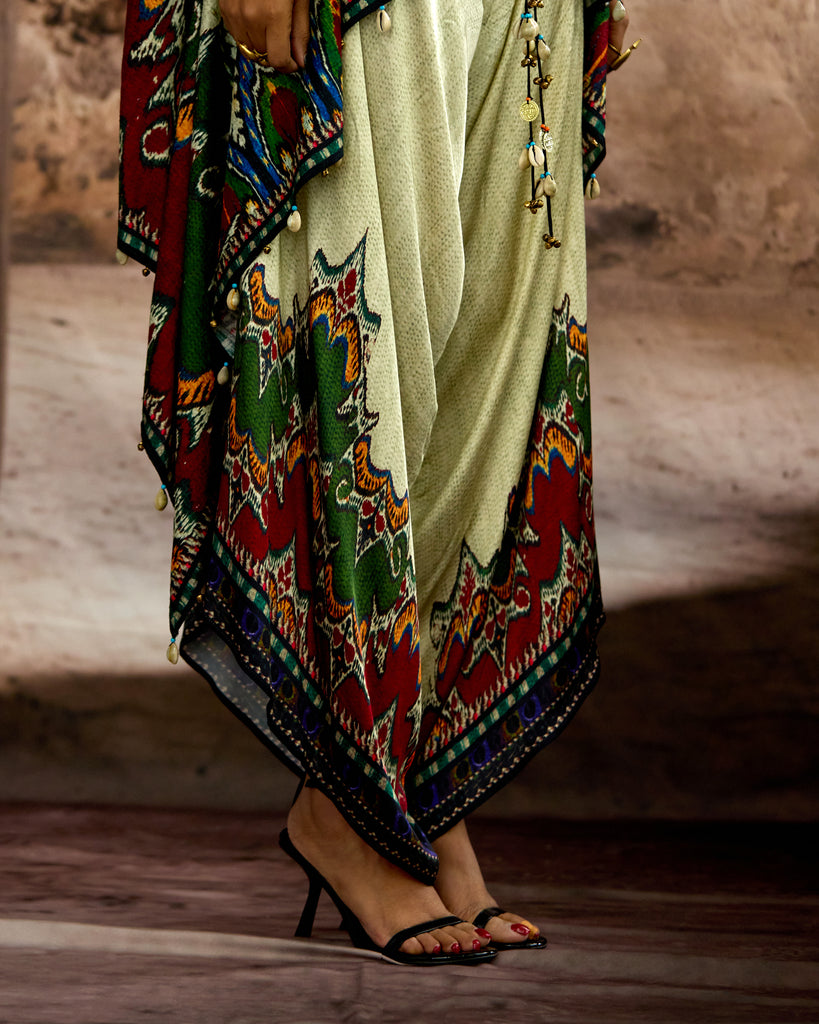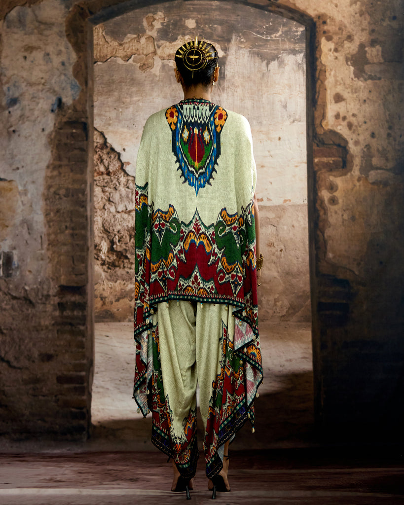 A Printed free sized cape tunic with a front closure teamed with our draped pants as a set. The Cape has a "V" neckline and drop shoulder armhole from the elbow.