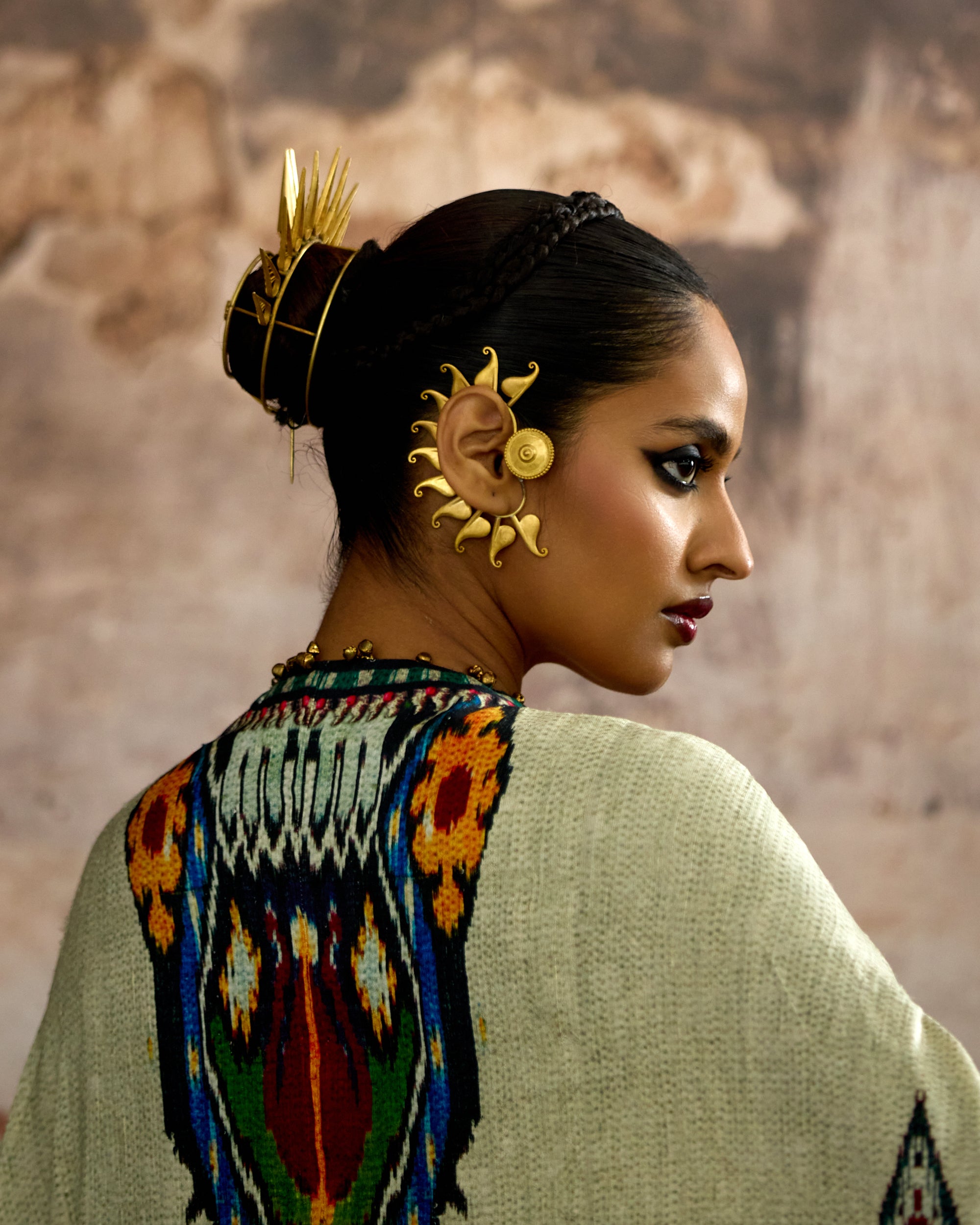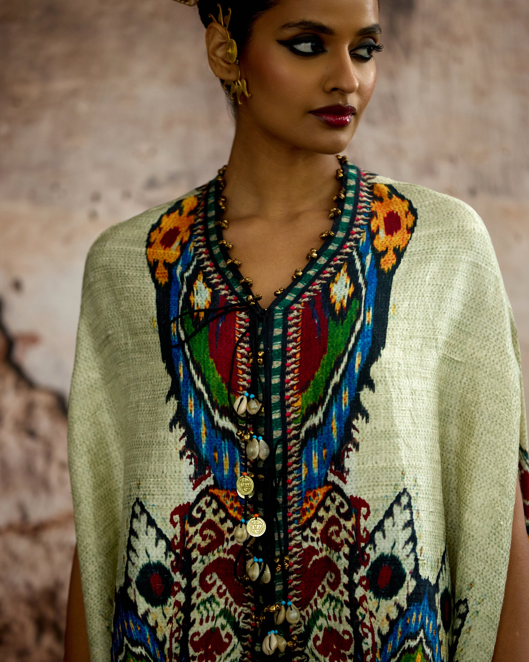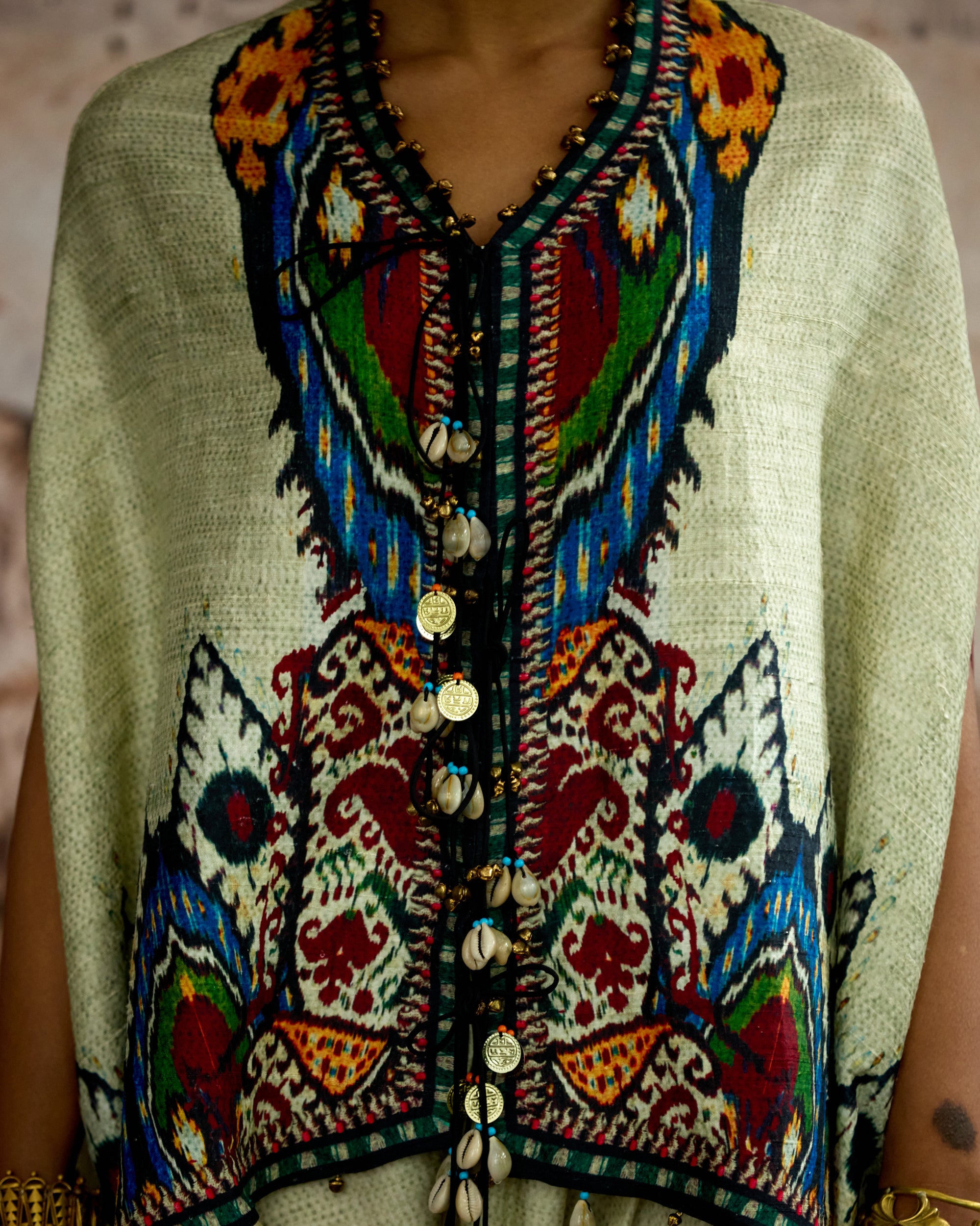 A Printed free sized cape tunic with a front closure teamed with our draped pants as a set. The Cape has a "V" neckline and drop shoulder armhole from the elbow.