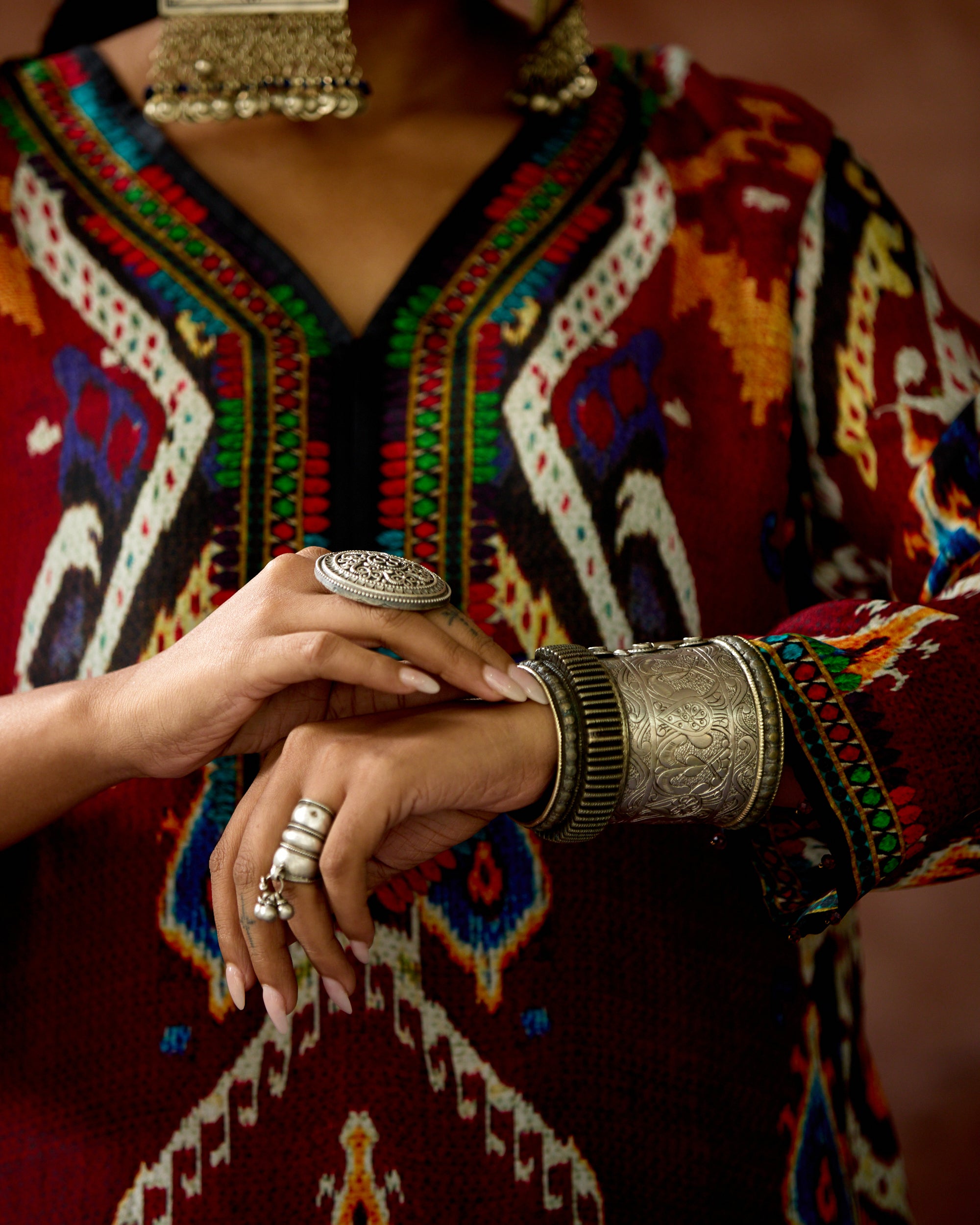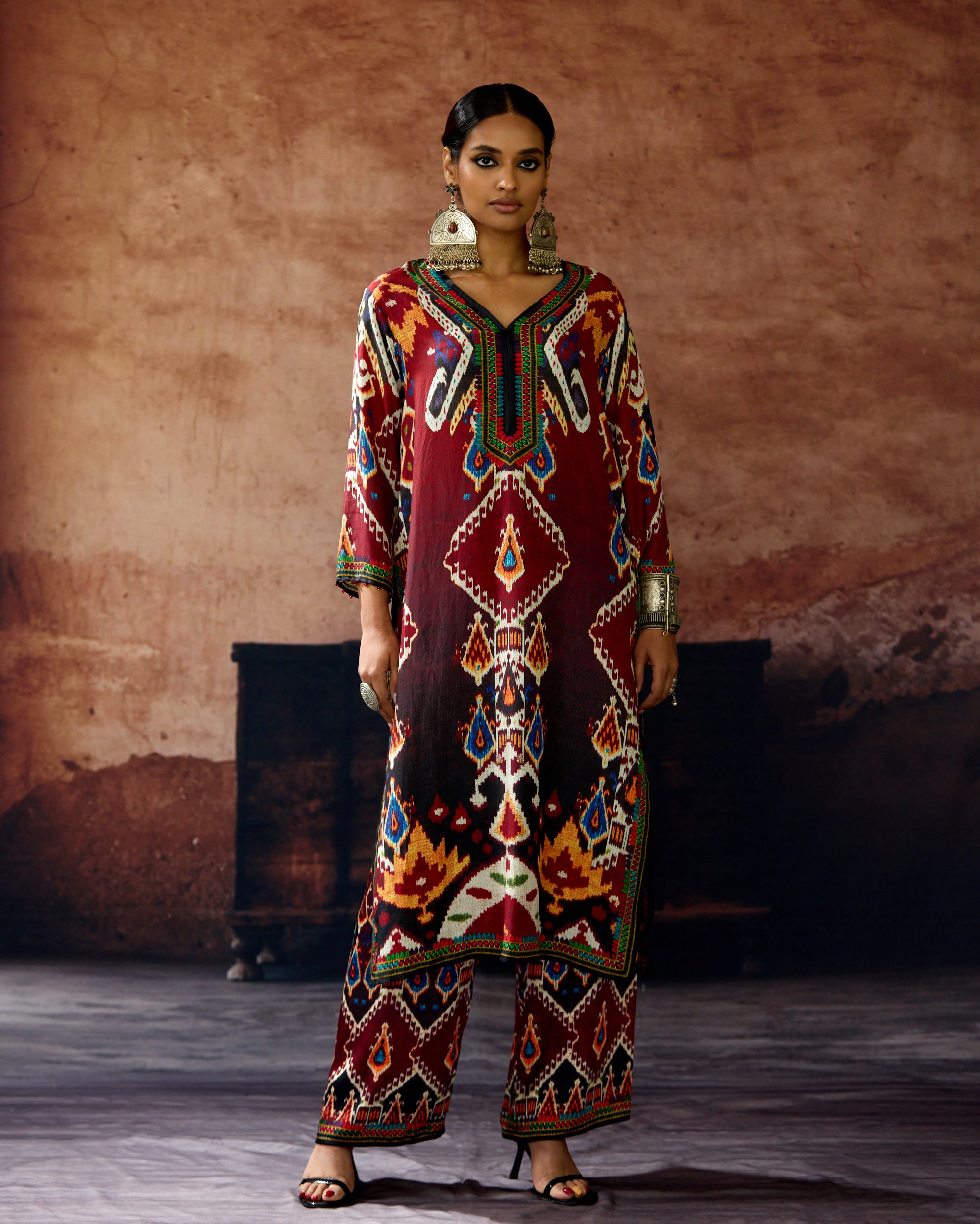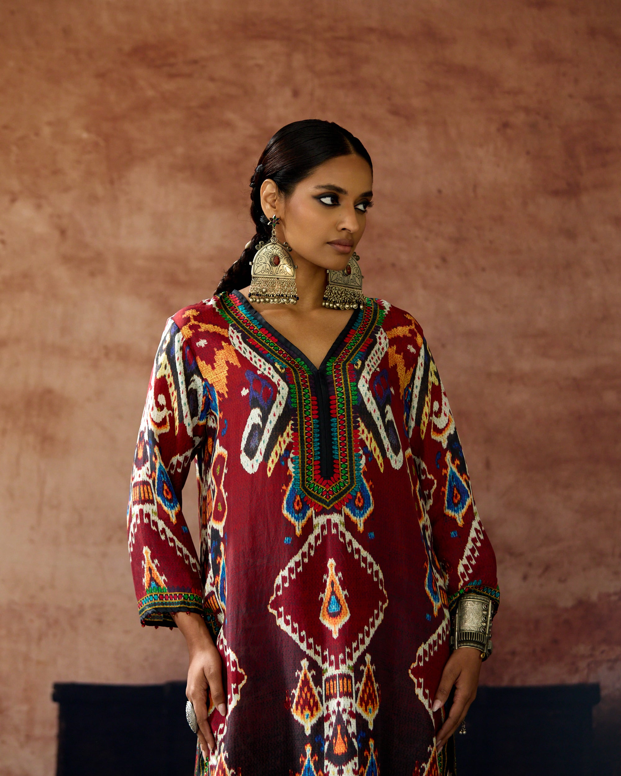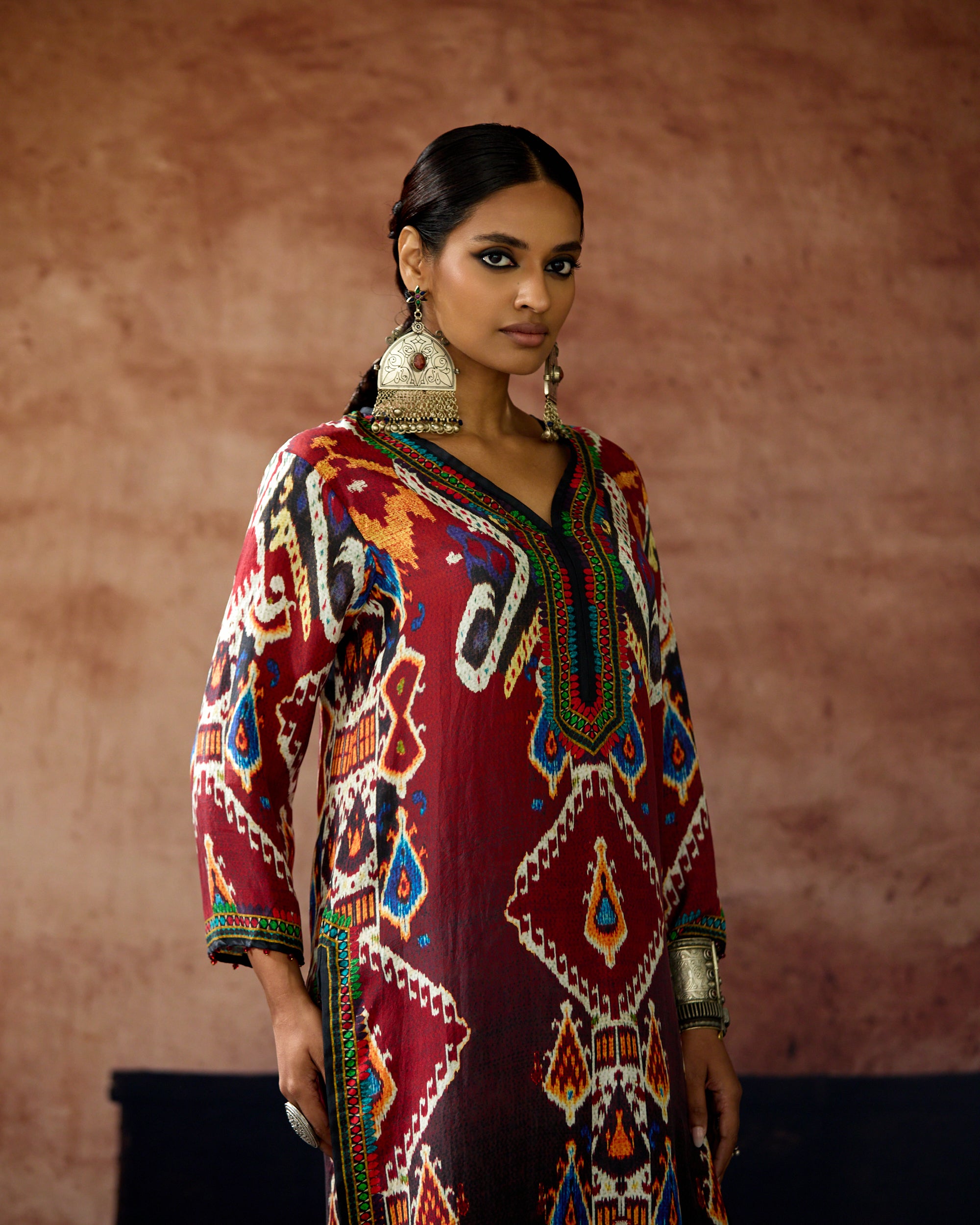 The kurta is a "V" neckline silhouette with 3/4th sleeves and side slits.