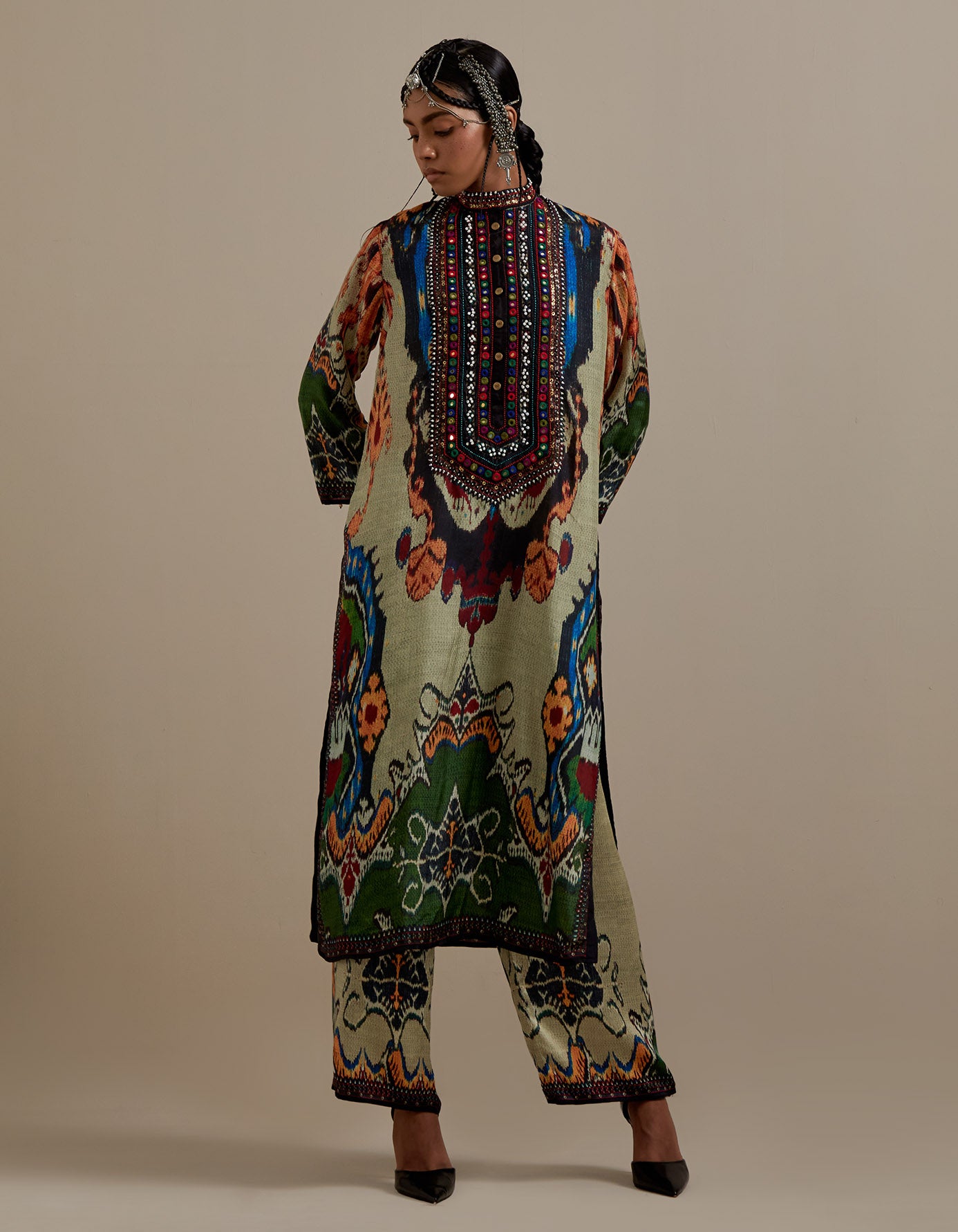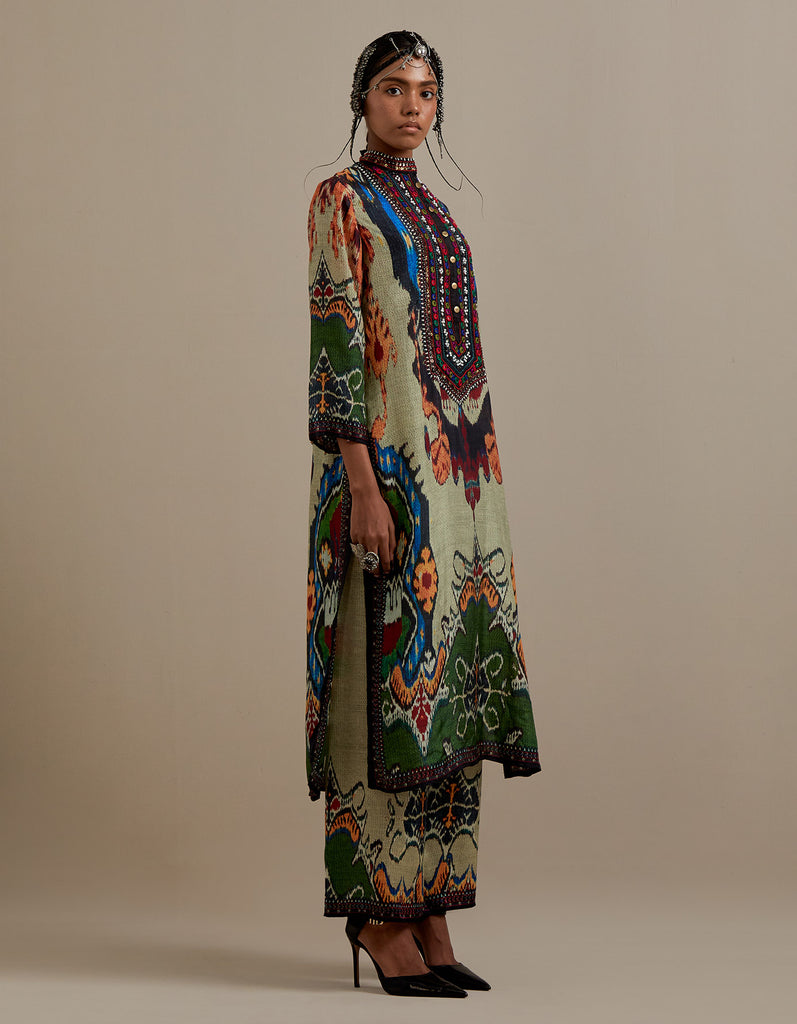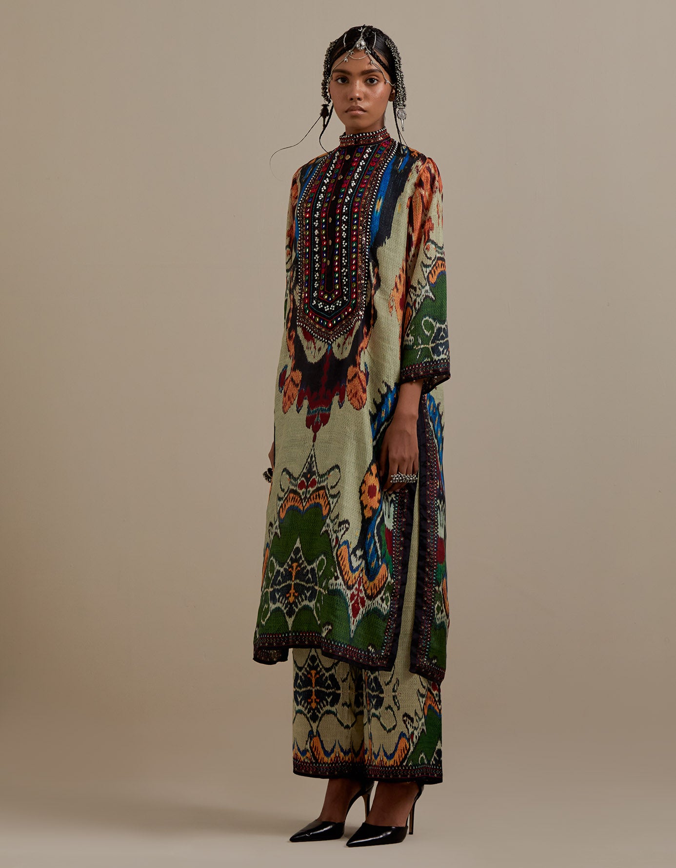 The kurta is a "V" neckline silhouette with 3/4th sleeves and side slits.