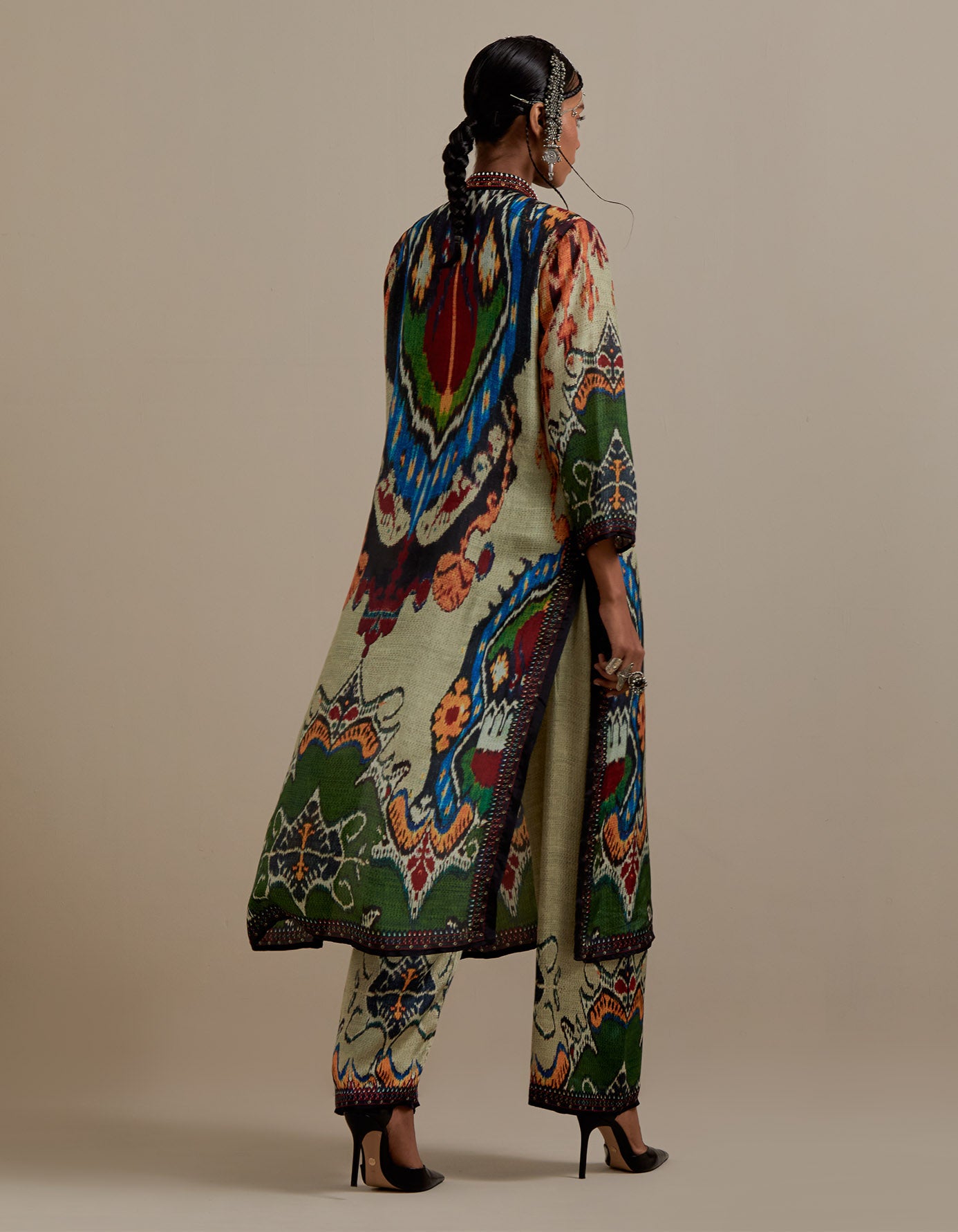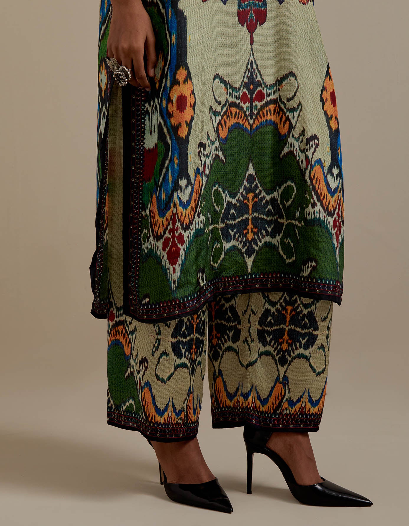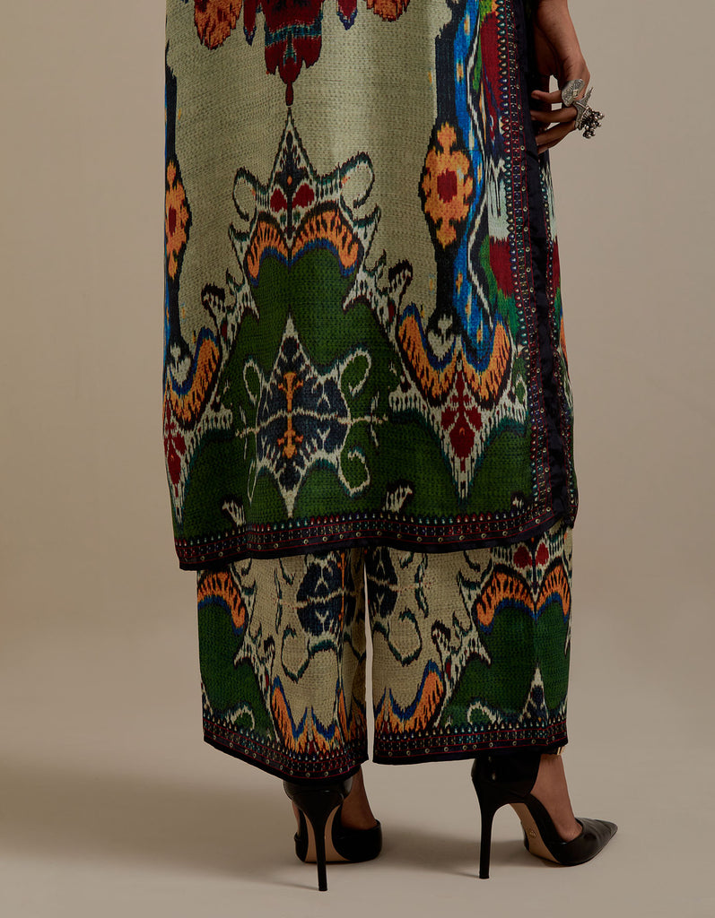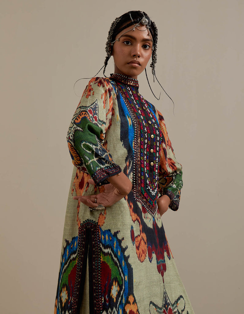 The kurta is a "V" neckline silhouette with 3/4th sleeves and side slits.