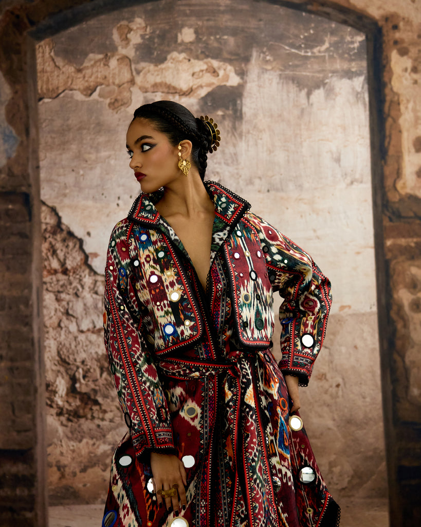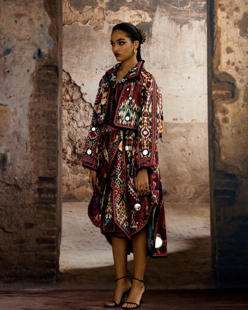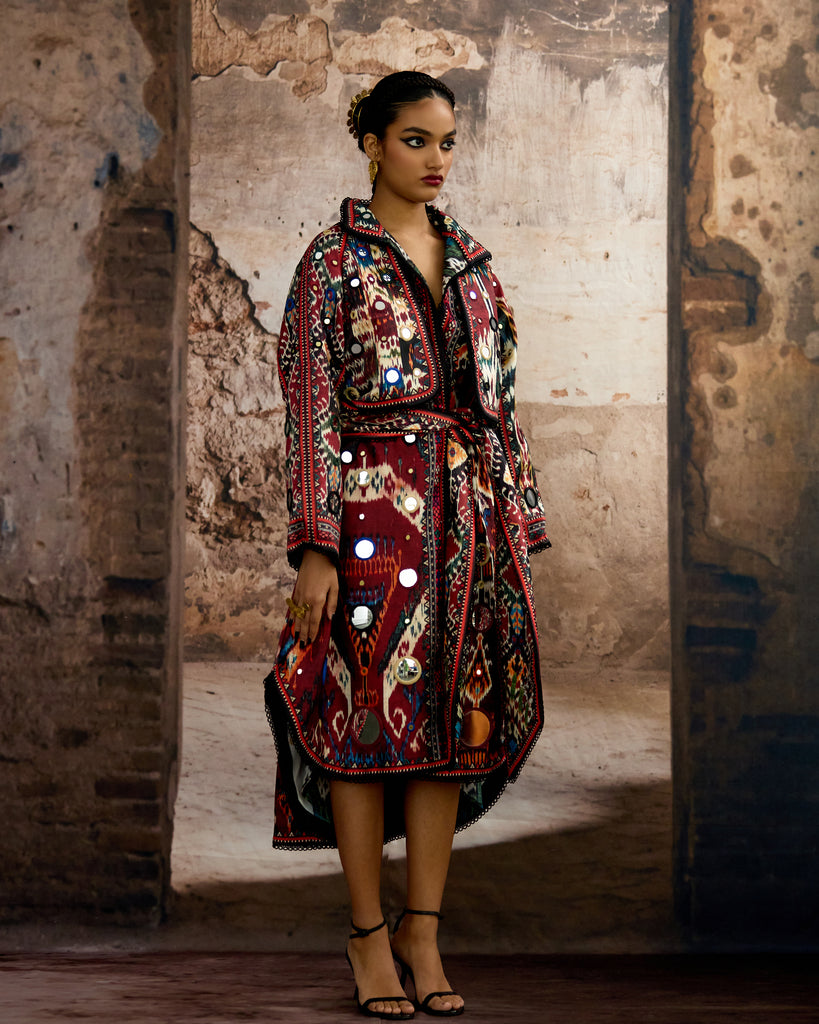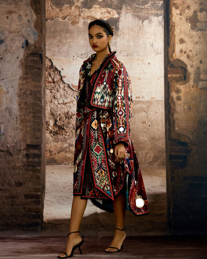 Another Version : The trench Coat is embellished in allover mirror-work embroideryand can be ordered from the drop down menu.