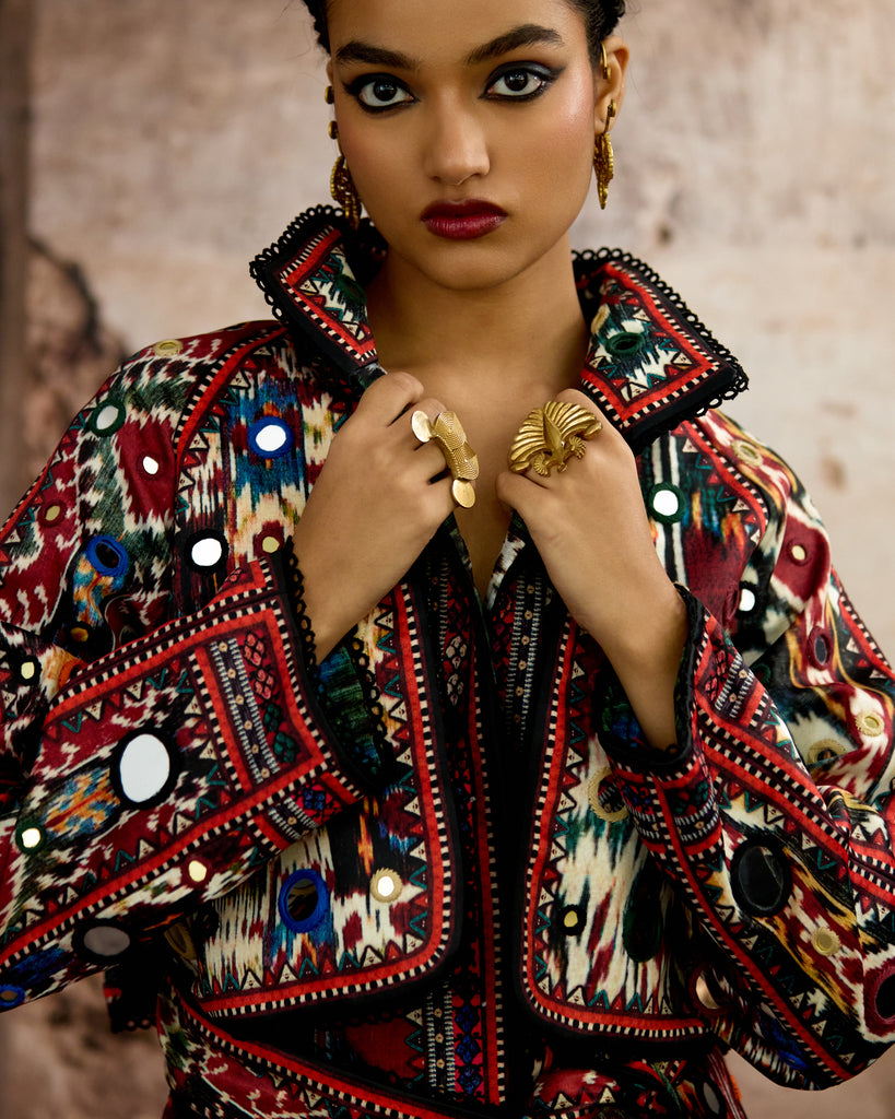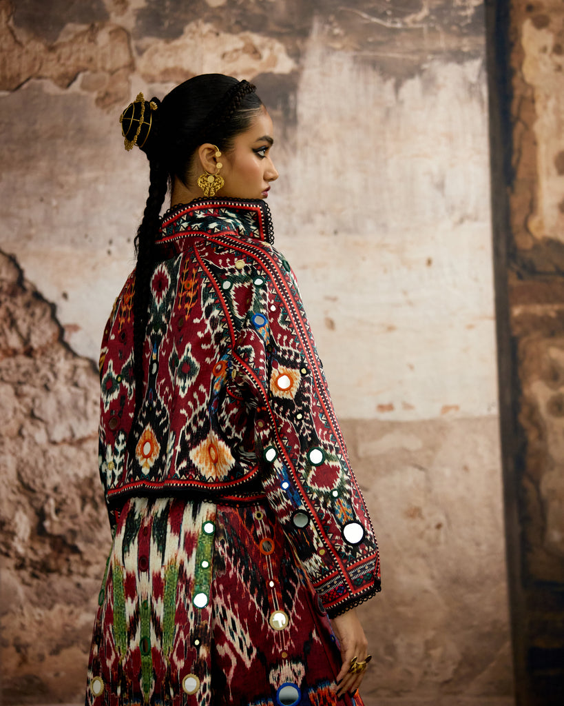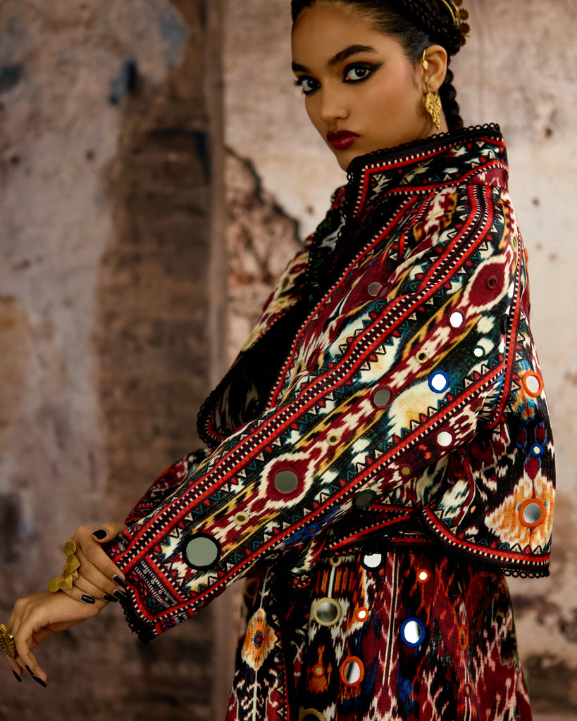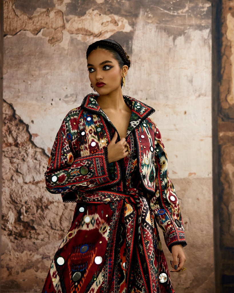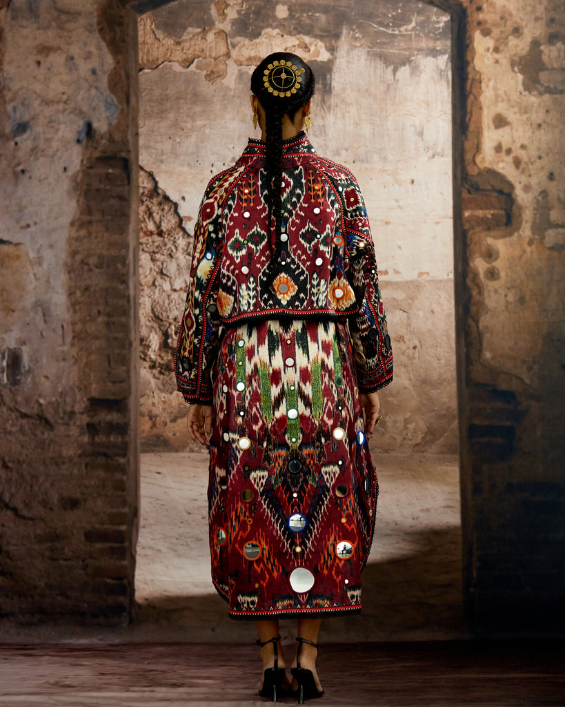 Another Version : The trench Coat is embellished in allover mirror-work embroideryand can be ordered from the drop down menu.