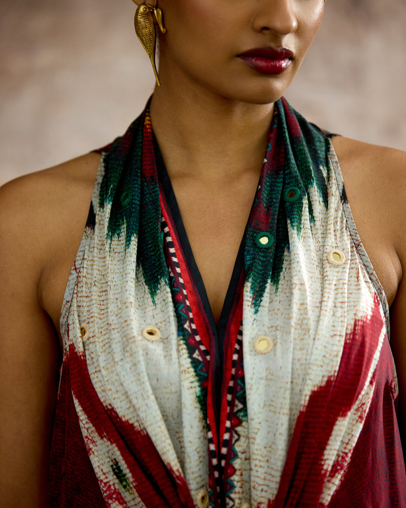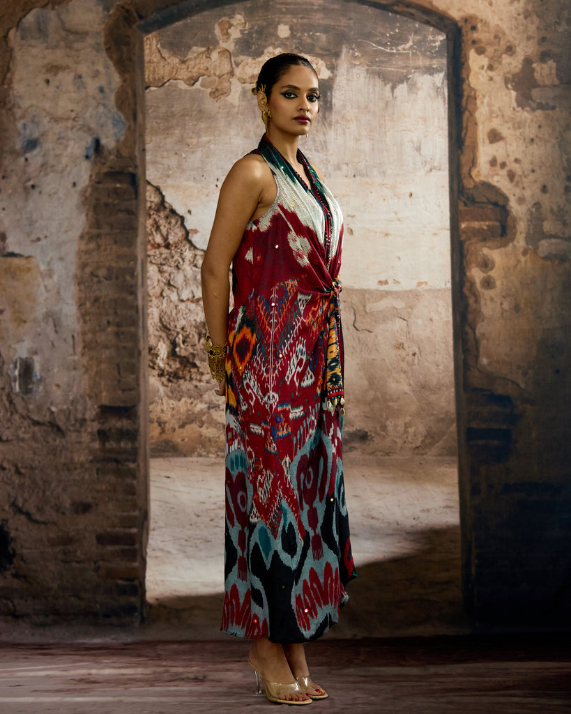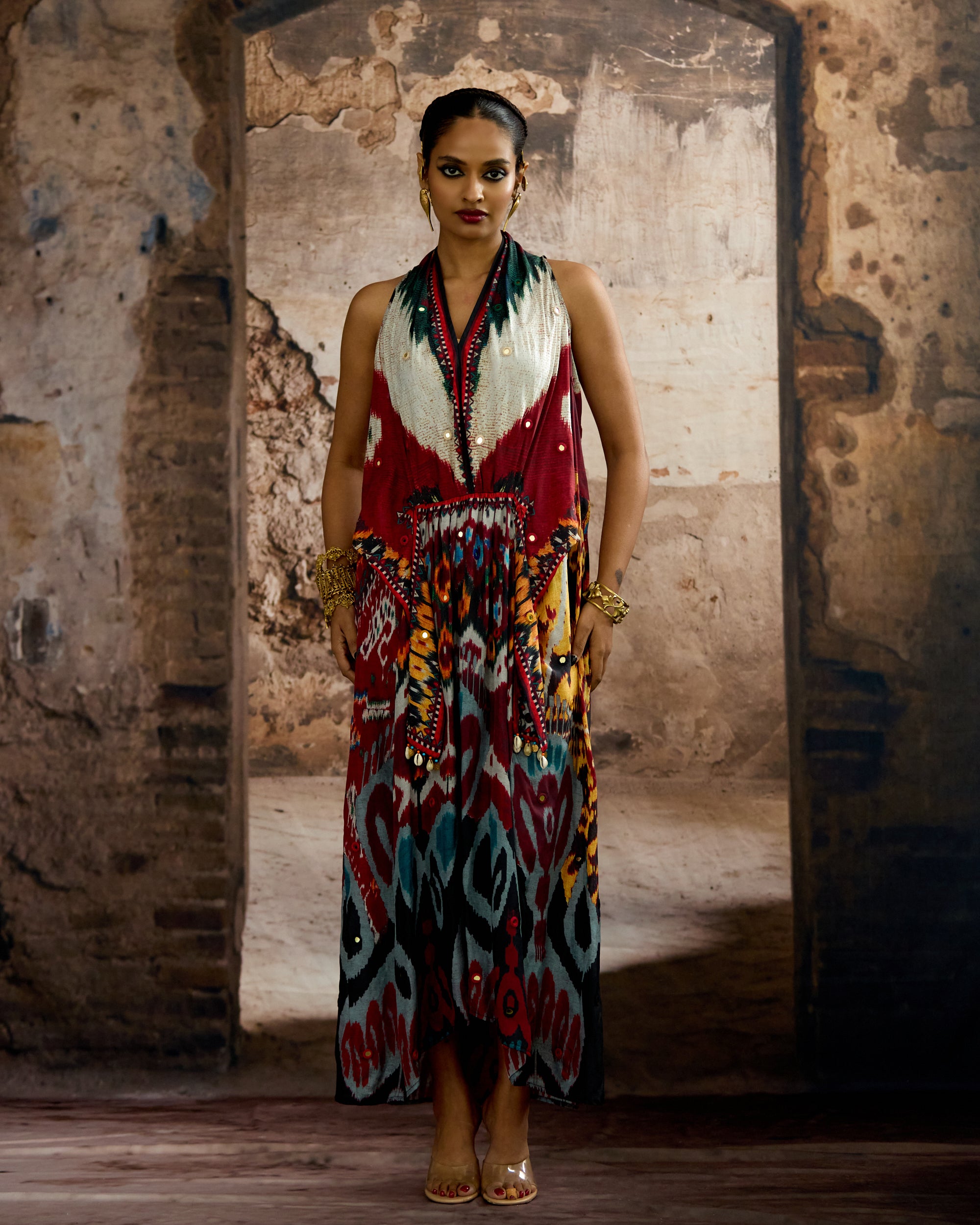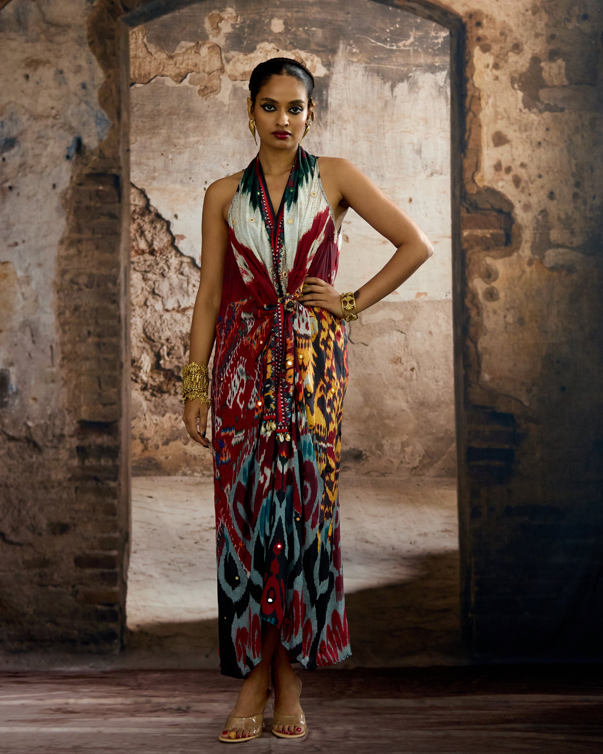 The Trinika draped dress is a printed halter dress with a draped tye to shape the waist and has front slits after the knee. (no embroidery)