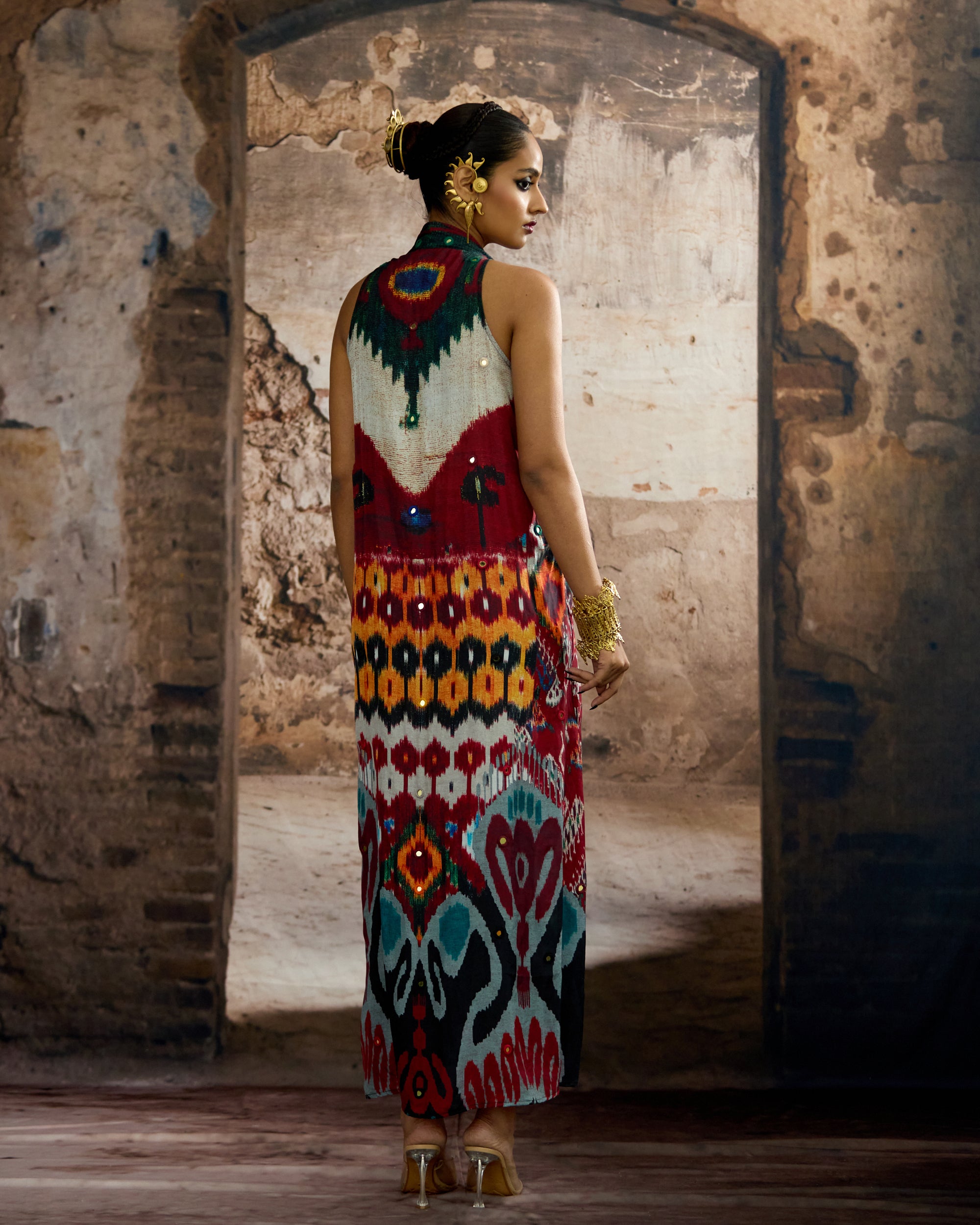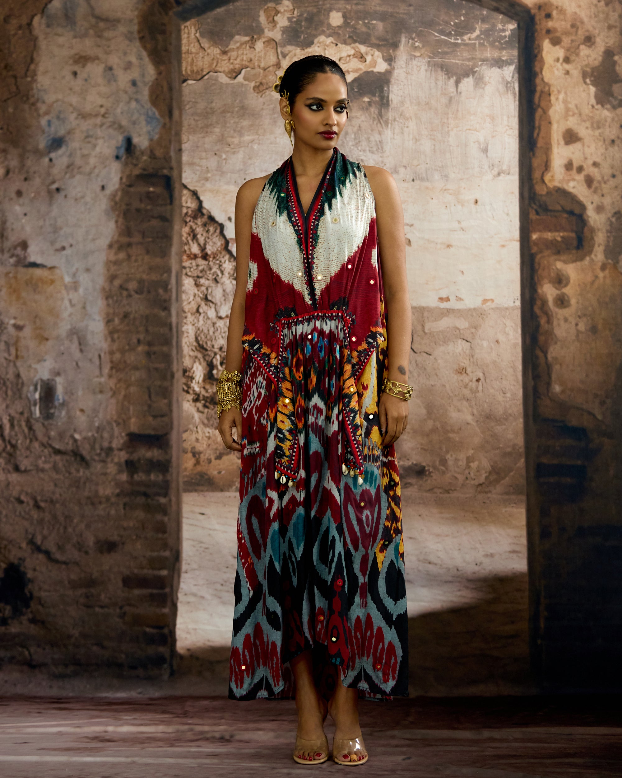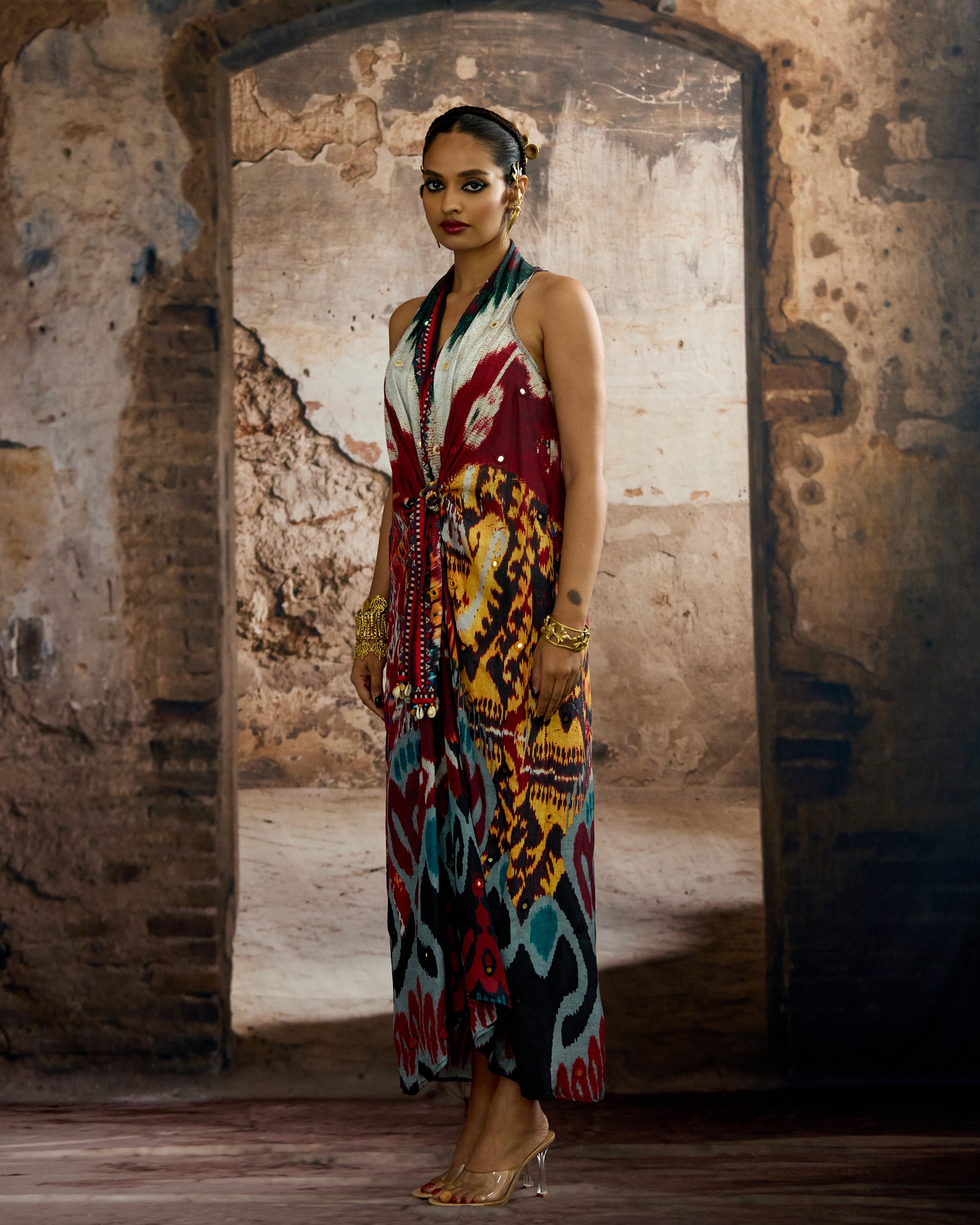 The Trinika draped dress is a printed halter dress with a draped tye to shape the waist and has front slits after the knee. (no embroidery)