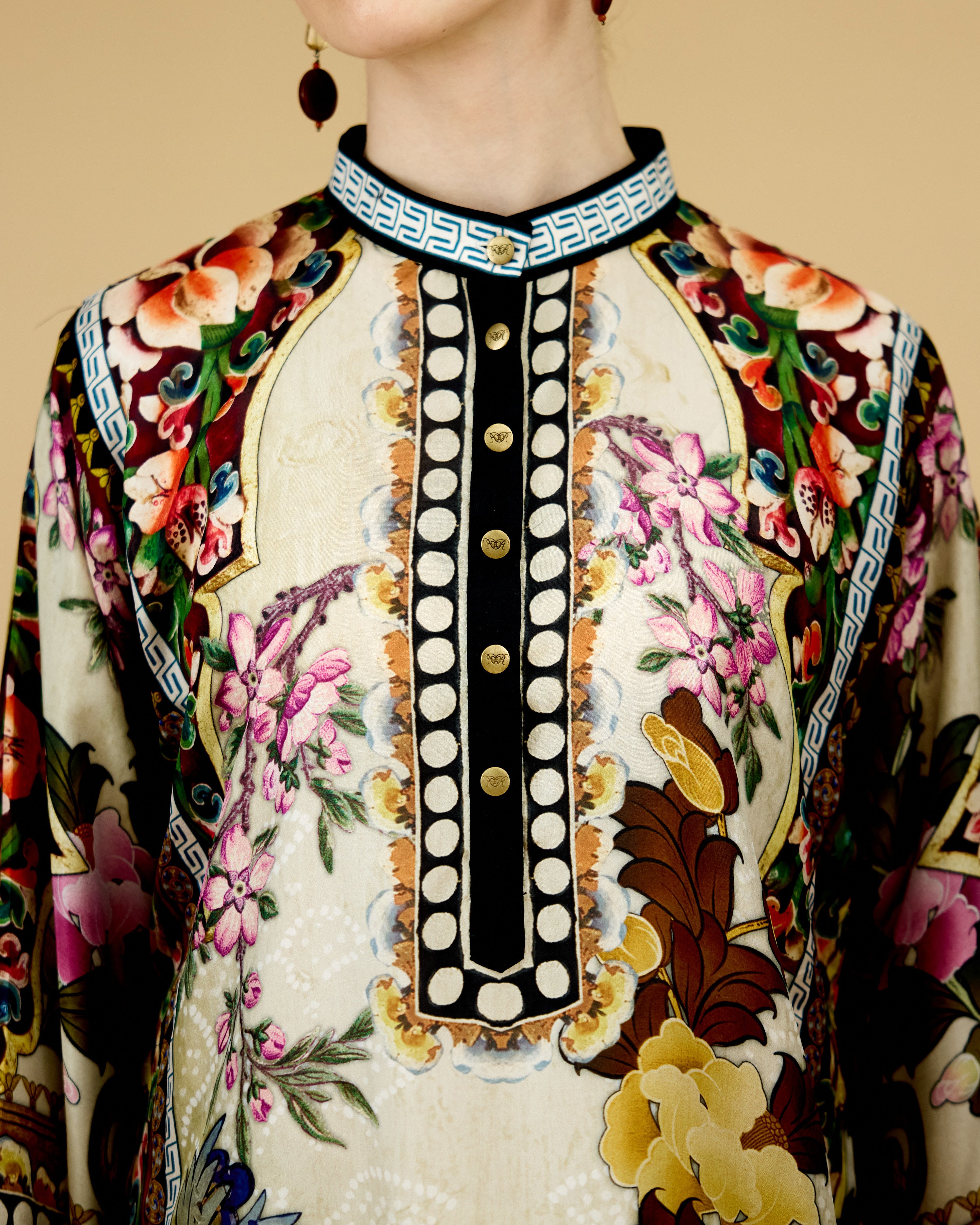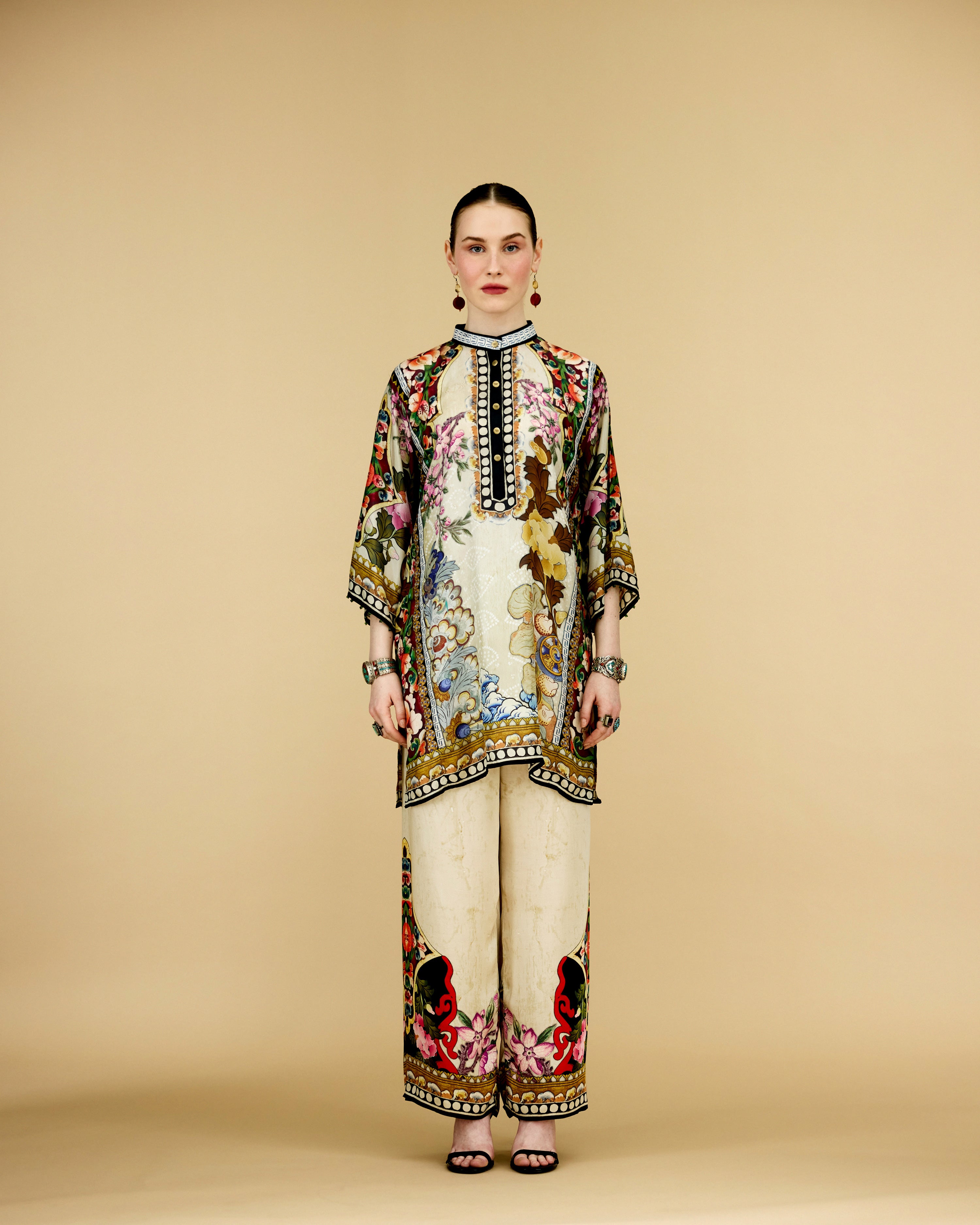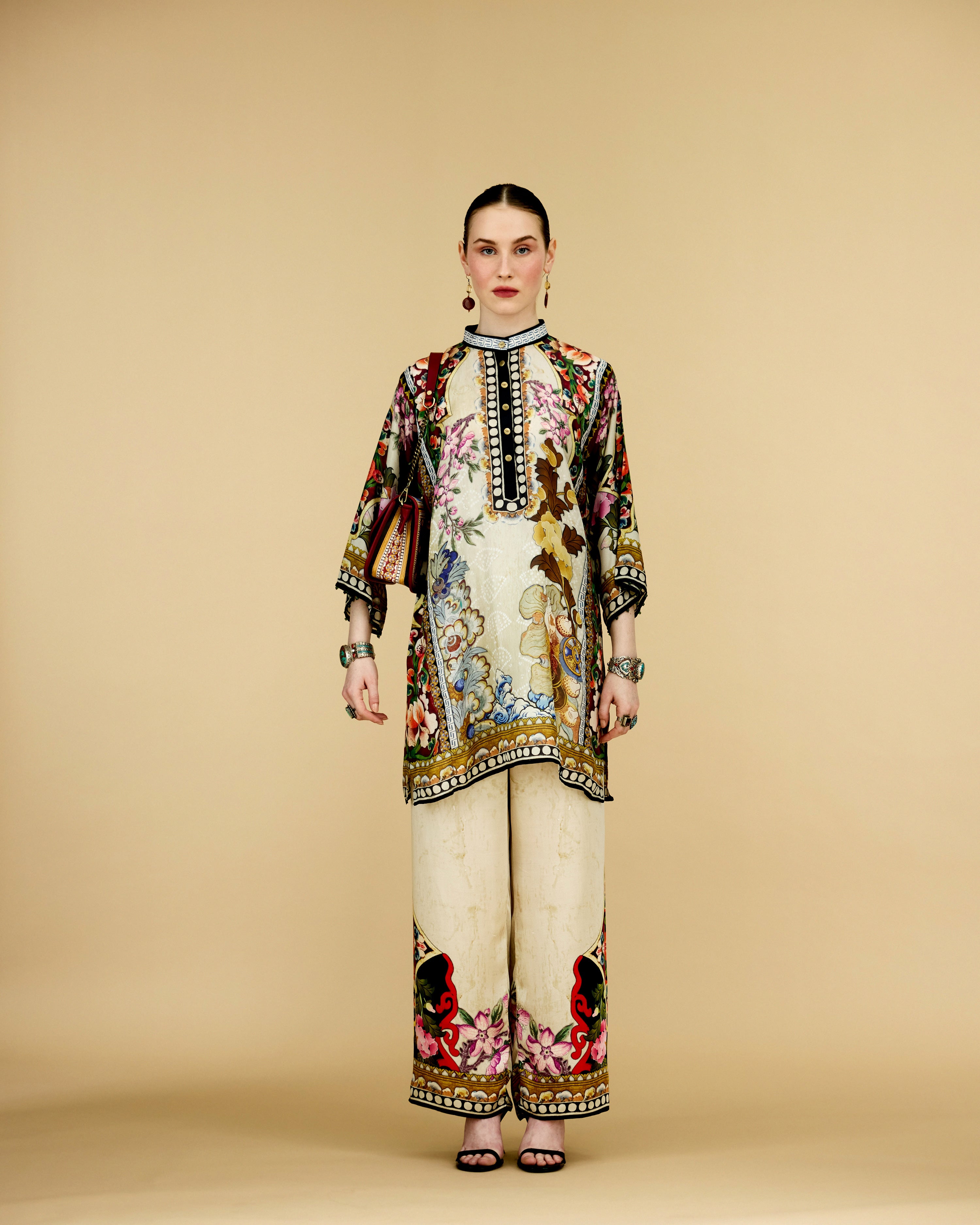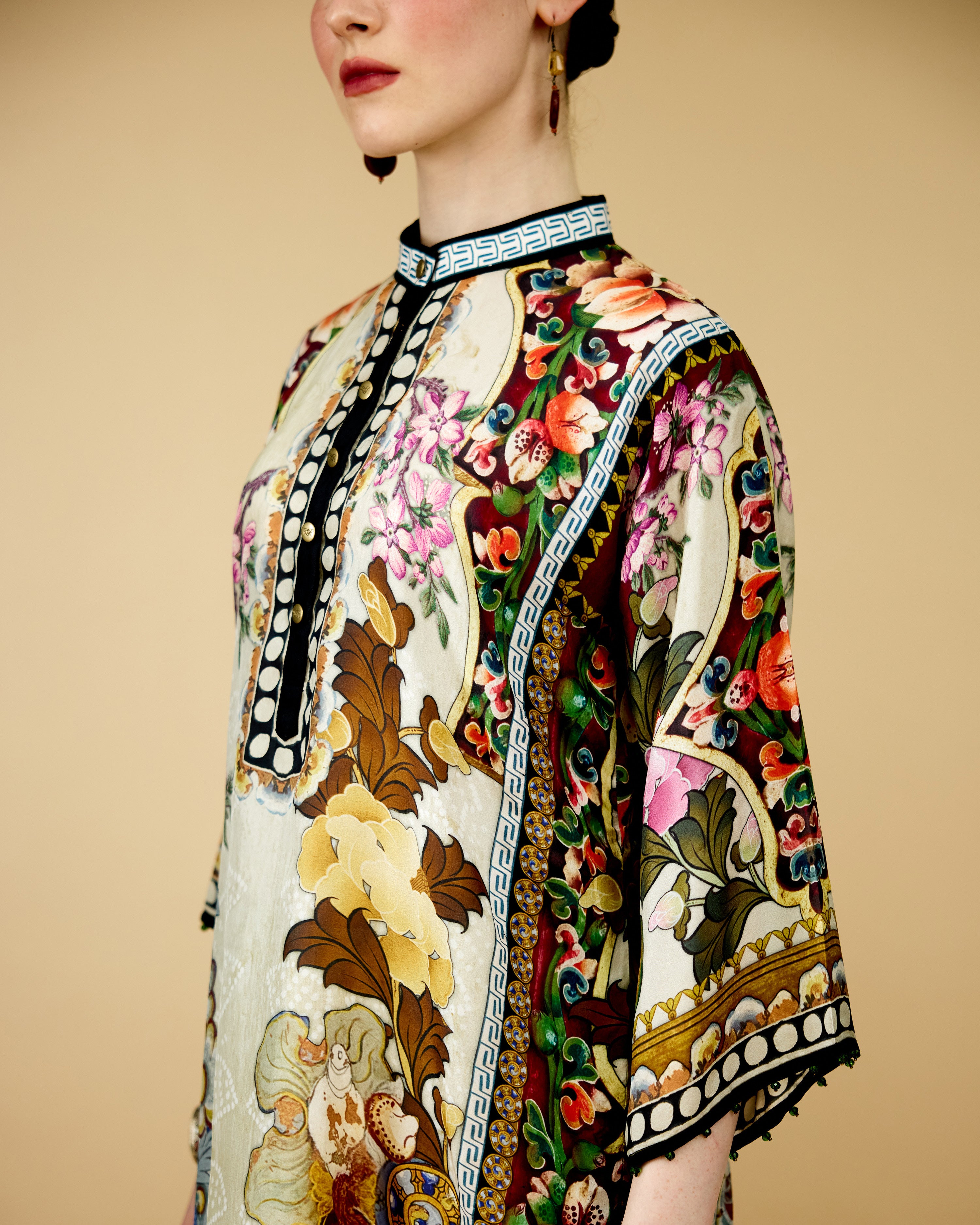 The tunic has a lovely mandarin collar with a front button placket neckline.