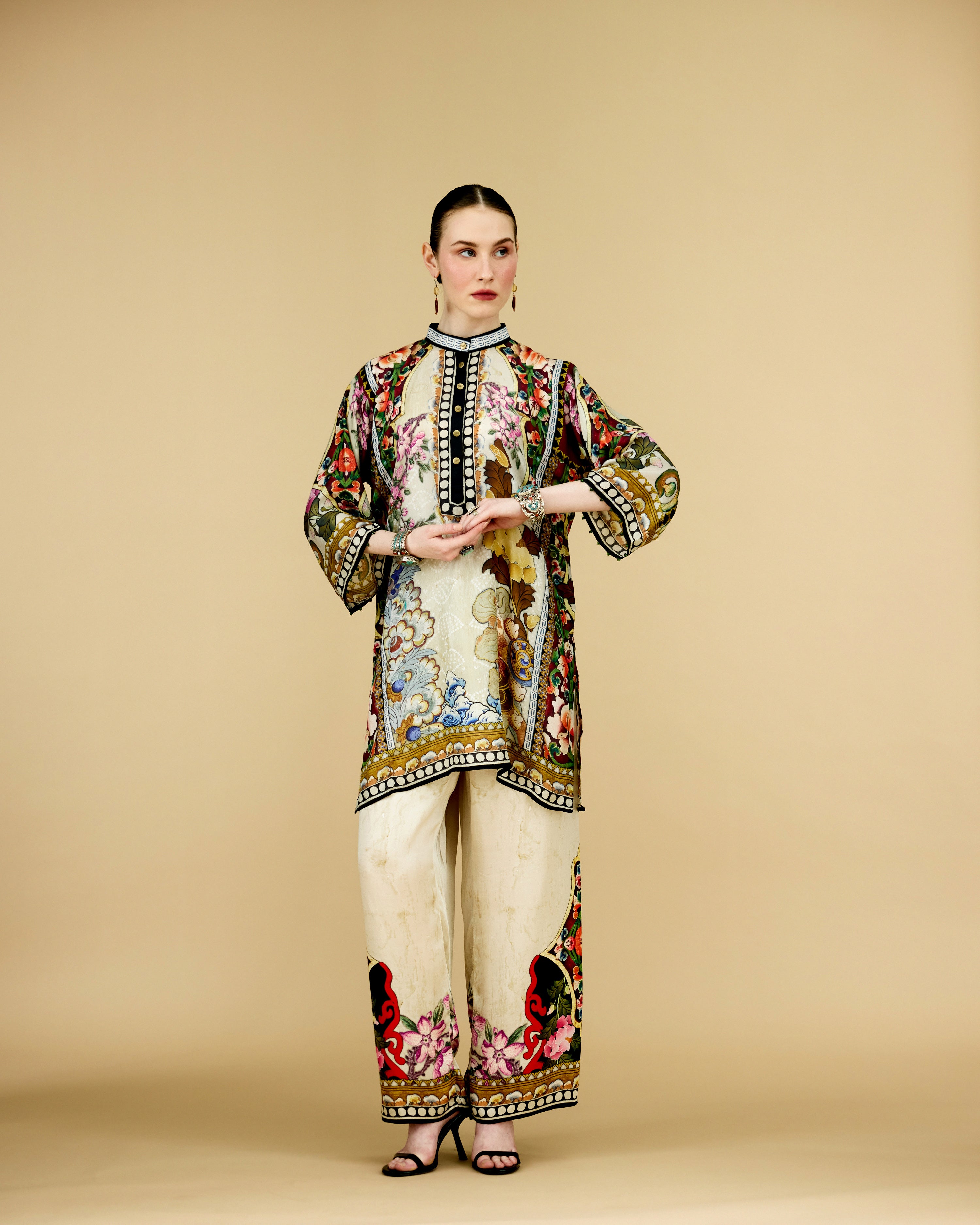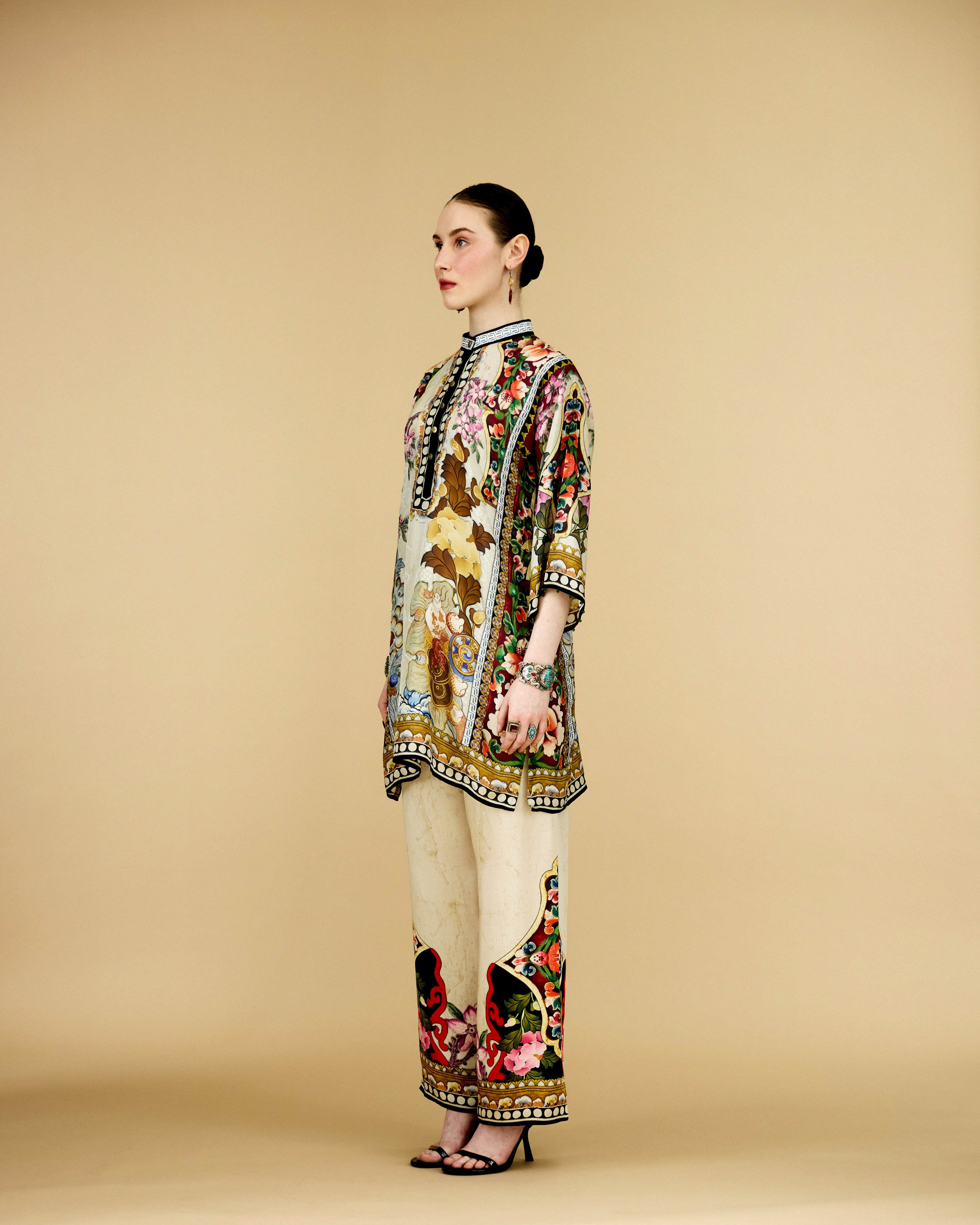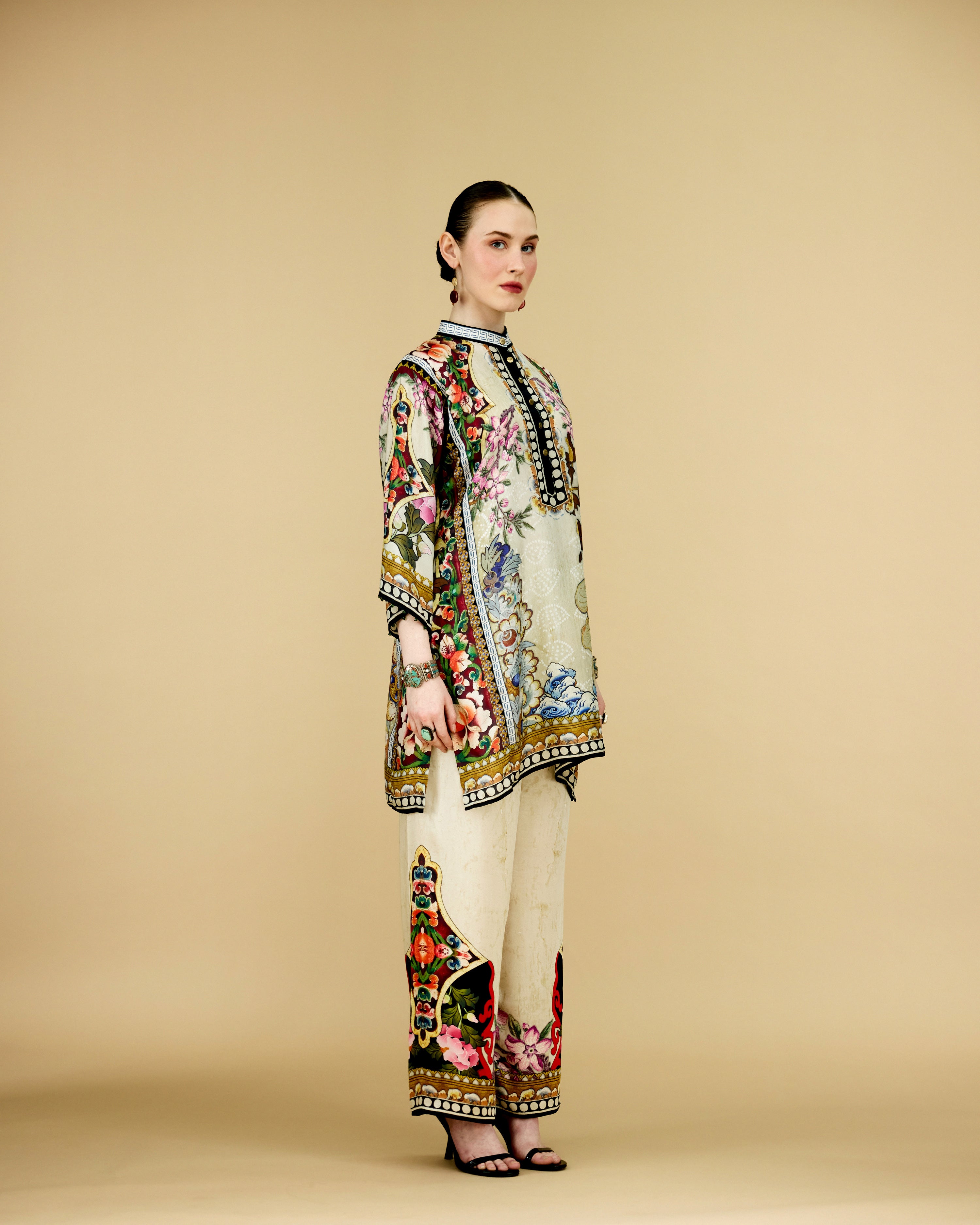 The tunic has a lovely mandarin collar with a front button placket neckline.