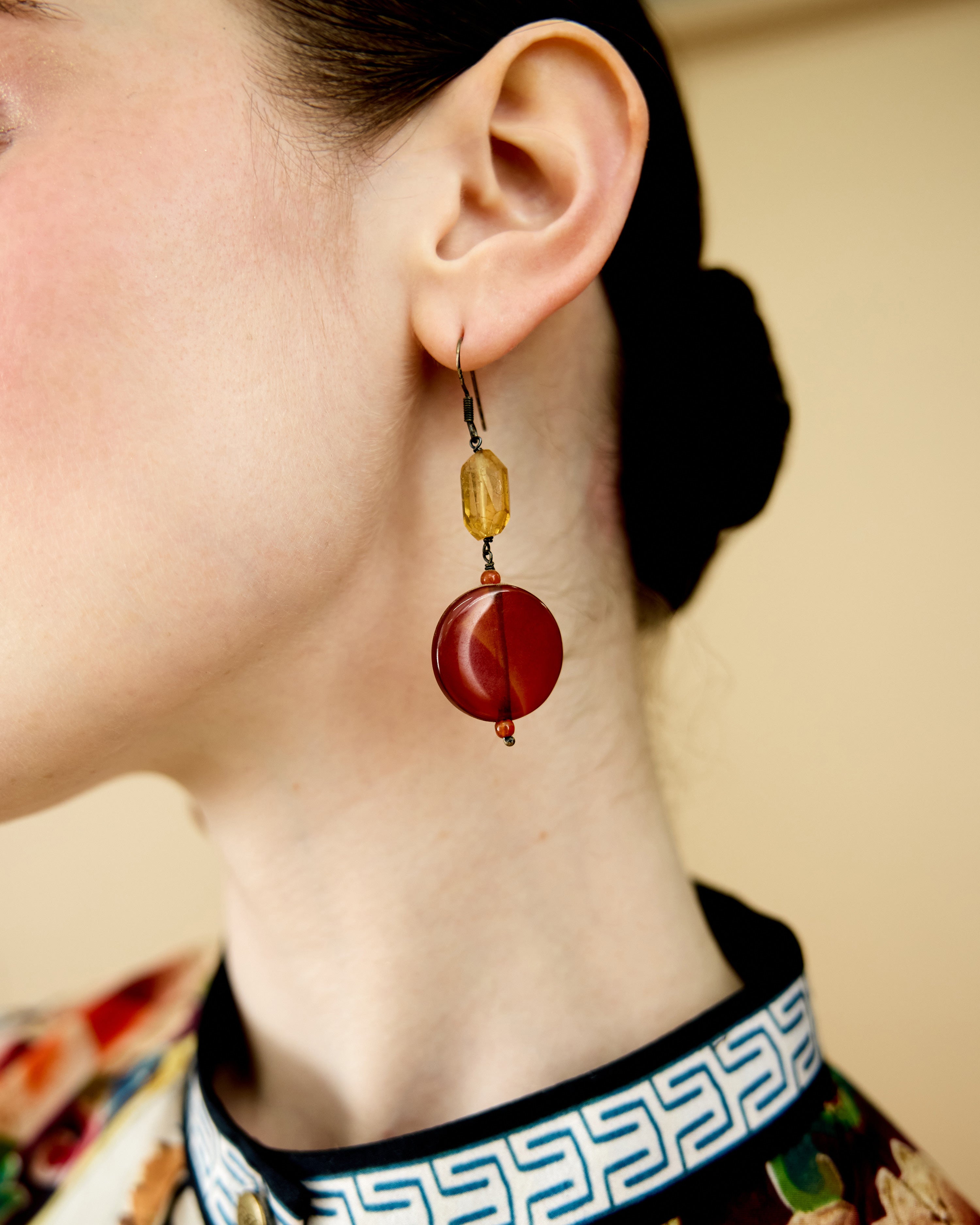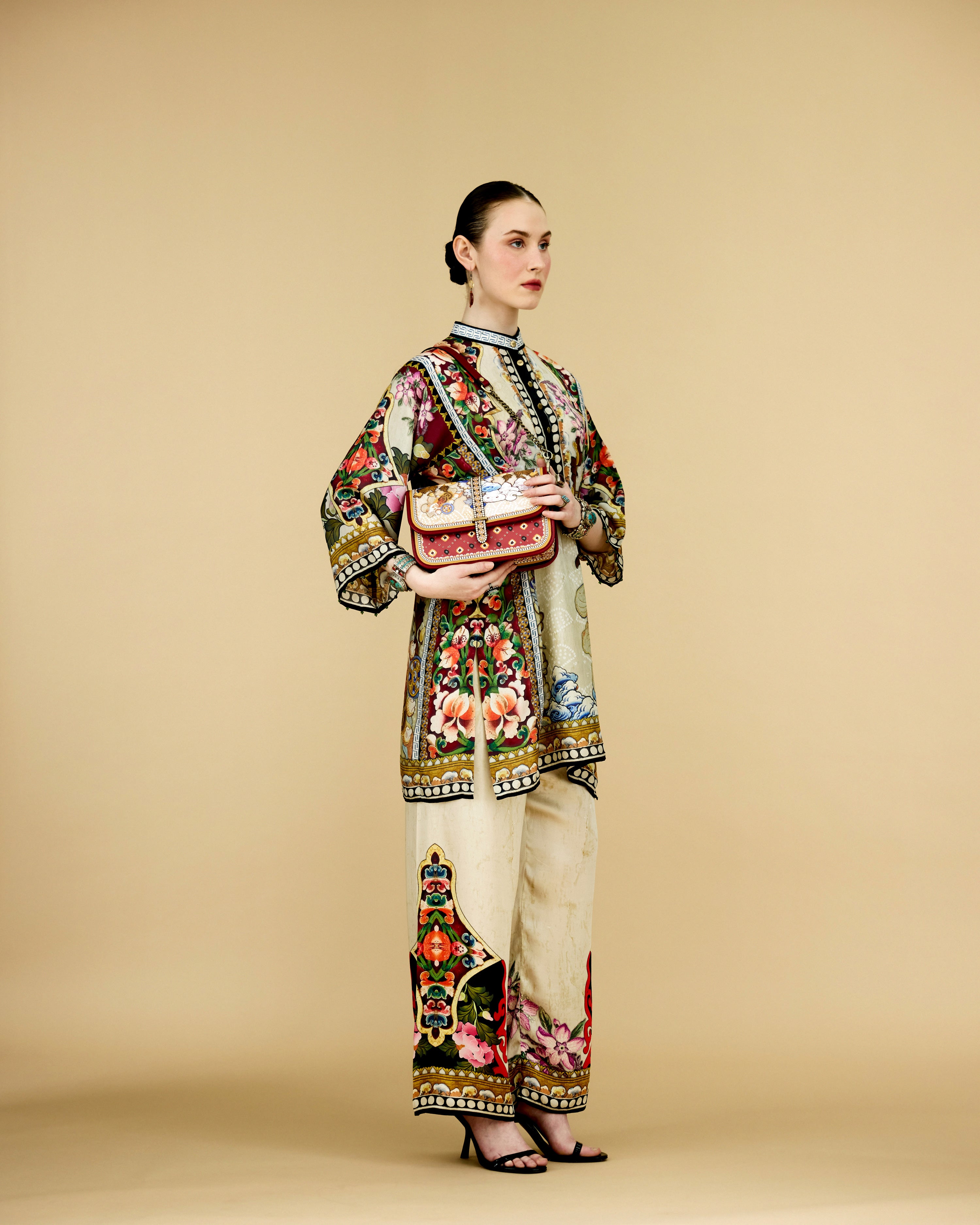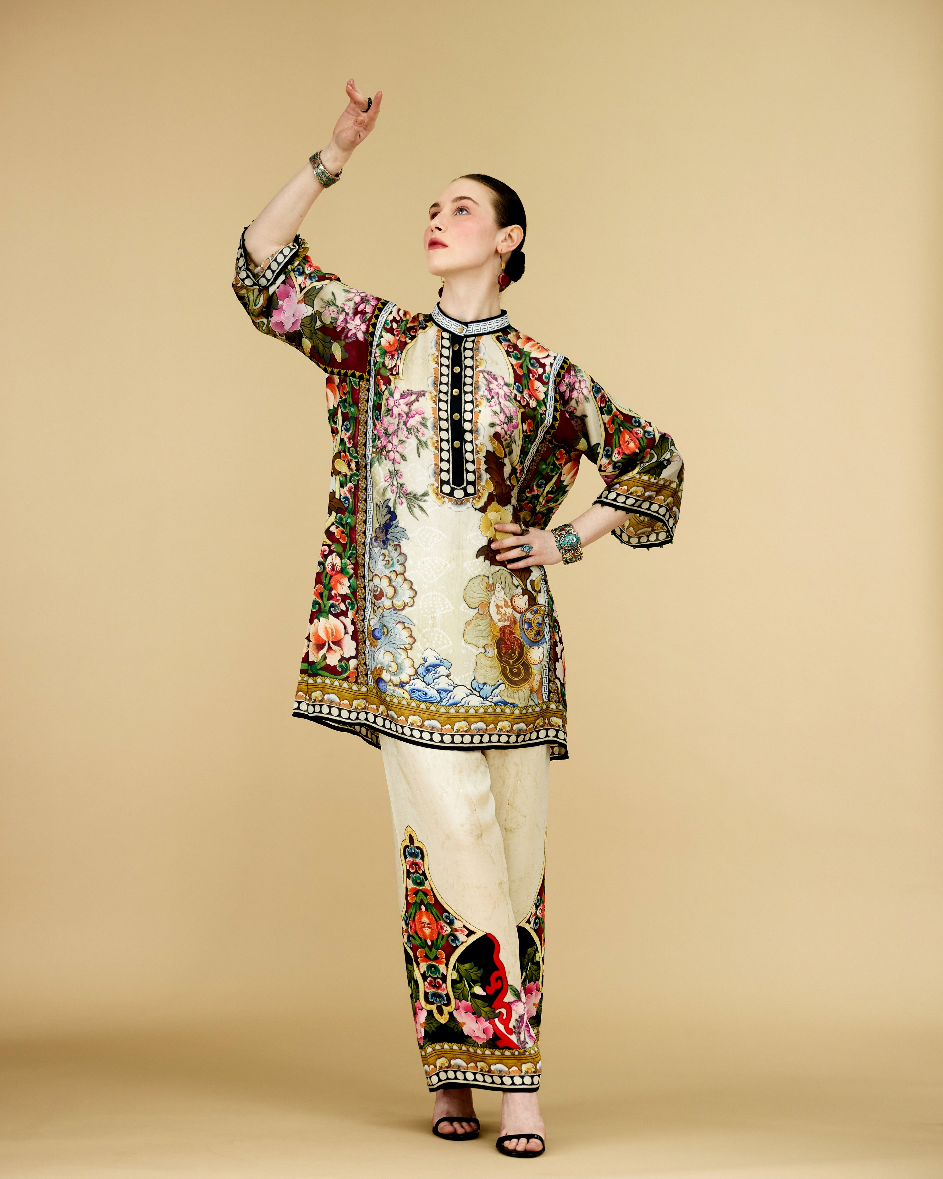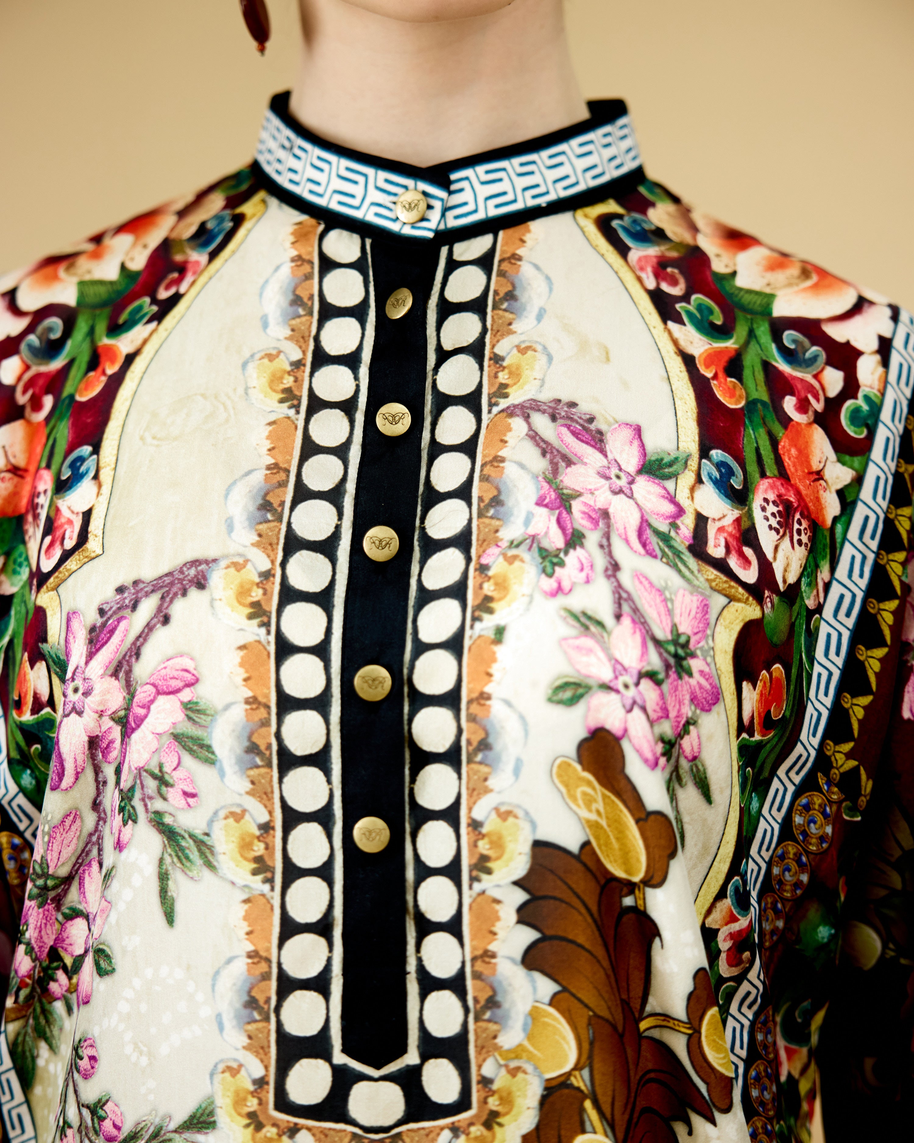The tunic has a lovely mandarin collar with a front button placket neckline.