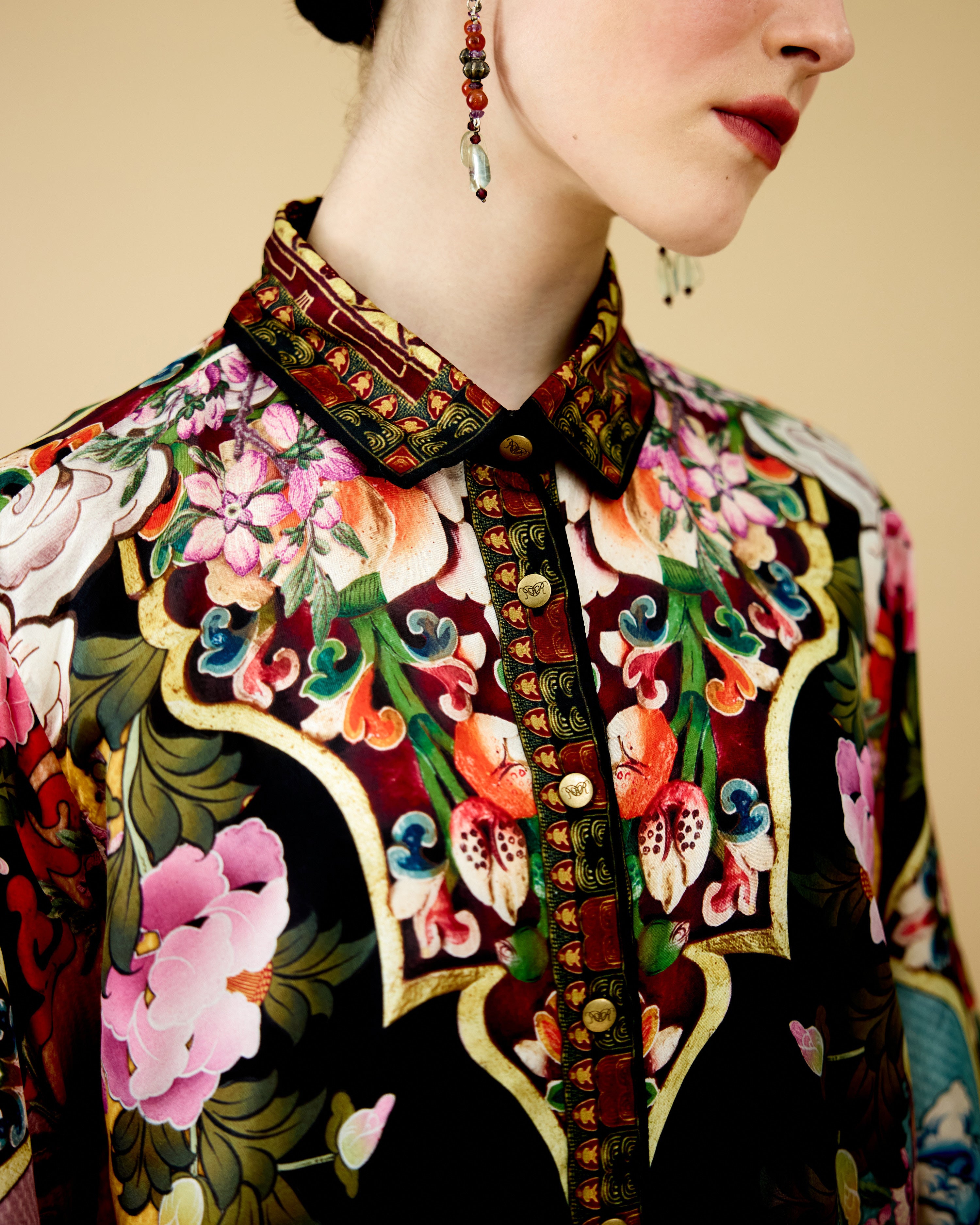 The printed shirt has a button front with a collar and long sleeves.