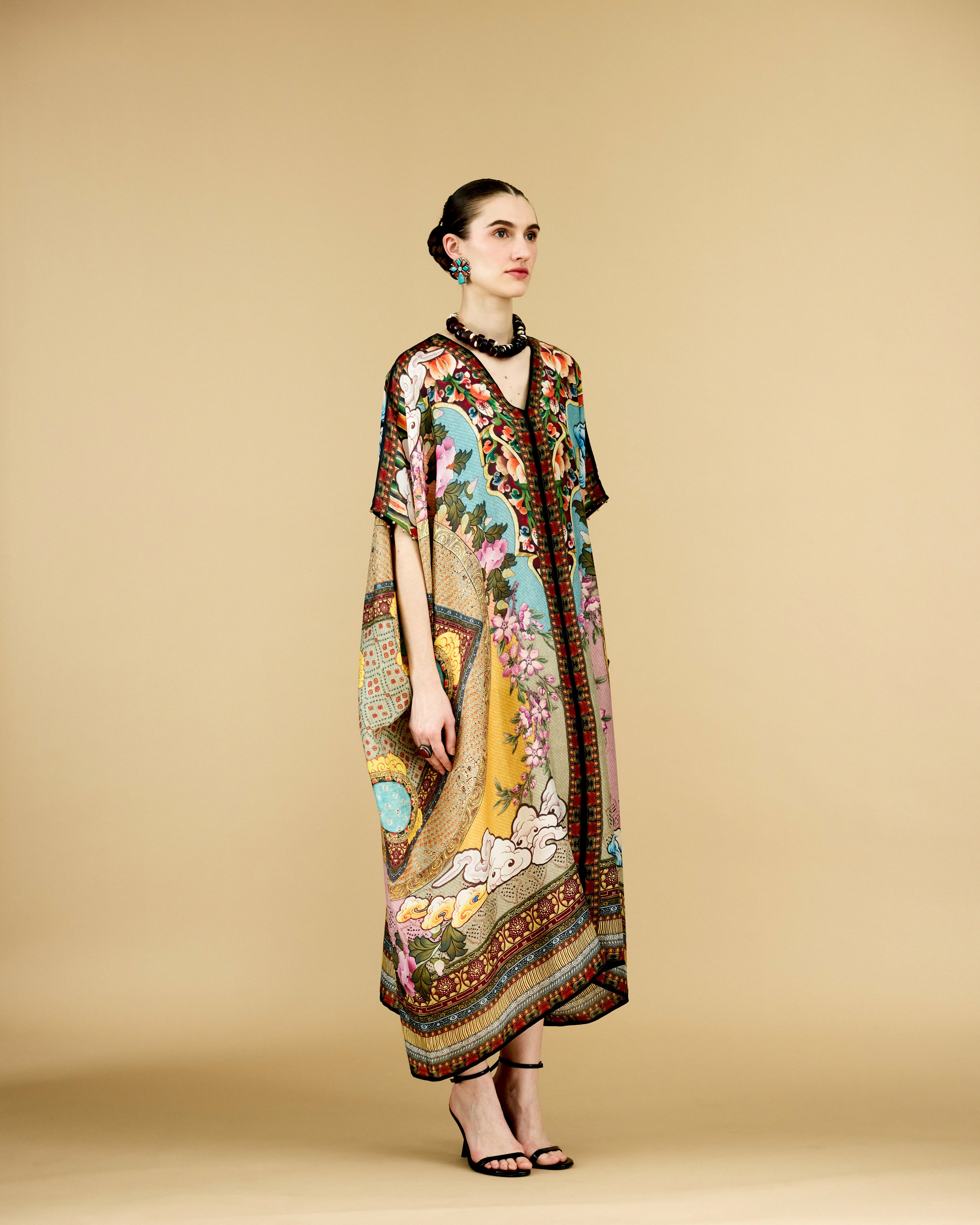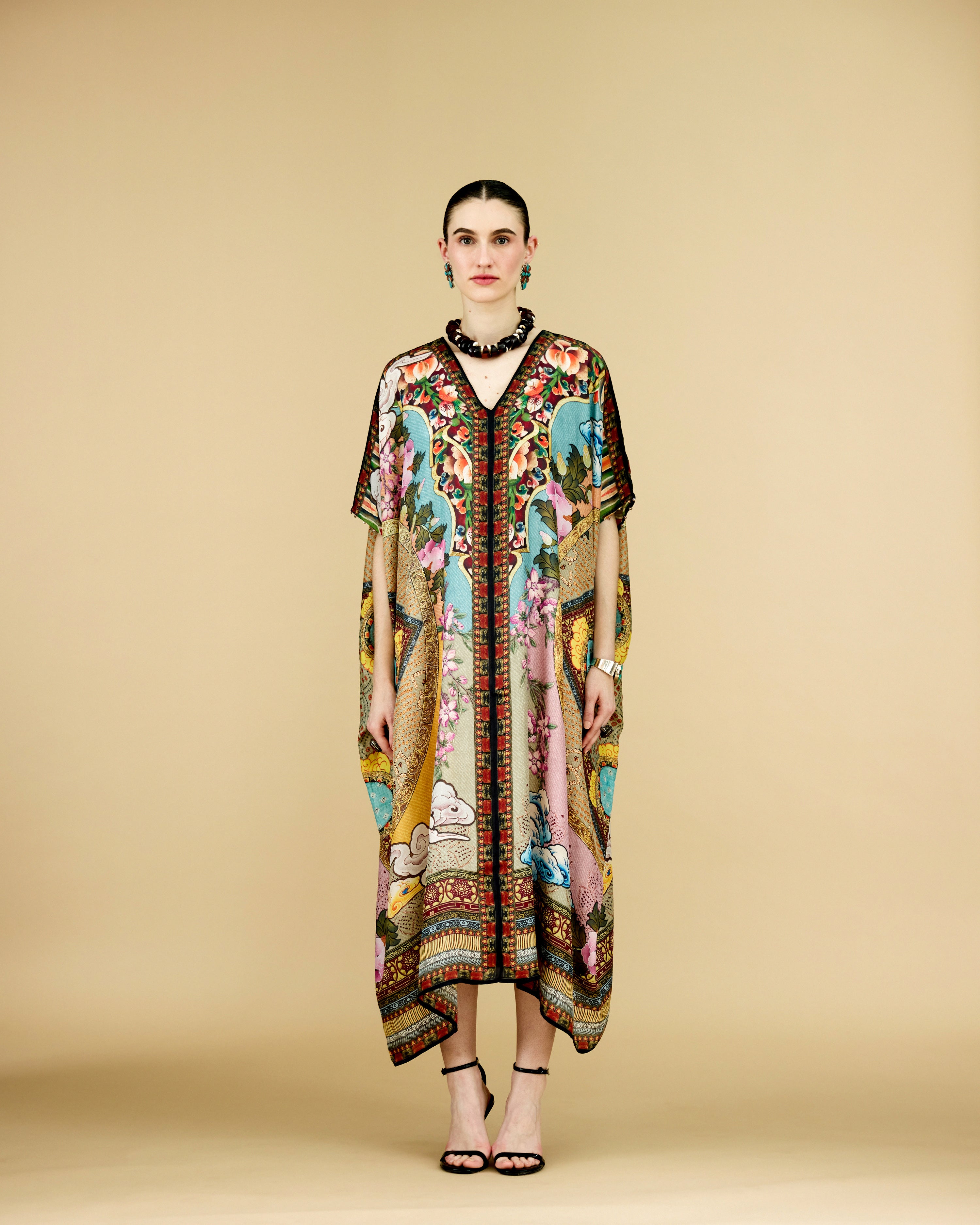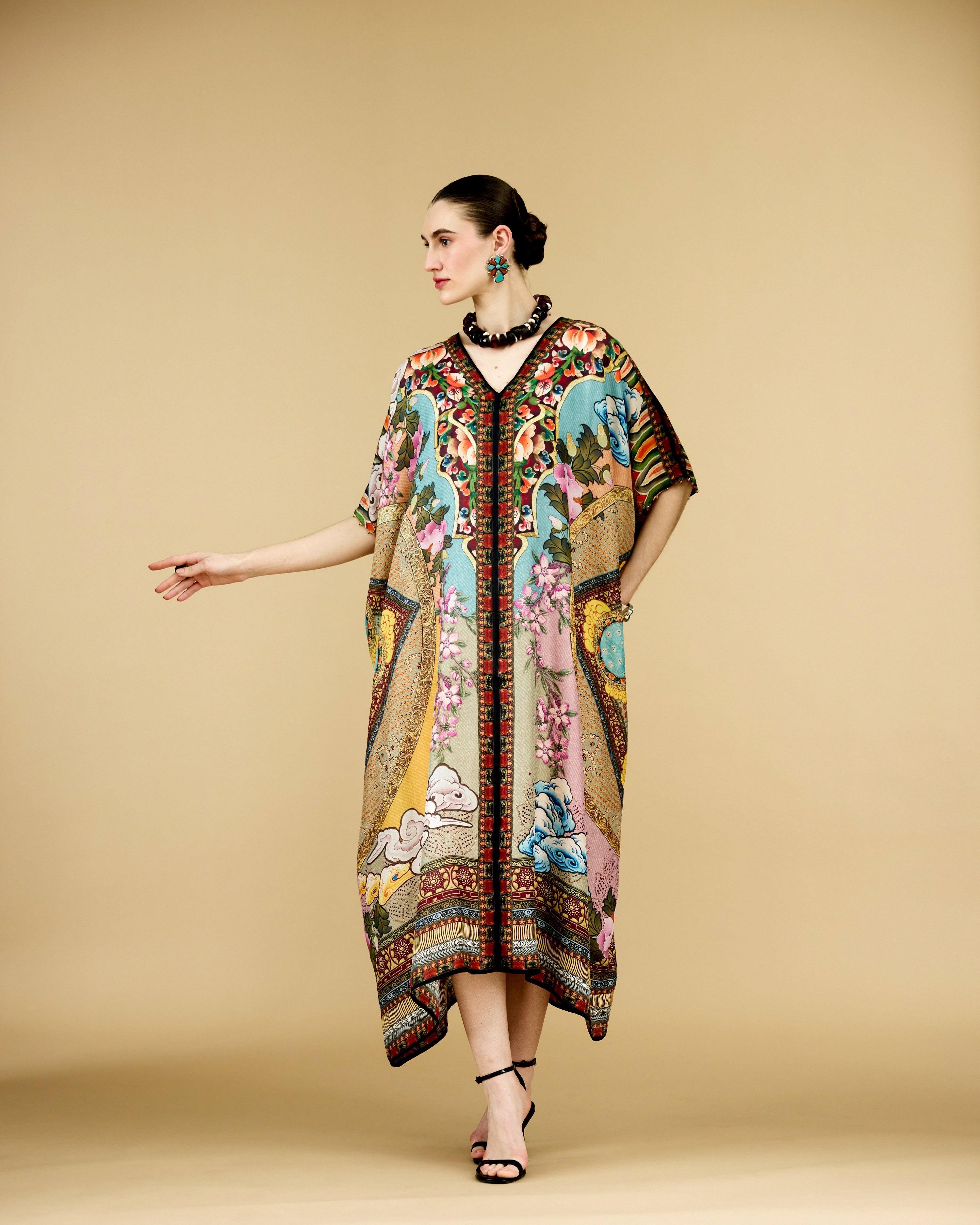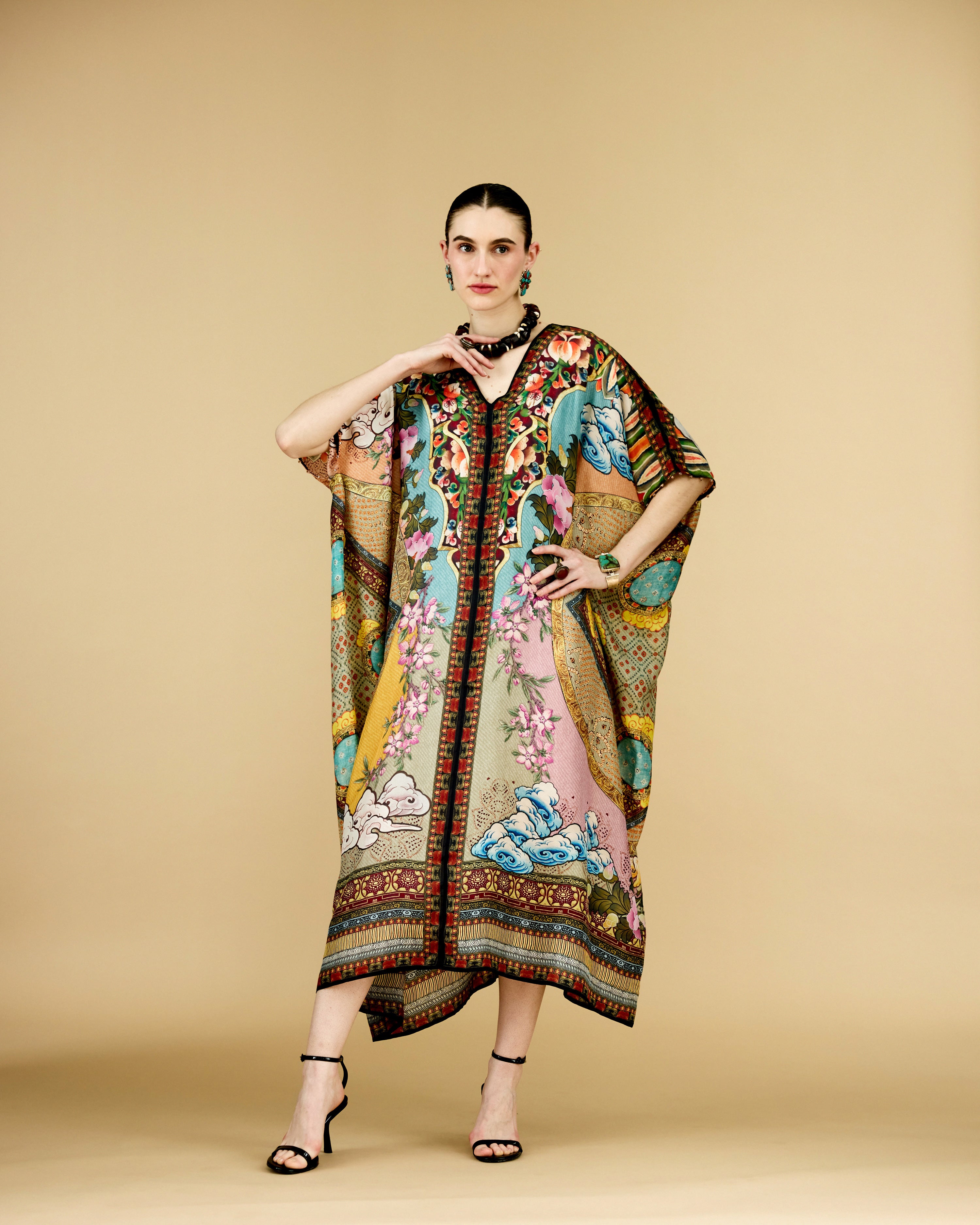 A 'V' neck draped kaftan printed on our soft buttery silk.