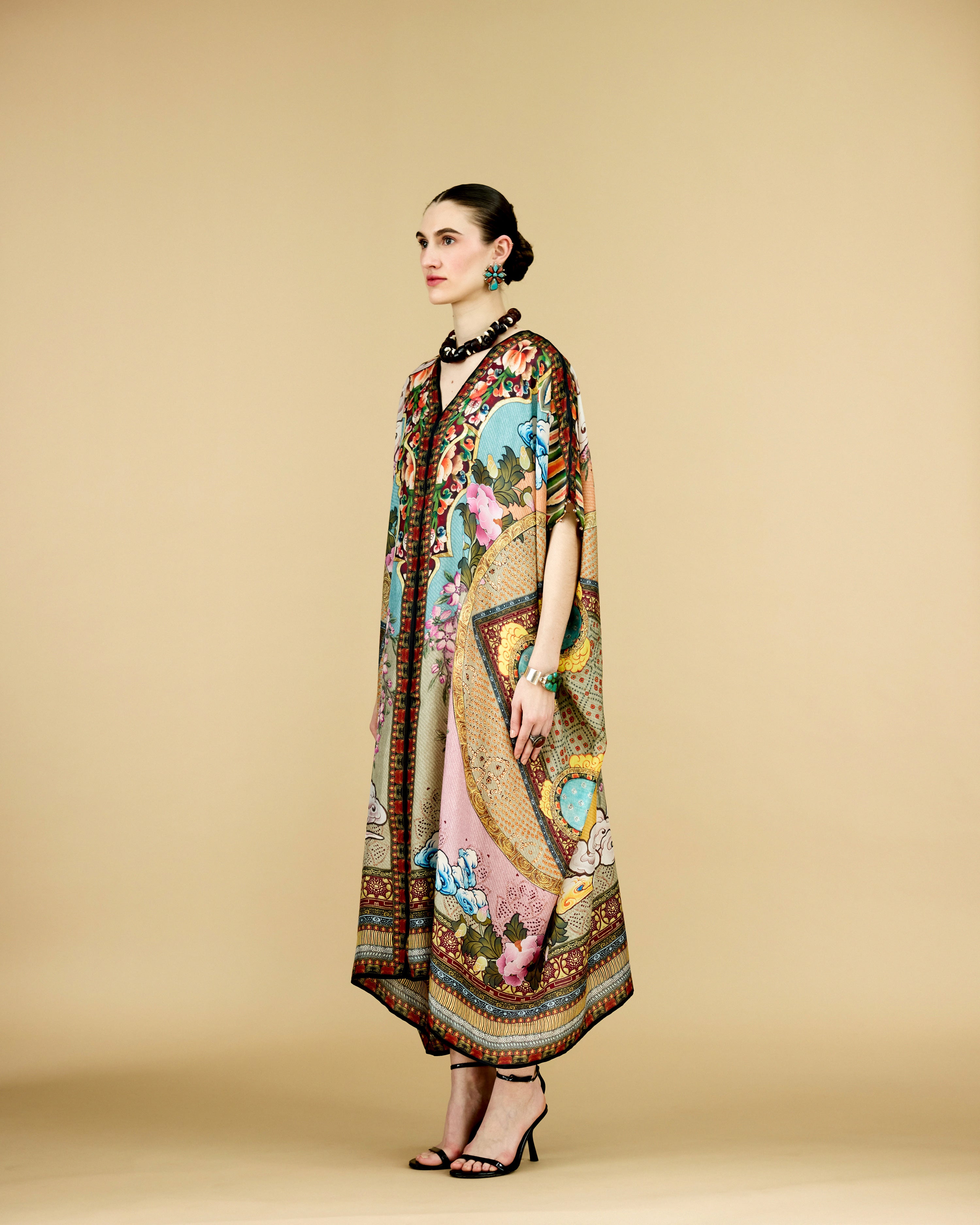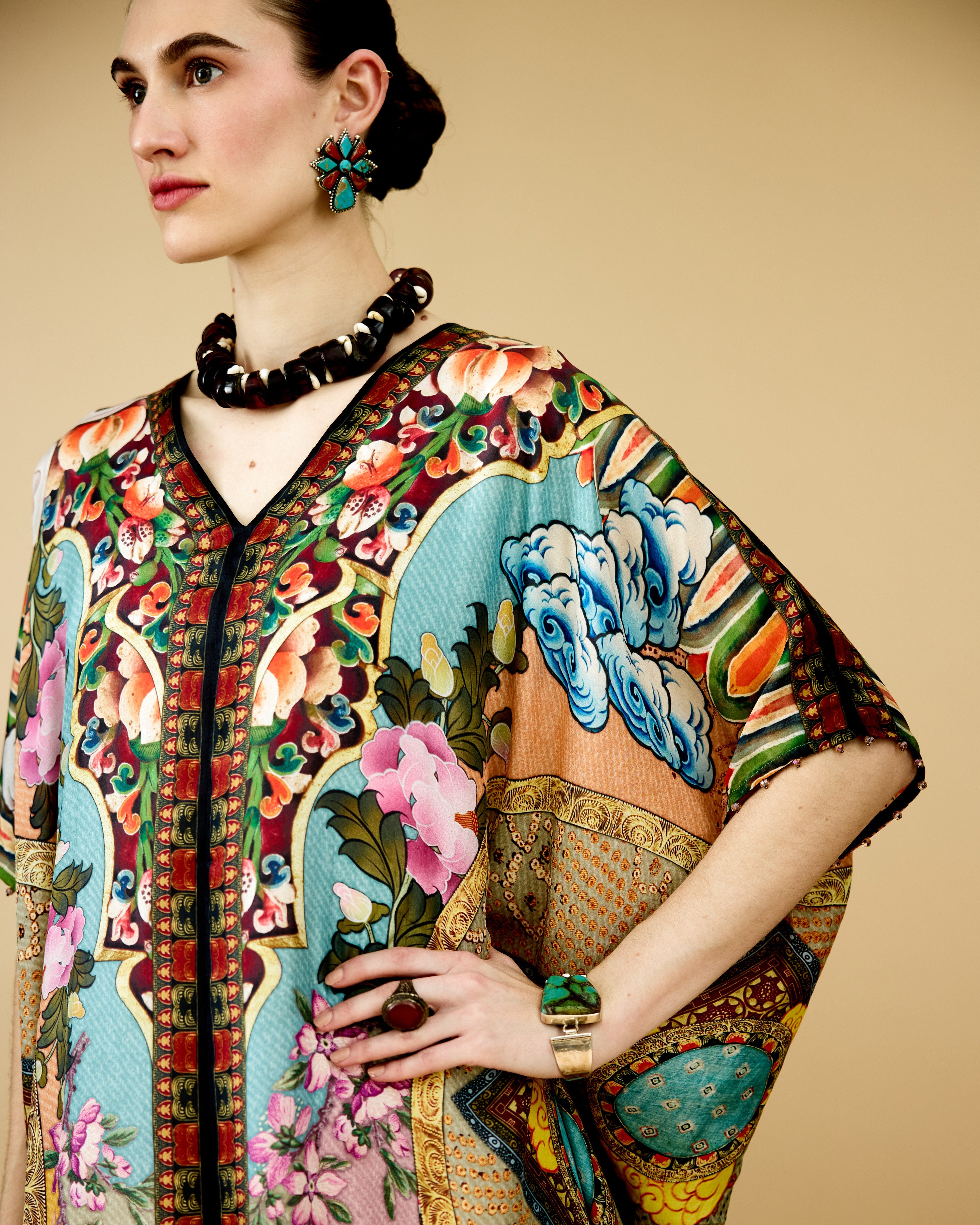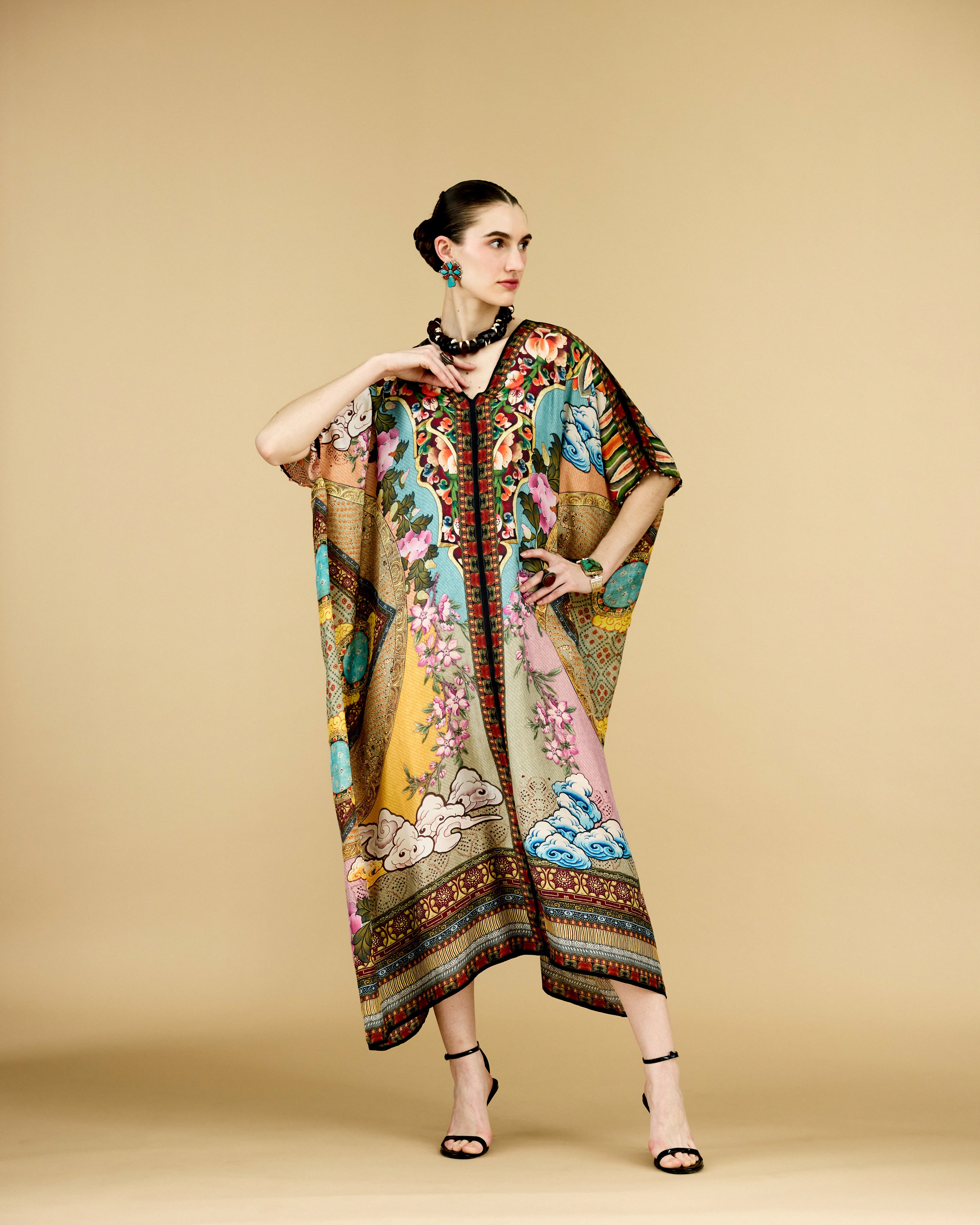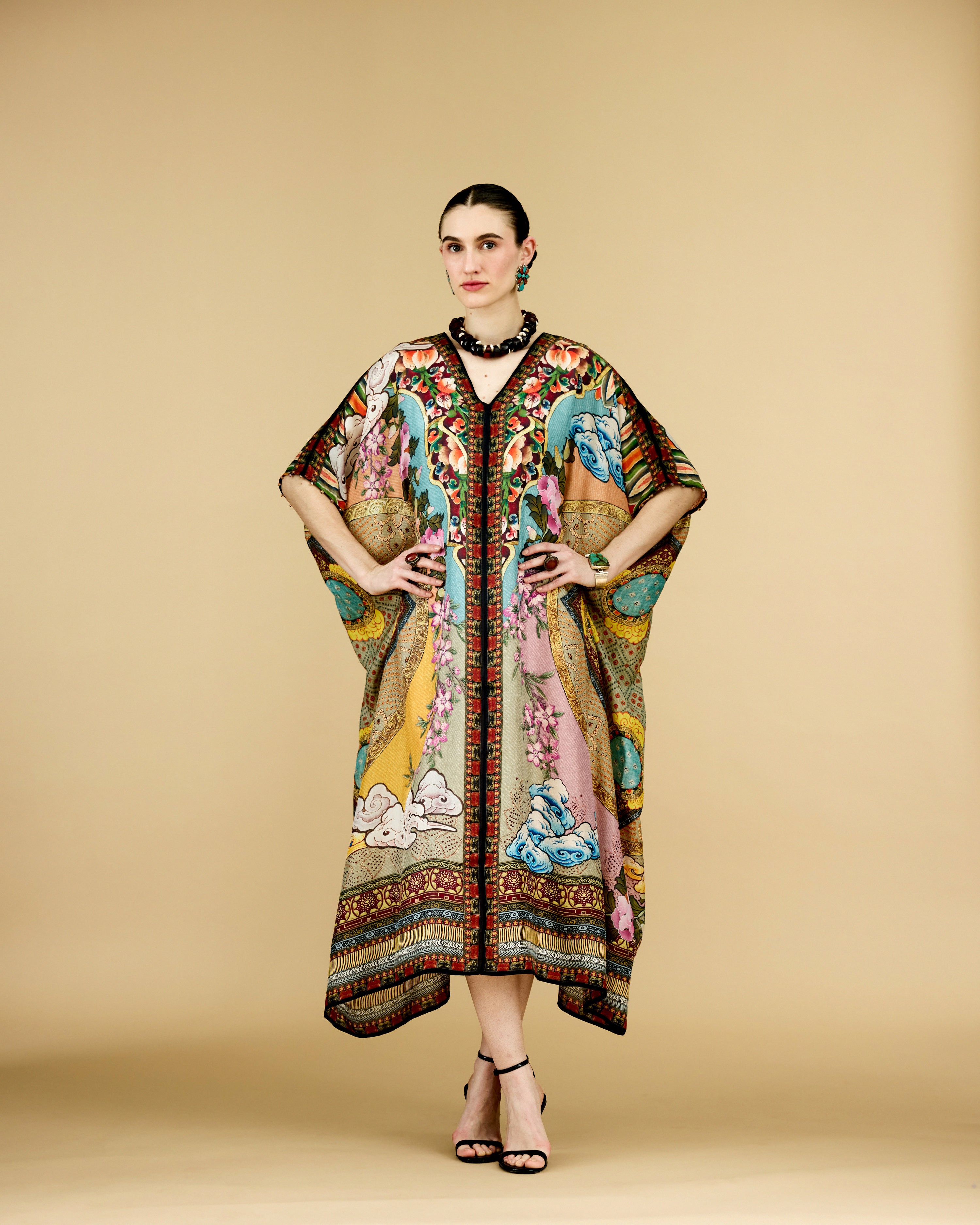 A 'V' neck draped kaftan printed on our soft buttery silk.