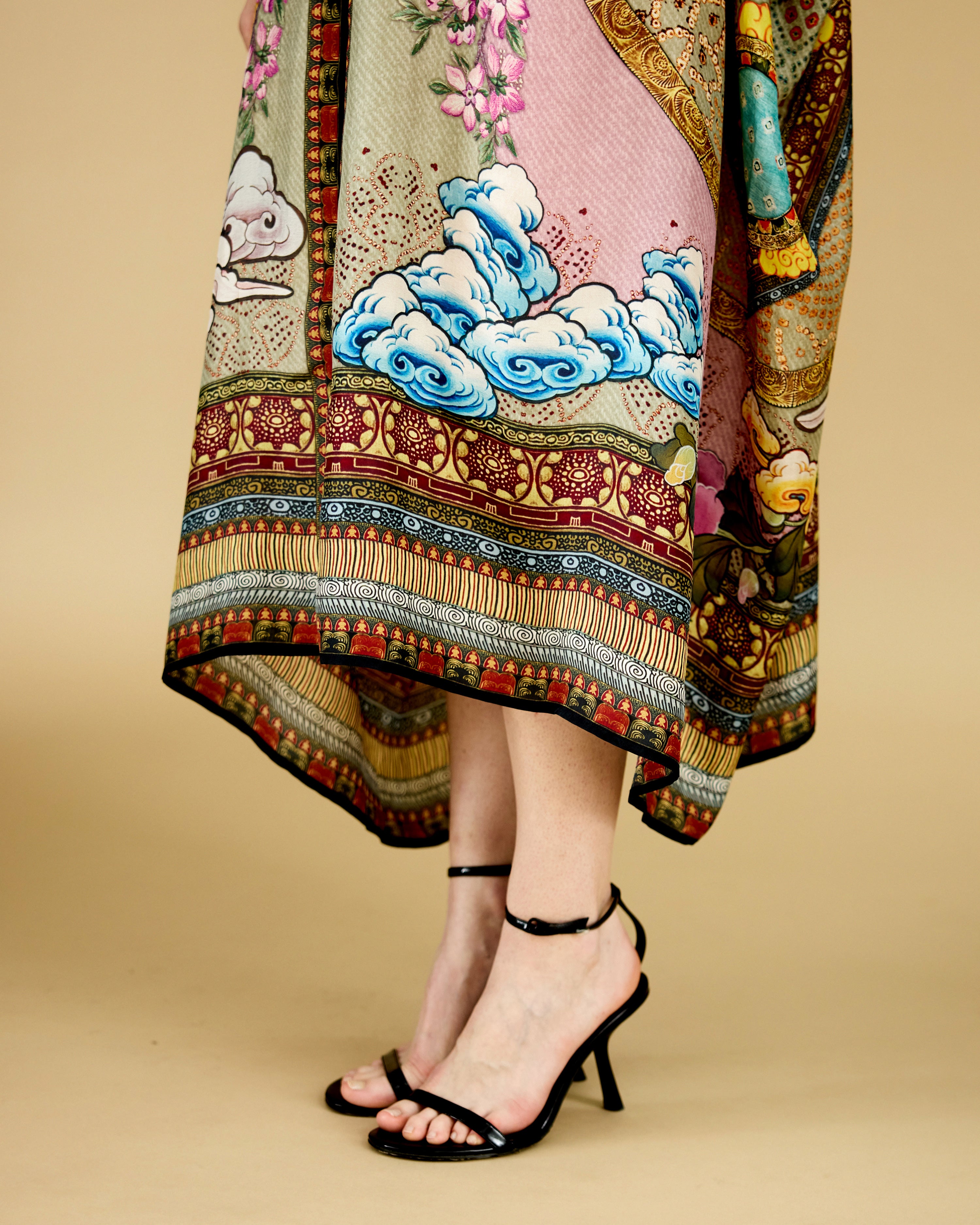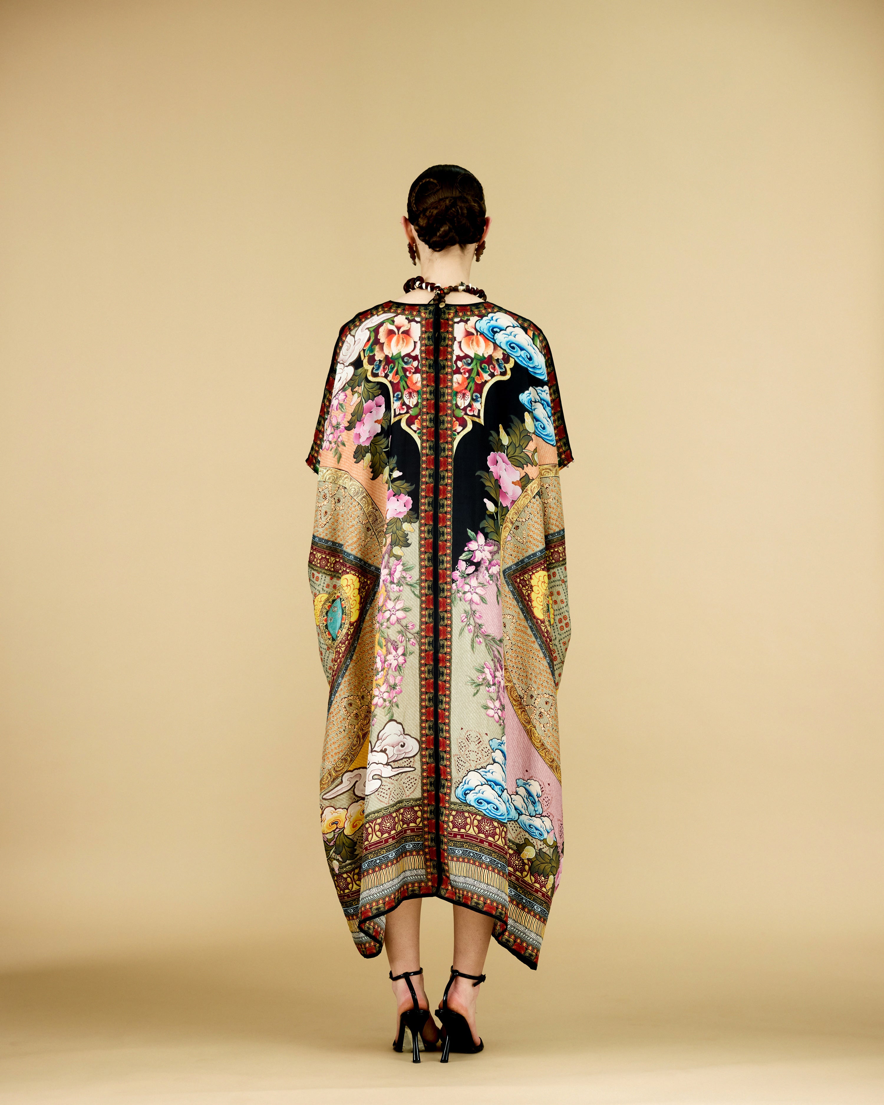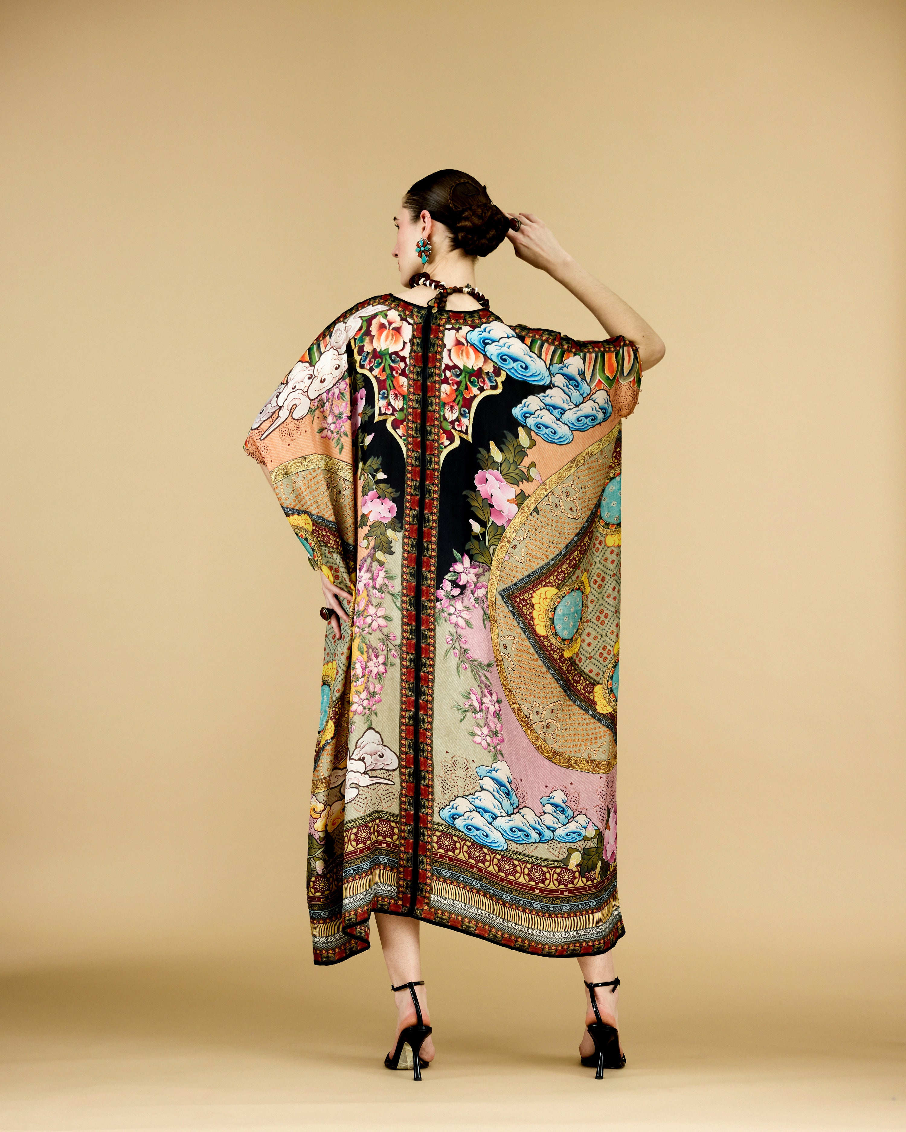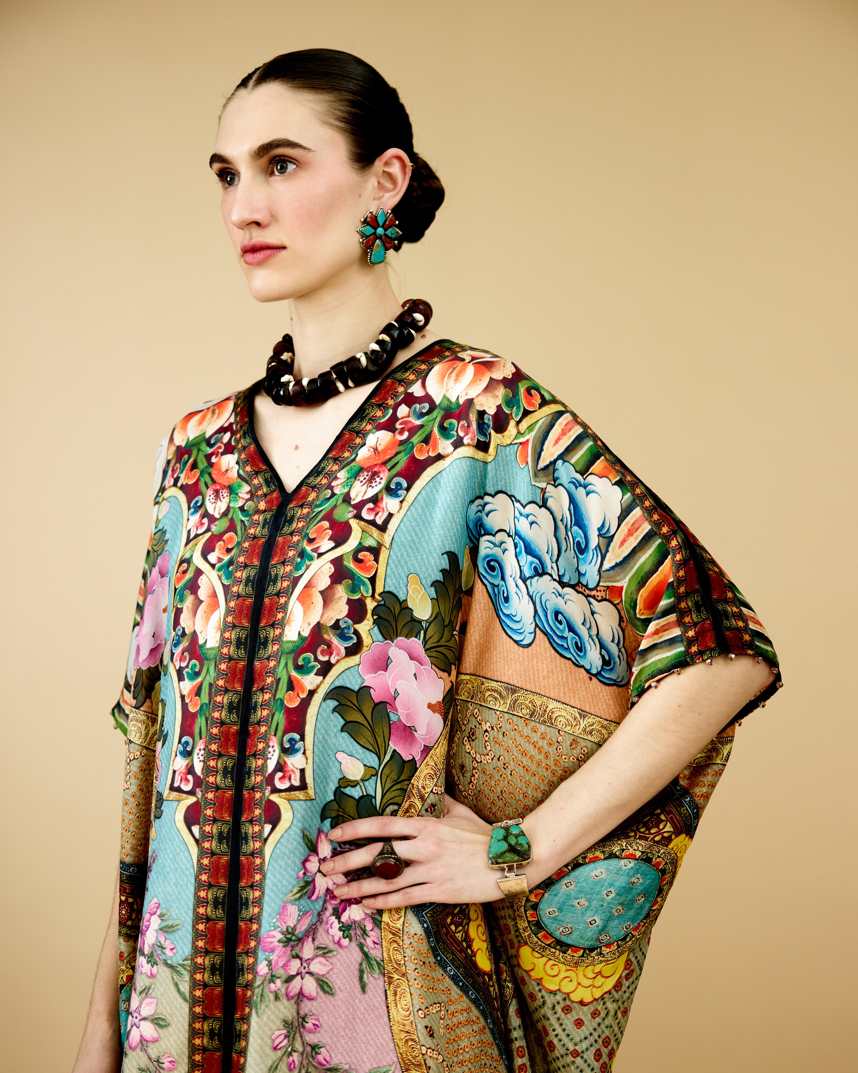 A 'V' neck draped kaftan printed on our soft buttery silk.