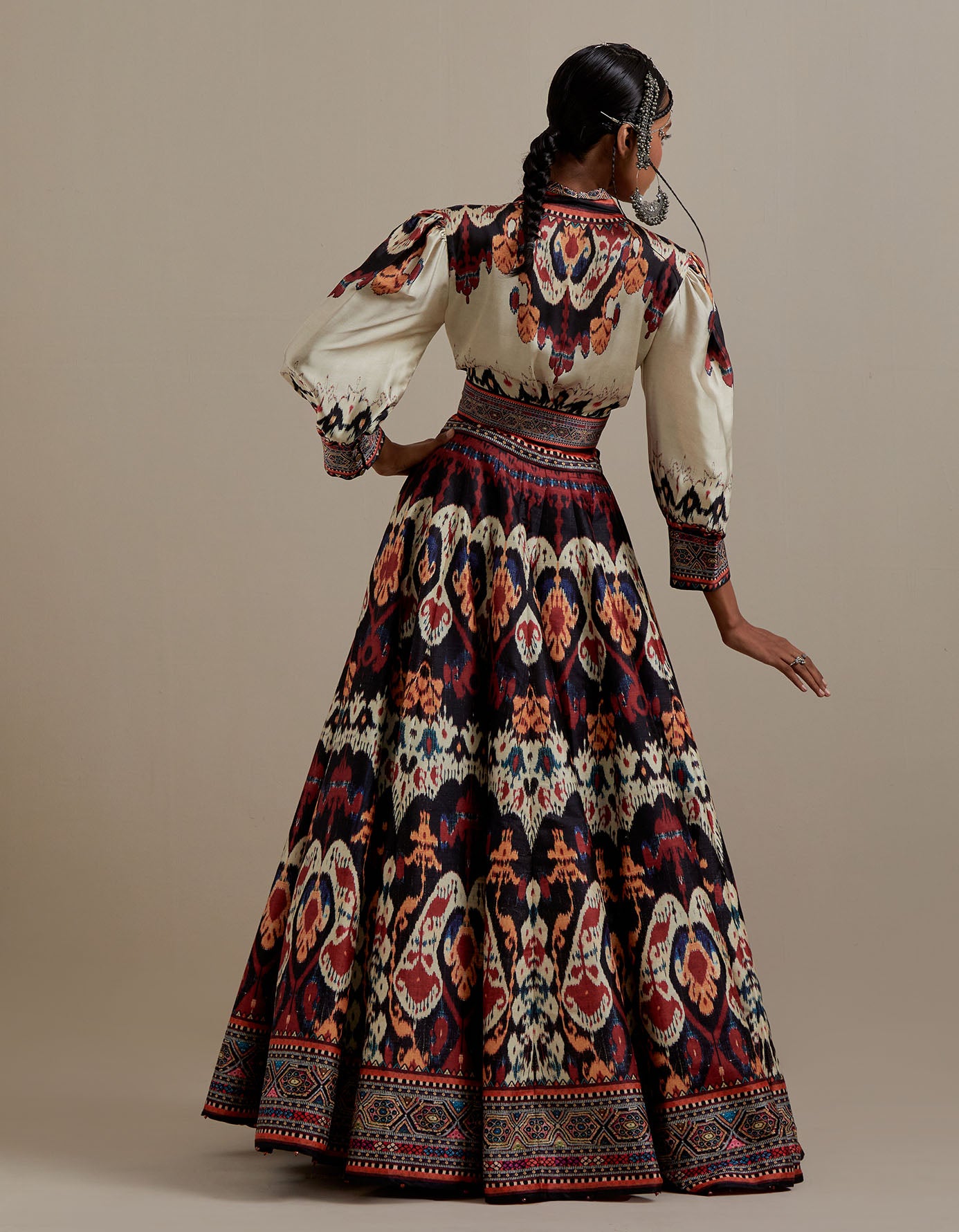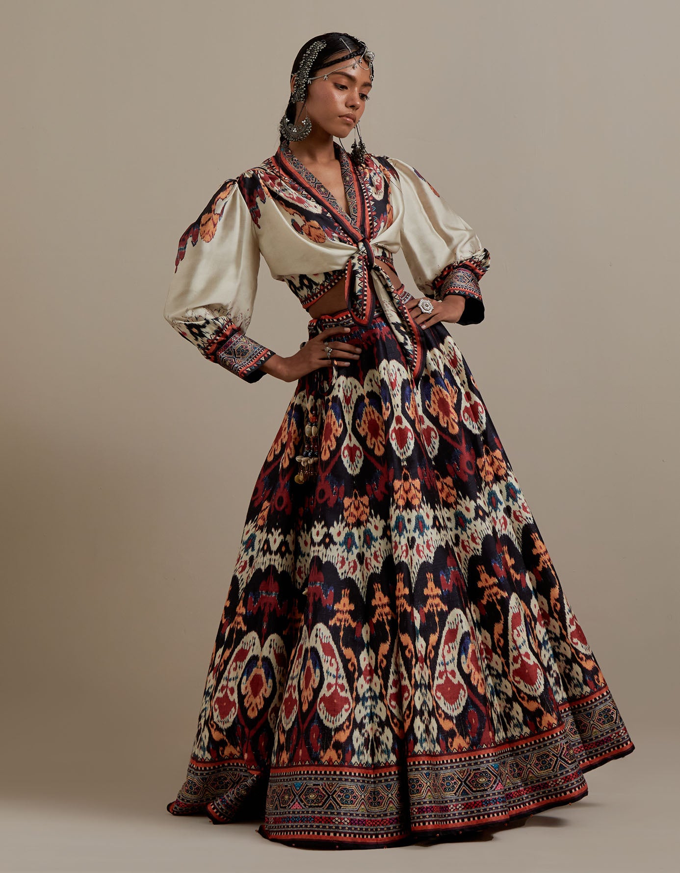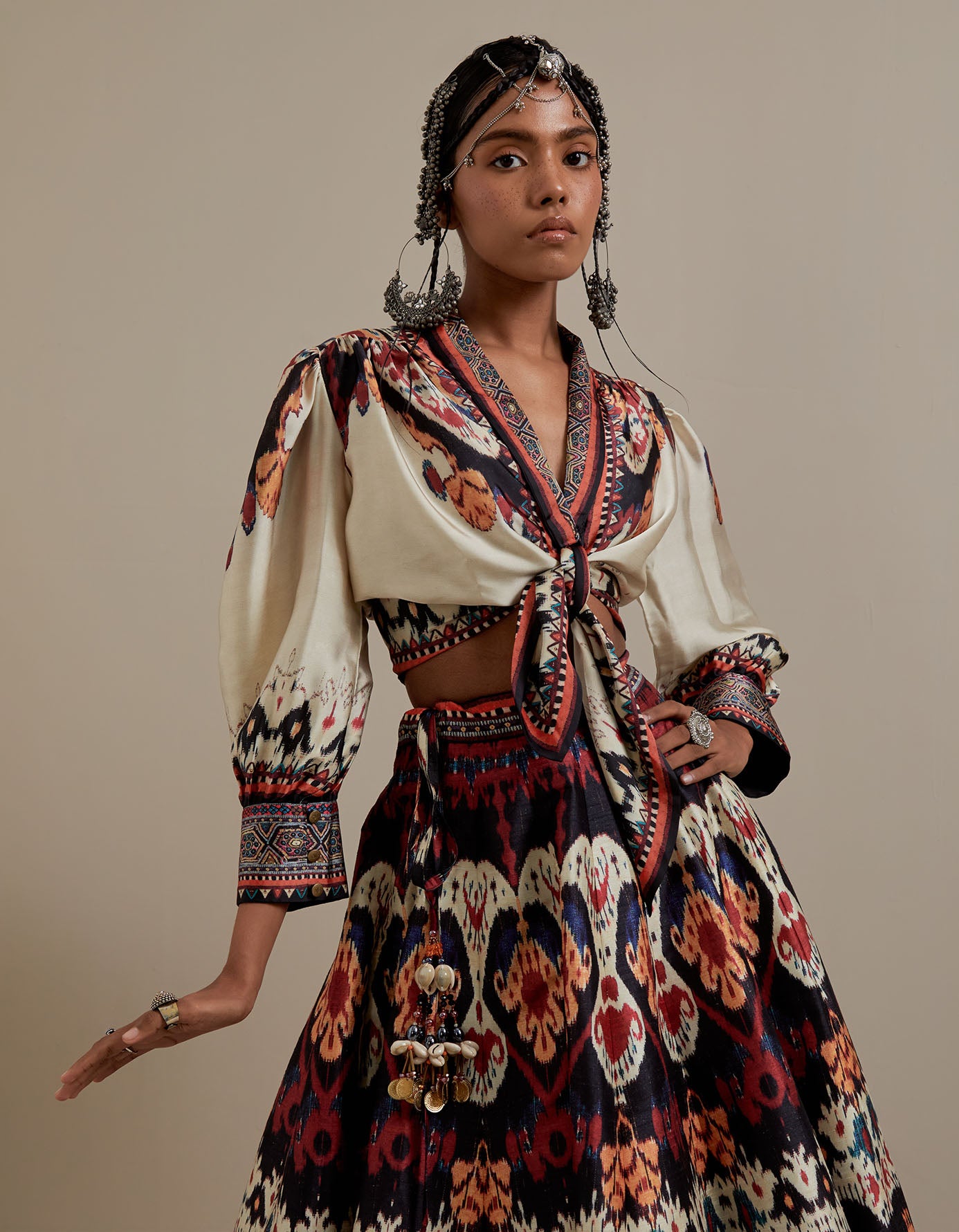The Skirt is a printed skirt with lining and cancan, the waist band with adjustable drawstring embellished in beautiful coordinating tassels with glass beads.