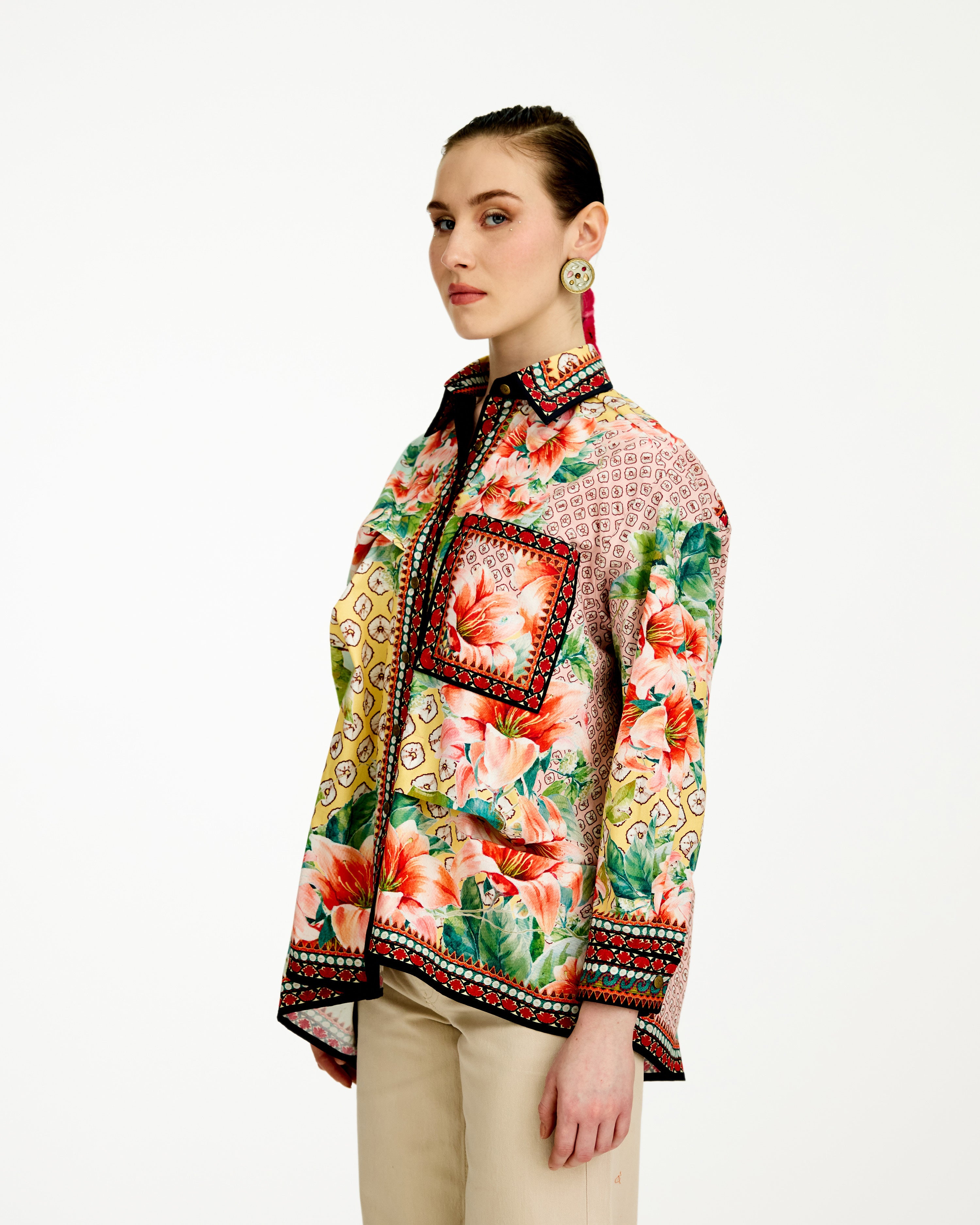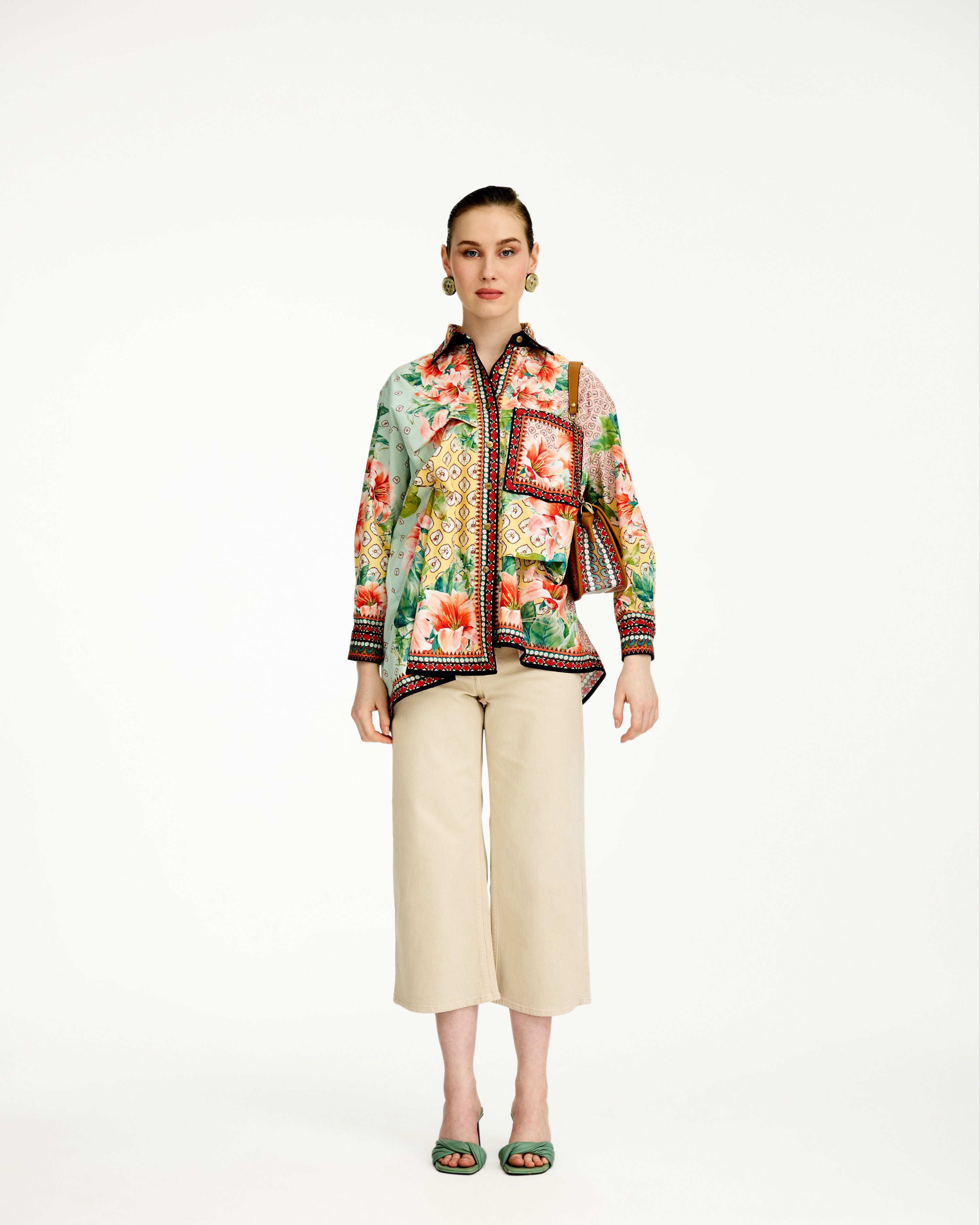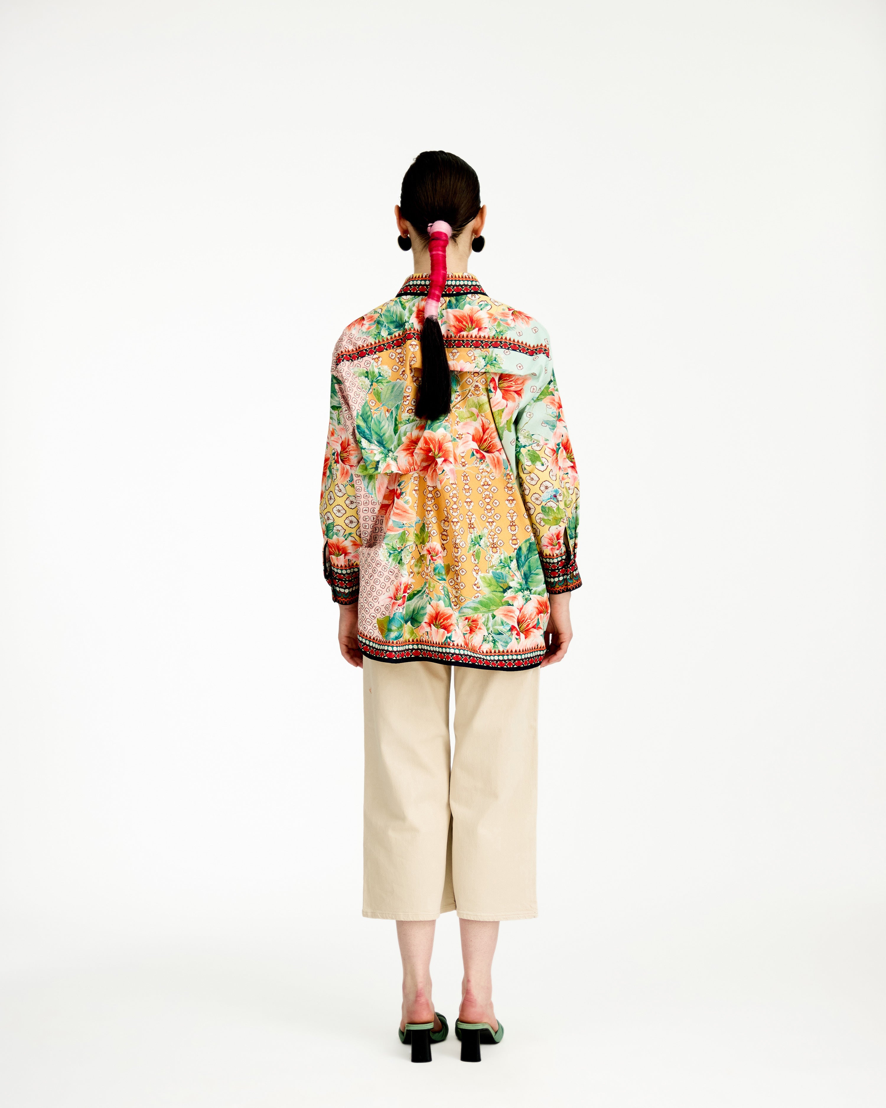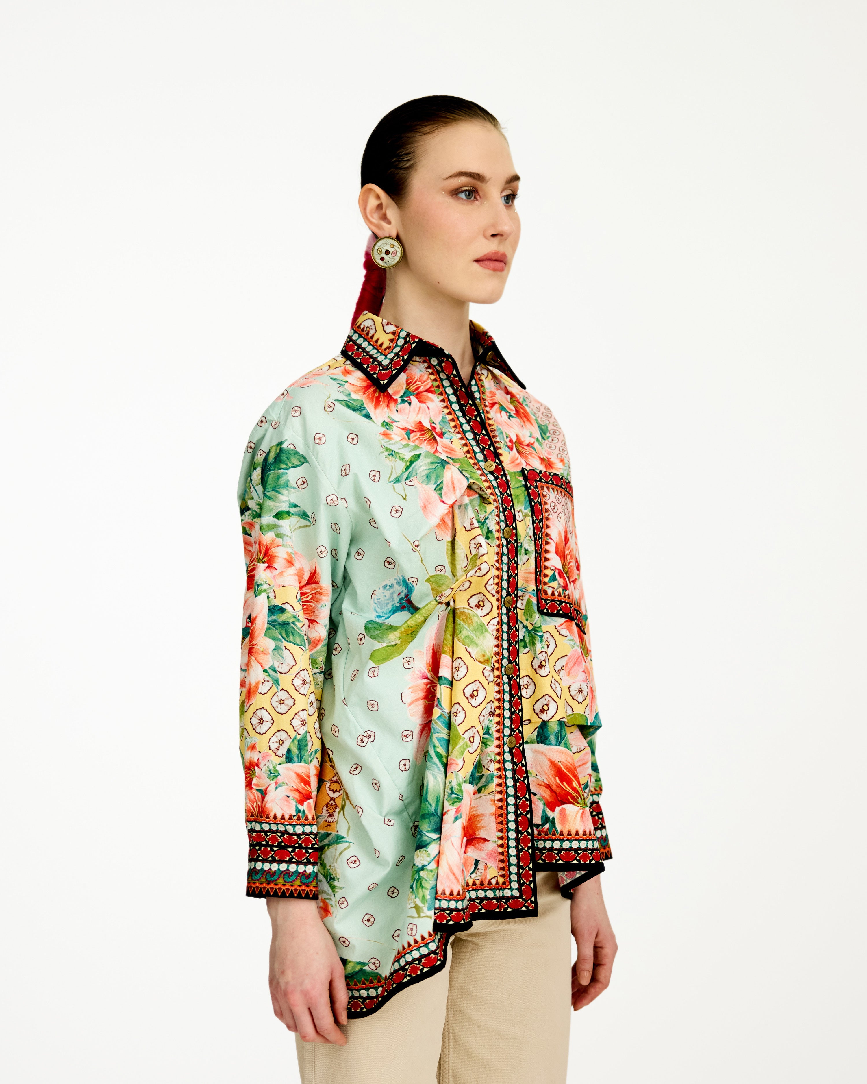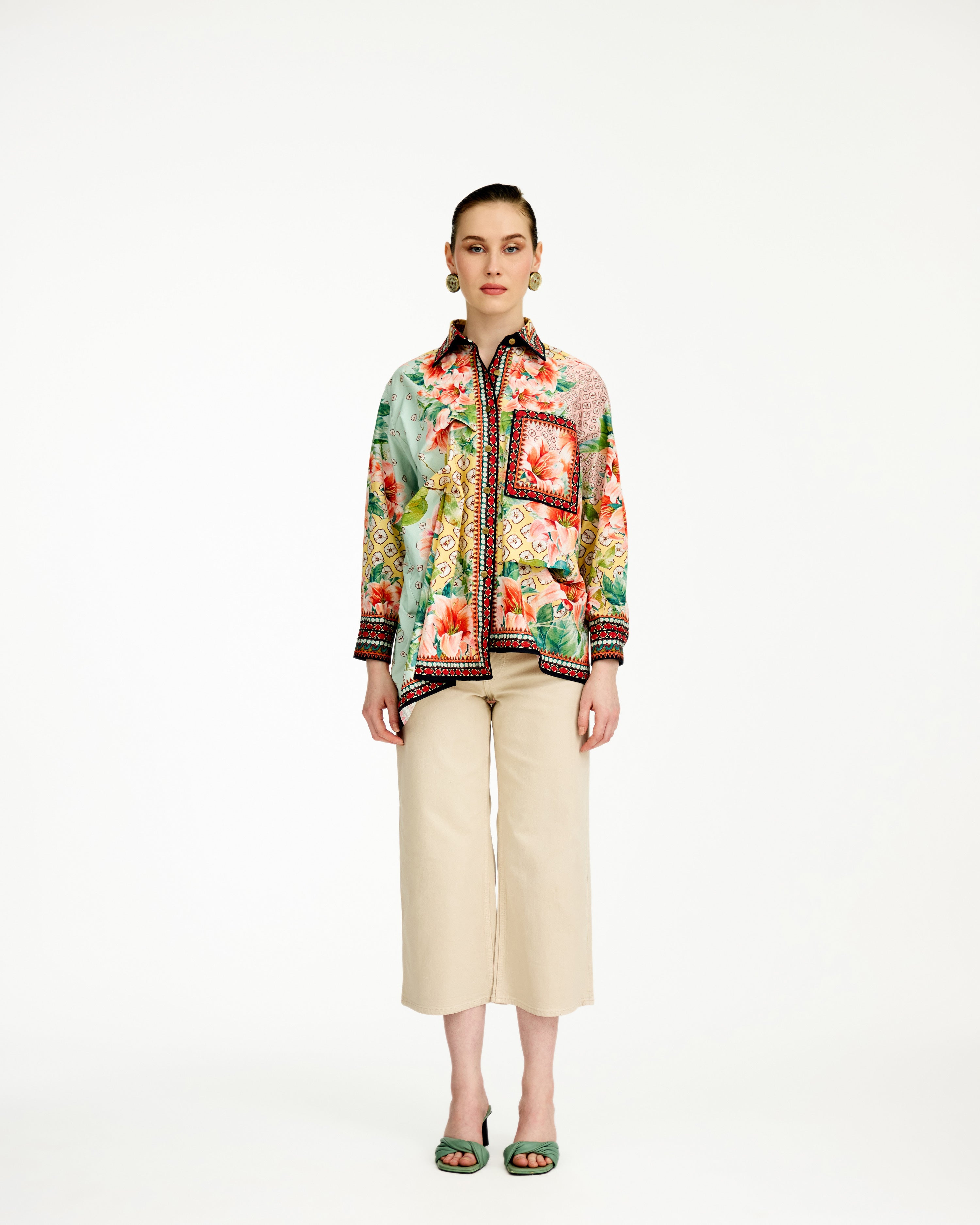 The Asiya assymetric front shirt has a collar and full sleeves with a cuff closure.